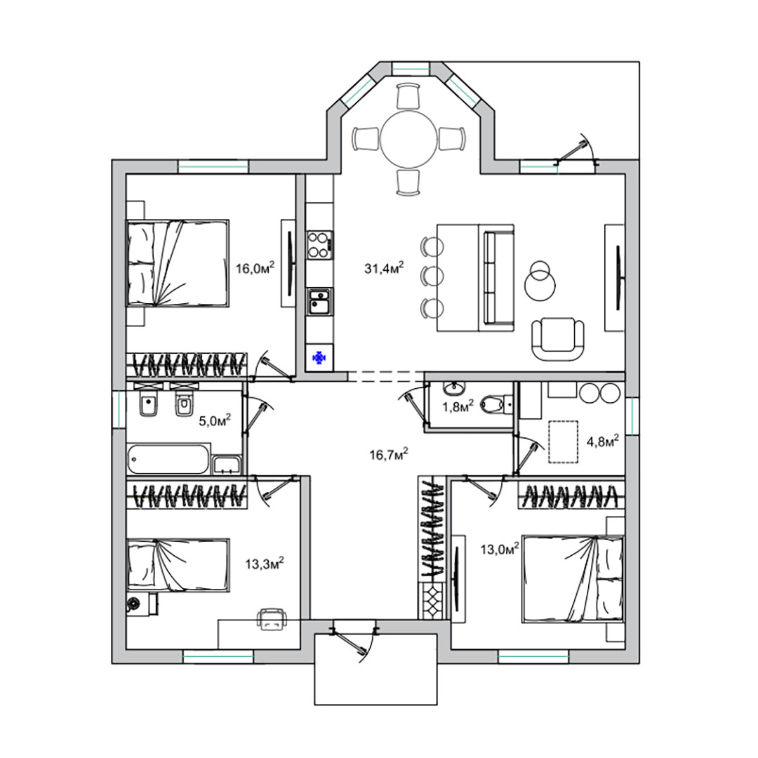 Просторная кухня гостиная с эркером площадью 32 кв.м выделена зона кухни, обеденная зона и зона отдыха для всей семьи, с выходом на задний двор. Три изолированные комнаты, правильной квадратной формы, две комнаты по 13 кв.м, одна 16 кв.м. По проекту в доме 2 санузла в плитке пол и стены. Оборудованная котельная. Для отделки используются только качественные стройматериалы.