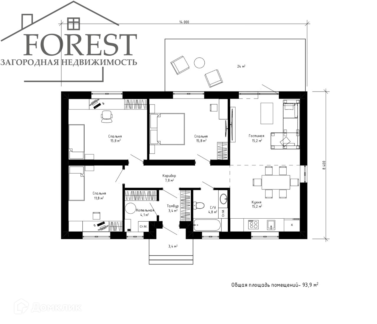 светлая кухня -гостиная с выходом на террасу, 30м2 3 спальни по 15,8 и 11,8 м2 сан.узел 4,8м2 котельная 4,1м2 просторный коридор 7,8м2 тамбур 3,4м2 высота потолков 2,8 м