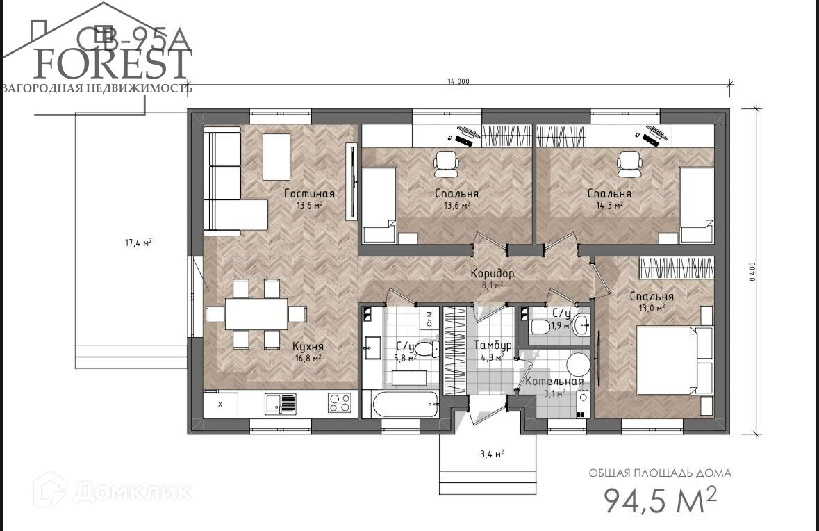 Спальня - 13 м2 Спальня - 13,6 м2Спальня - 14,3 м2Кухня-гостиная - 30,4 м2Тамбур - 4,3 м2 Котельная - 3,1 м2Санузел - 5,8 м2 Санузел - 1,9 м2