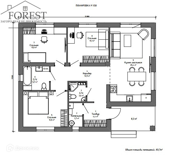 Крыльцо - 8,3м2Тамбур - 4,4м2Котельная - 3,7м2Санузел - 3,6м2Коридор - 12,9м2Спальня - 12,5м2Санузел - 5,7м2Спальня - 11,8м2Спальня - 11,1м2Кухня-гостиная - 25,4м2