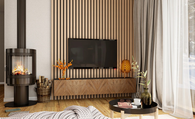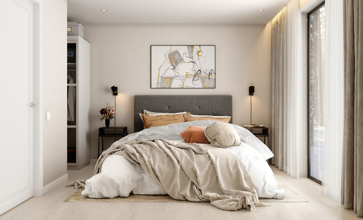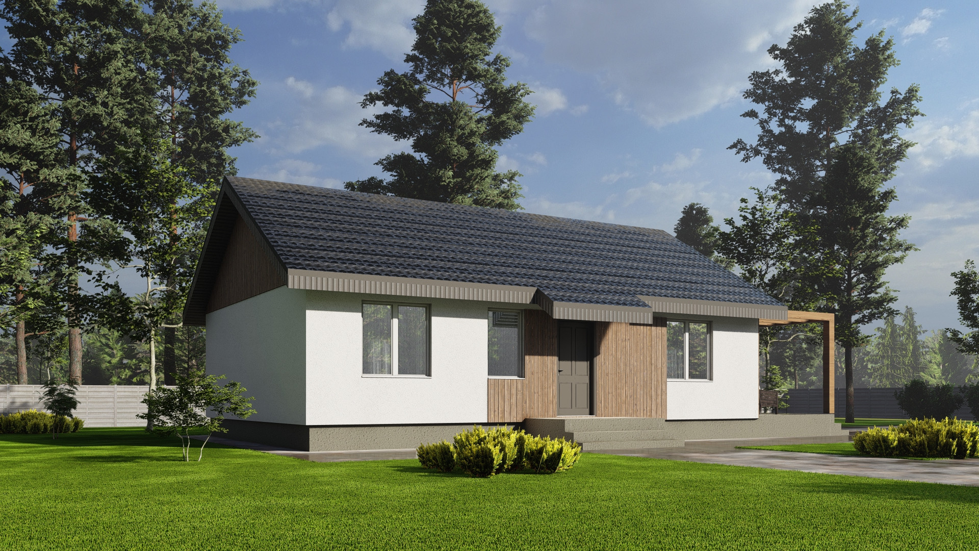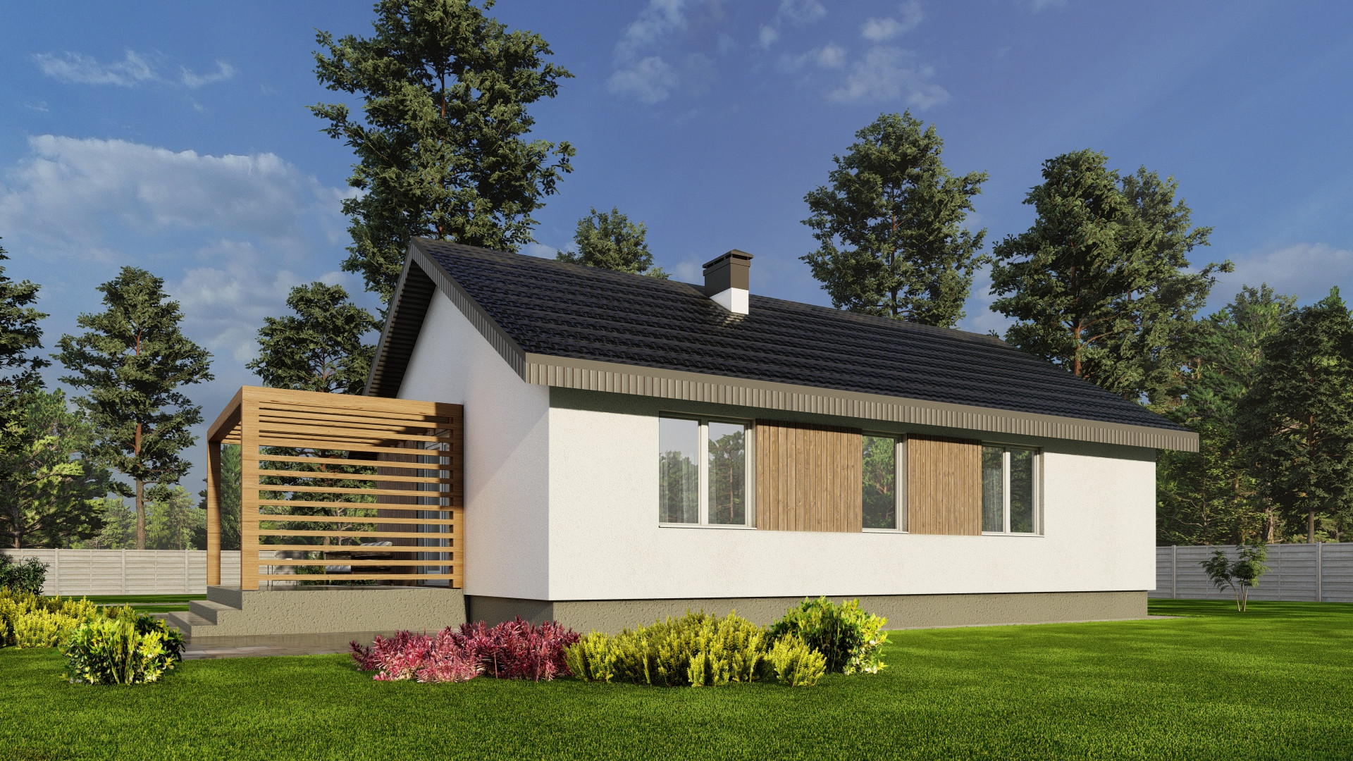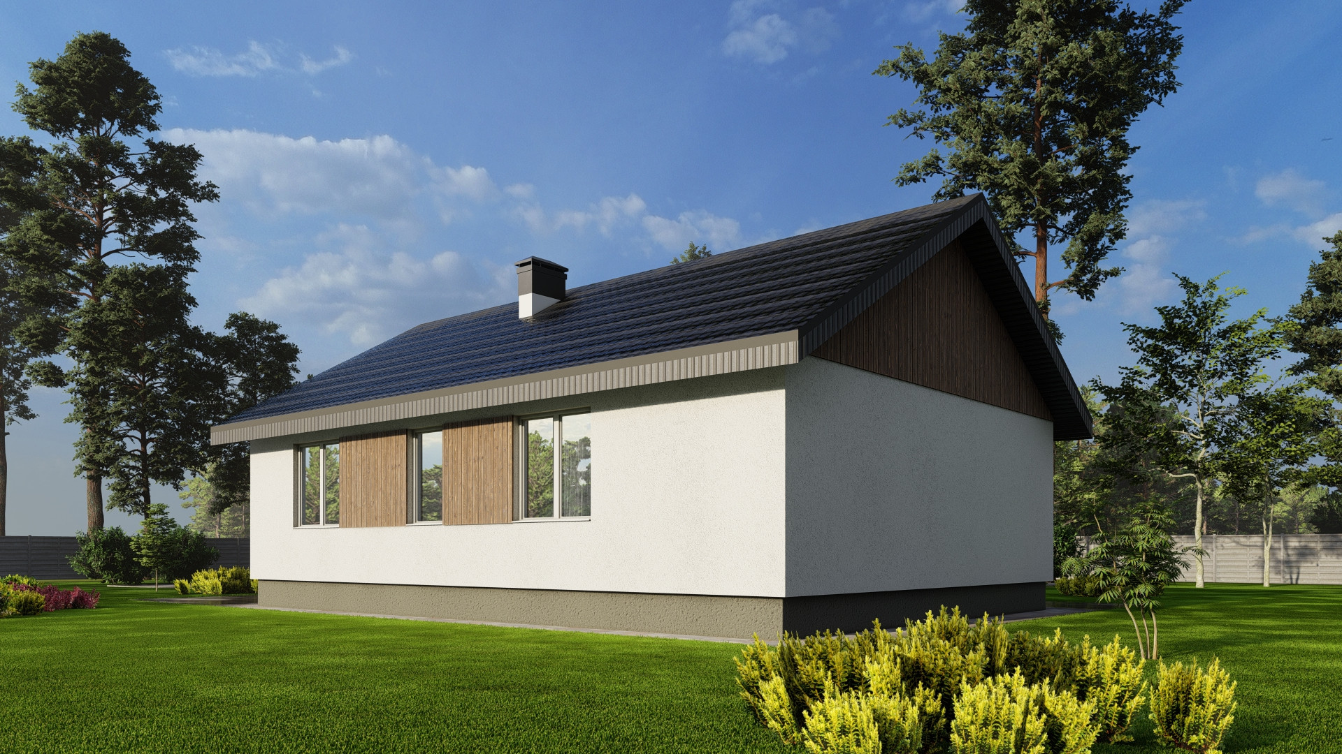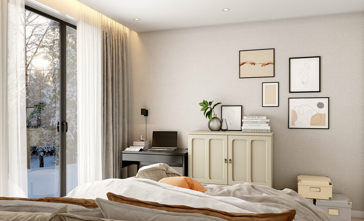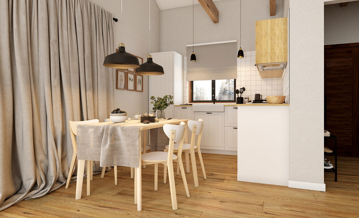 Планировка дома включает в себя просторную кухню-гостиную с панорамным остеклением, высокими потолками и выходом на террасу, две просторные комнаты, одна из которых мастер-спальня со своим гардеробом, ванную комнату и гостевой санузел, бойлерную комнату и коридор. Высота потолков 3 м.