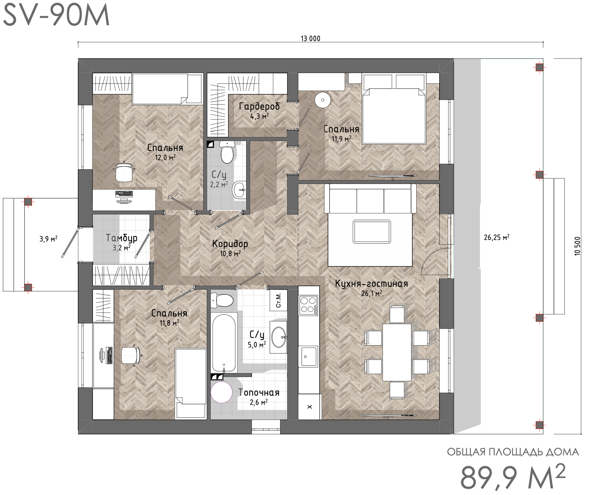 - Общая площадь: 90 кв. м.