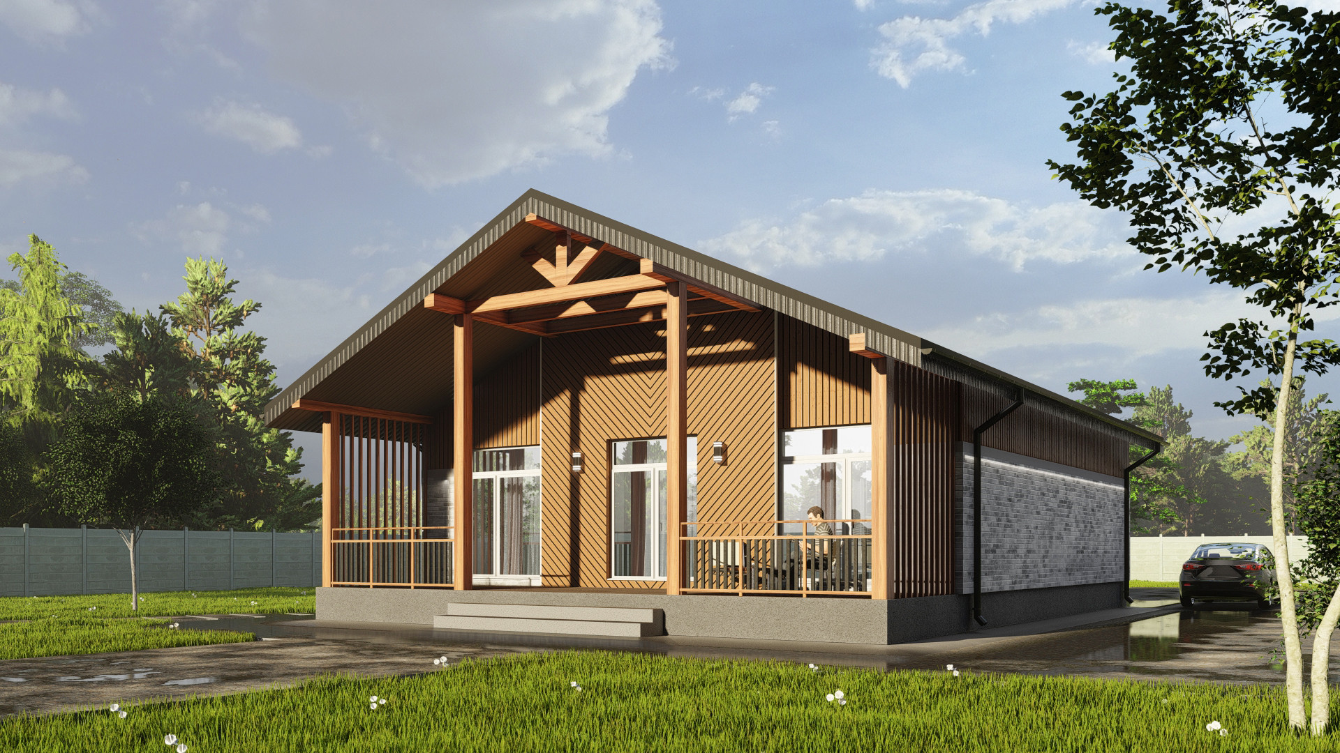 Планировка дома включает в себя просторную кухню-гостиную с панорамным остеклением, высокими потолками и выходом на террасу, три просторные комнаты, ванную комнату и гостевой санузел, бойлерную комнату и коридор. Высота потолков 3 м., двойной свет в кухне-гостиной 4,5м.