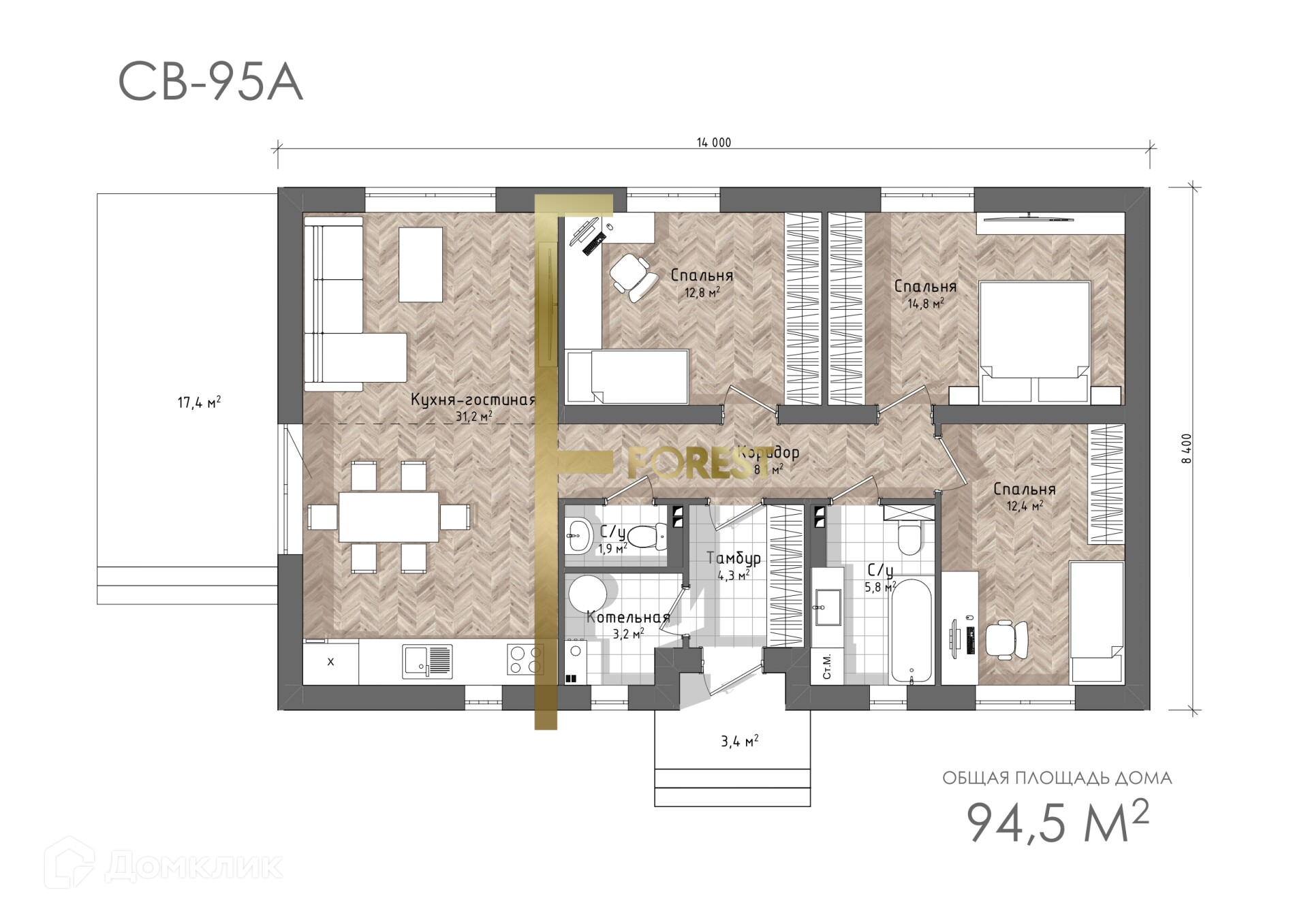 Спальня - 13 м2 Спальня - 13,6 м2Спальня - 14,3 м2Кухня-гостиная - 30,4 м2Тамбур - 4,3 м2 Котельная - 3,1 м2Санузел - 5,8 м2 Санузел - 1,9 м2