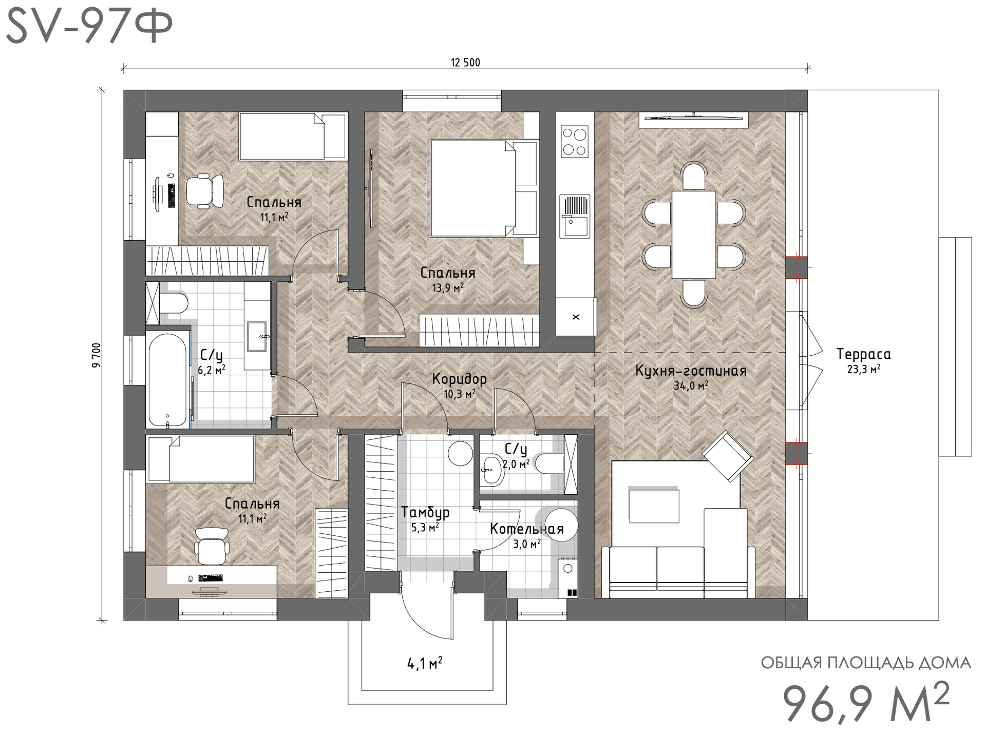 - Общая площадь: 96,9 кв. м.