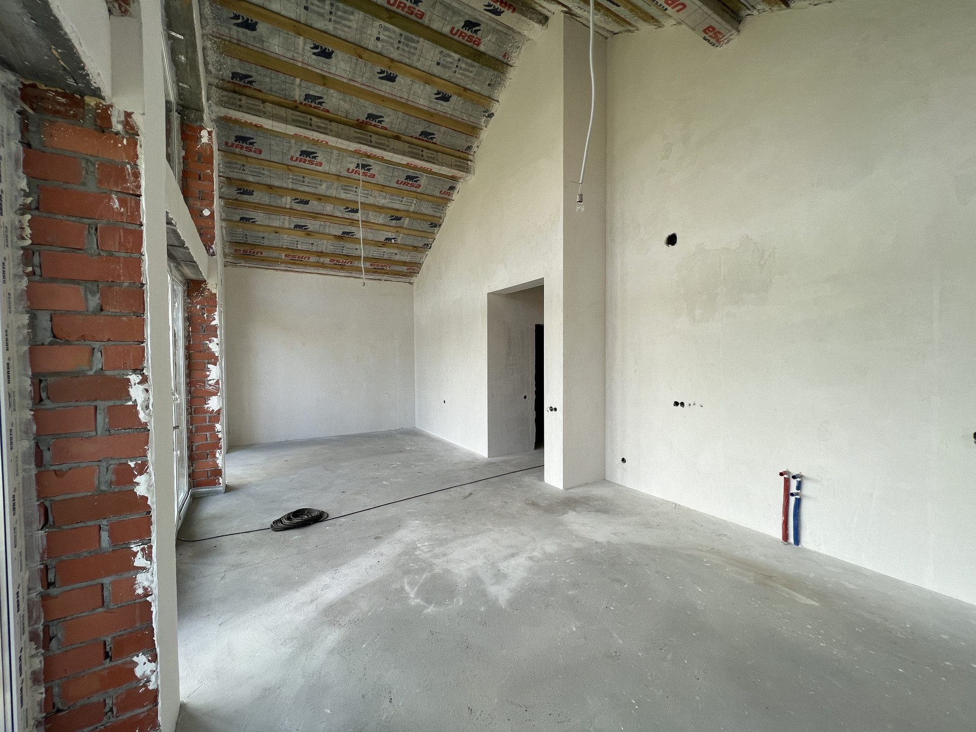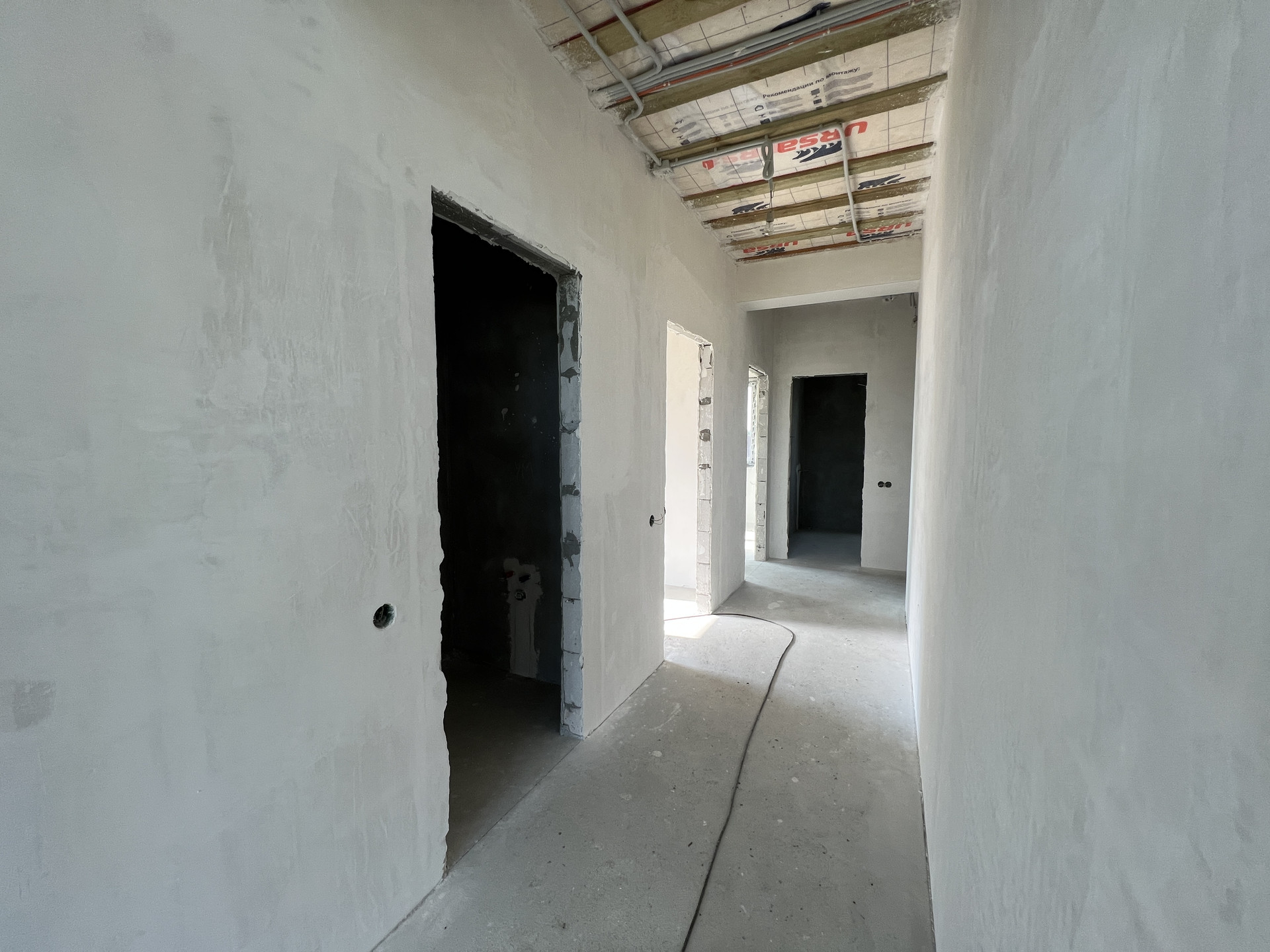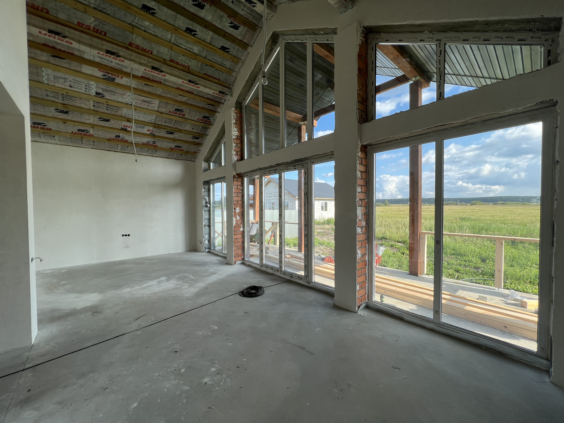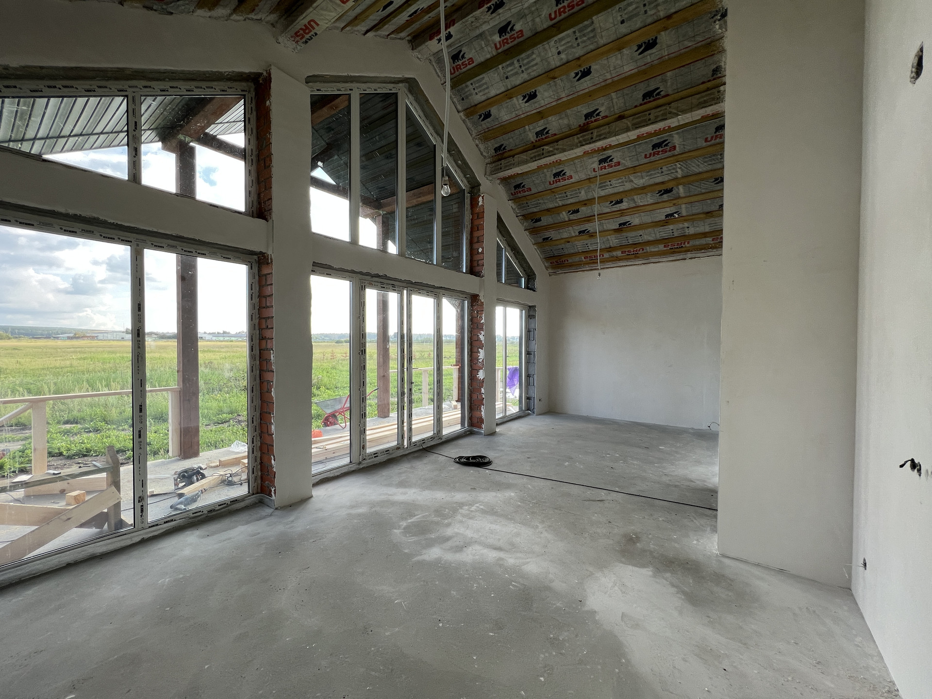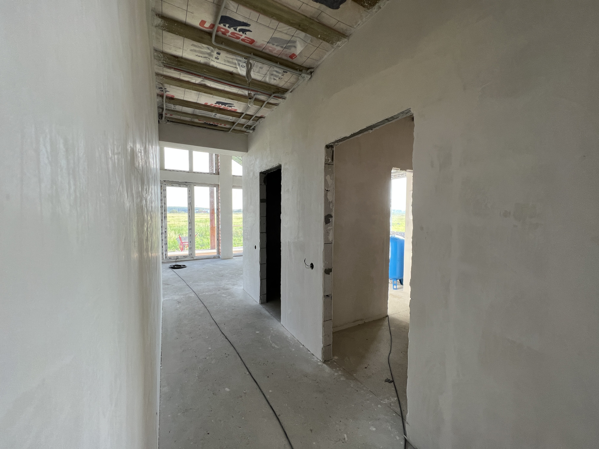 Планировка дома включает в себя просторную кухню-гостиную с панорамным остеклением, высокими потолками и выходом на террасу, три просторные комнаты, ванную, гостевой санузел, котельную и коридор. Высота потолков 3 м., двойной свет в кухне-гостиной 4,5м.