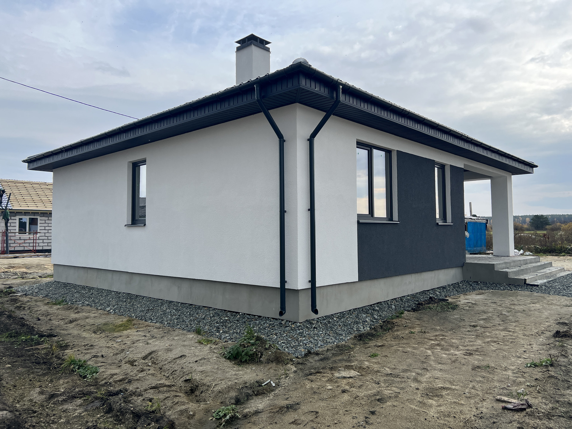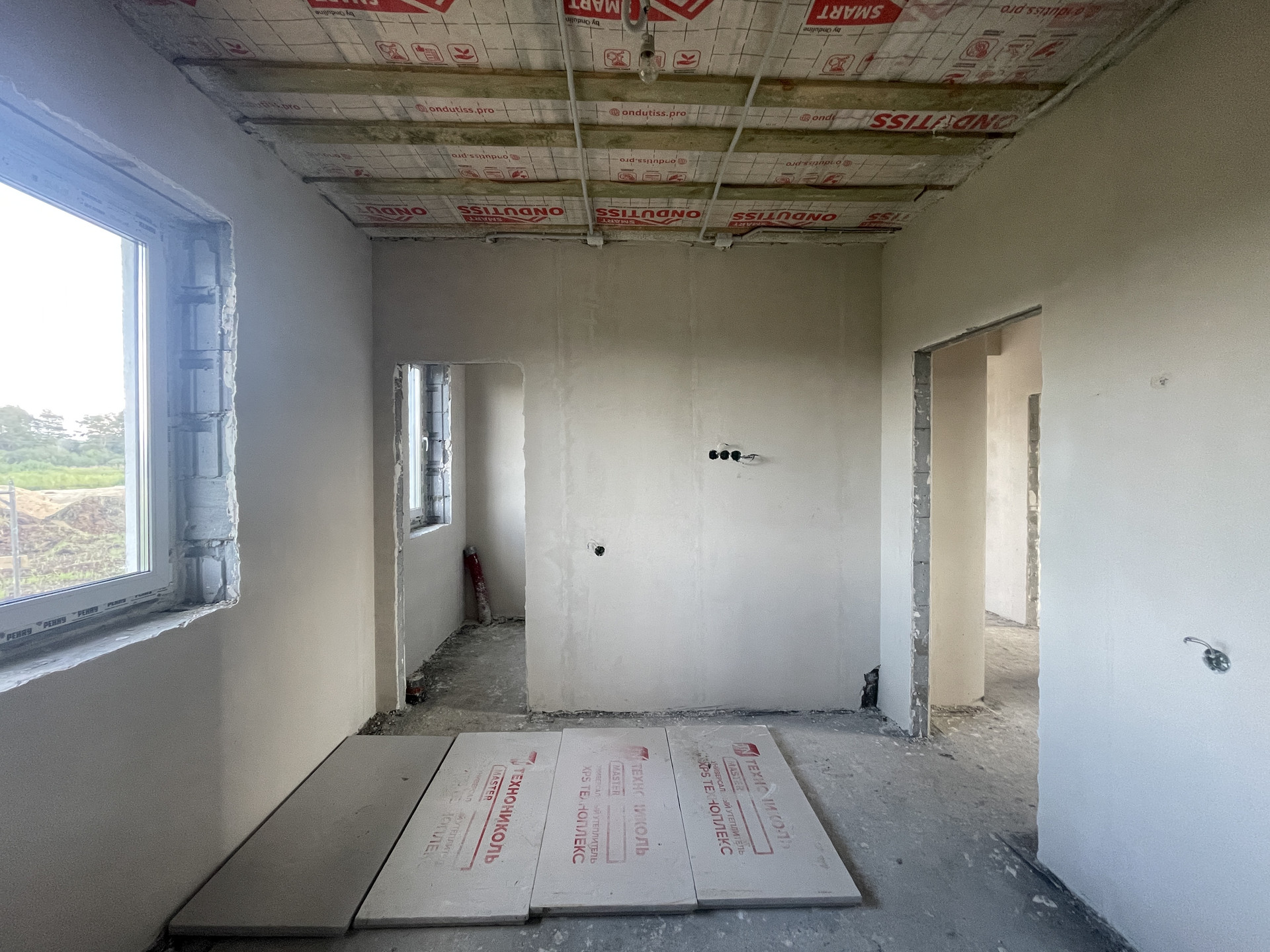Кровля - утеплитель крыши "КNАUF", толщина утепления 200 мм, покрытие мягкая кровля. Фасад - декоративная штукатурка и краска немецкой компании DЕRUFА, утепеление 100мм минеральной эковаты.
