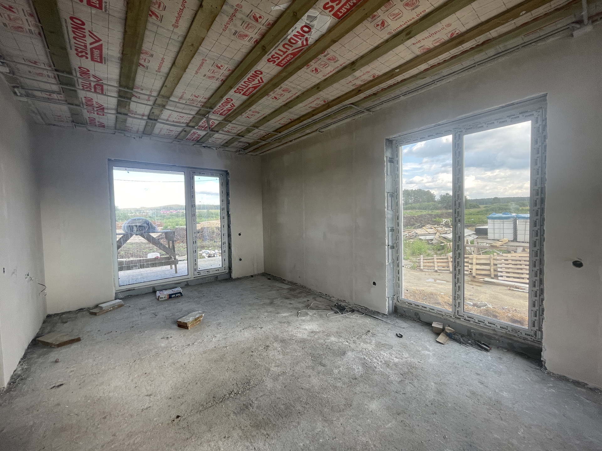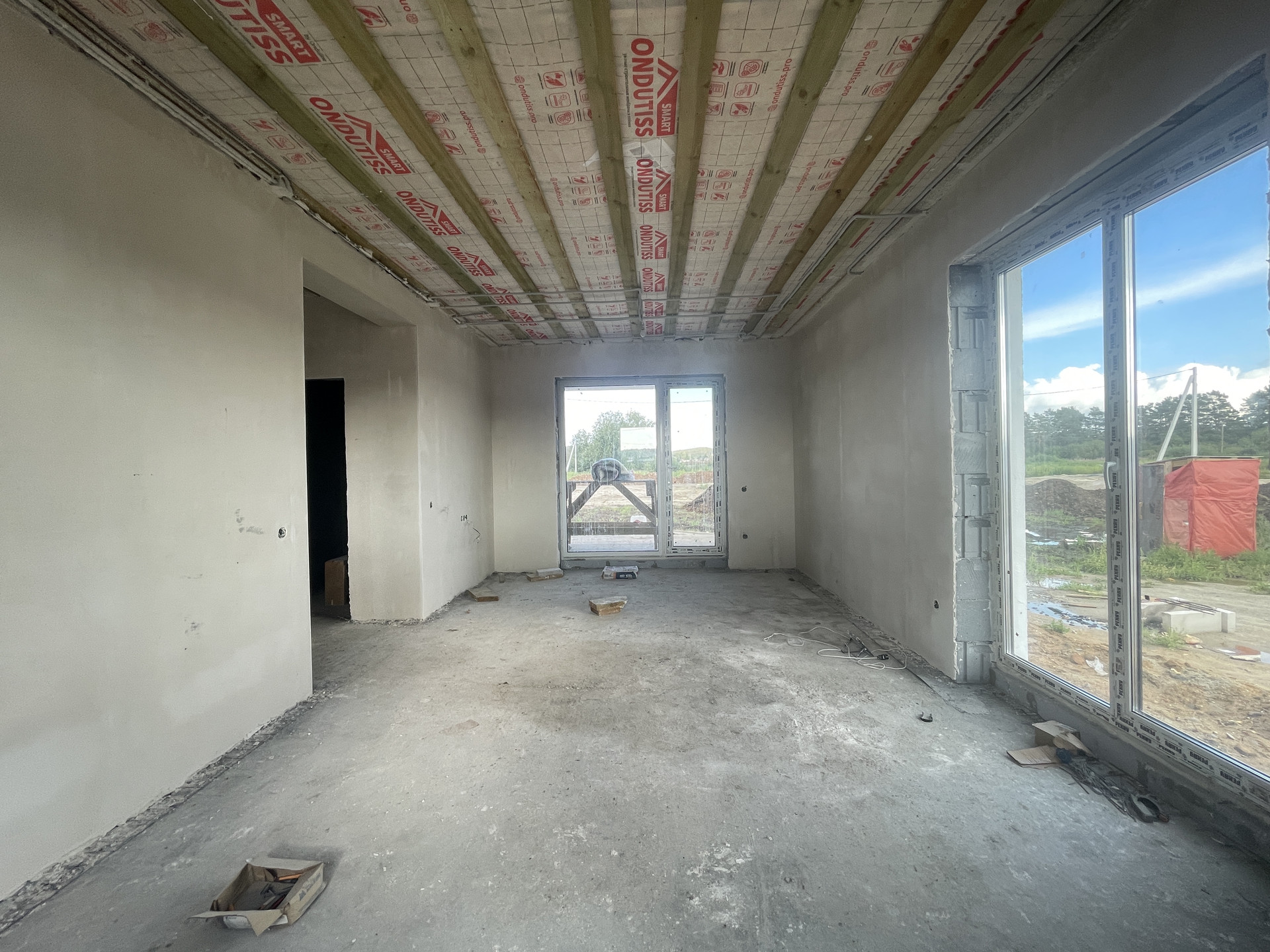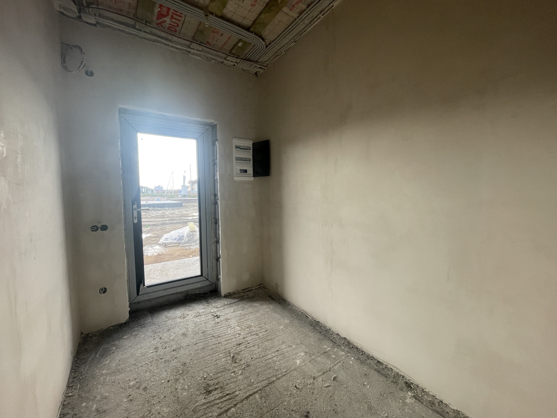 Планировка дома включает в себя просторную кухню-гостиную с панорамным остеклением, высокими потолками и выходом на террасу, две просторные комнаты, одна из которых мастер-спальня со своим гардеробом, ванную комнату и гостевой санузел, бойлерную комнату и коридор.