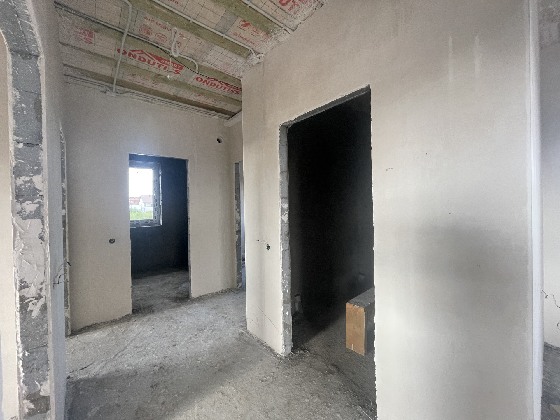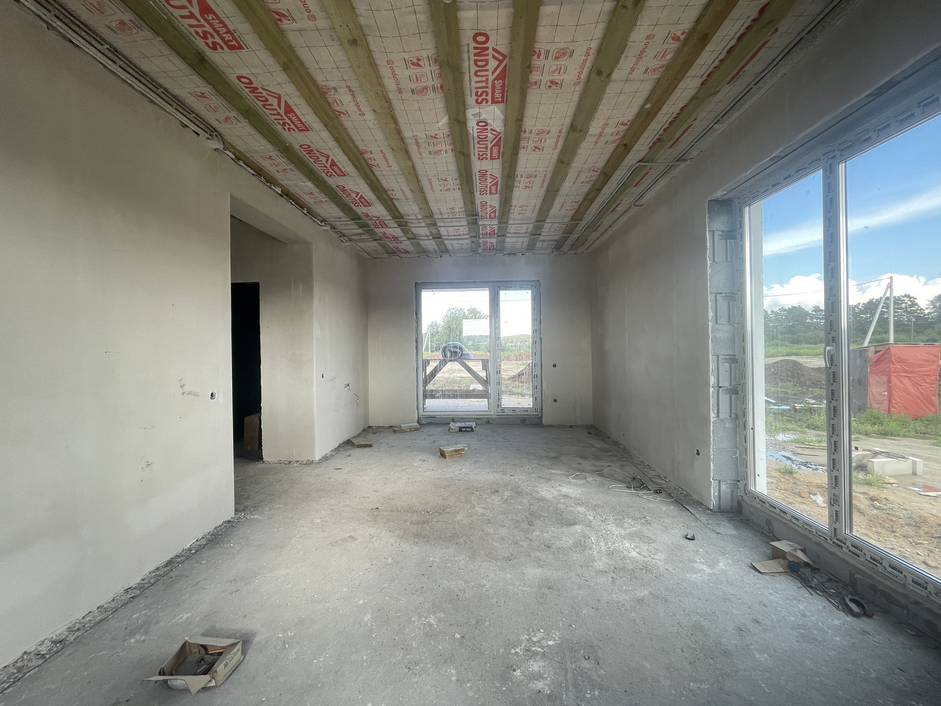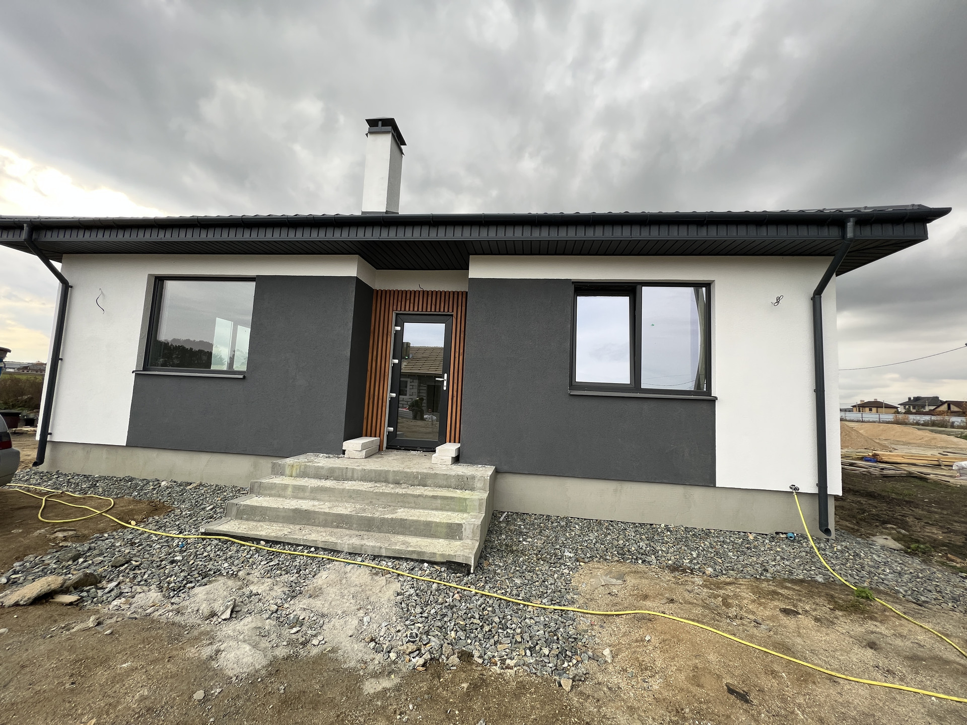 Планировка дома включает в себя просторную кухню-гостиную с панорамным остеклением, высокими потолками и выходом на террасу, две просторные комнаты, одна из которых мастер-спальня со своим гардеробом, ванную комнату и гостевой санузел, бойлерную комнату и коридор.