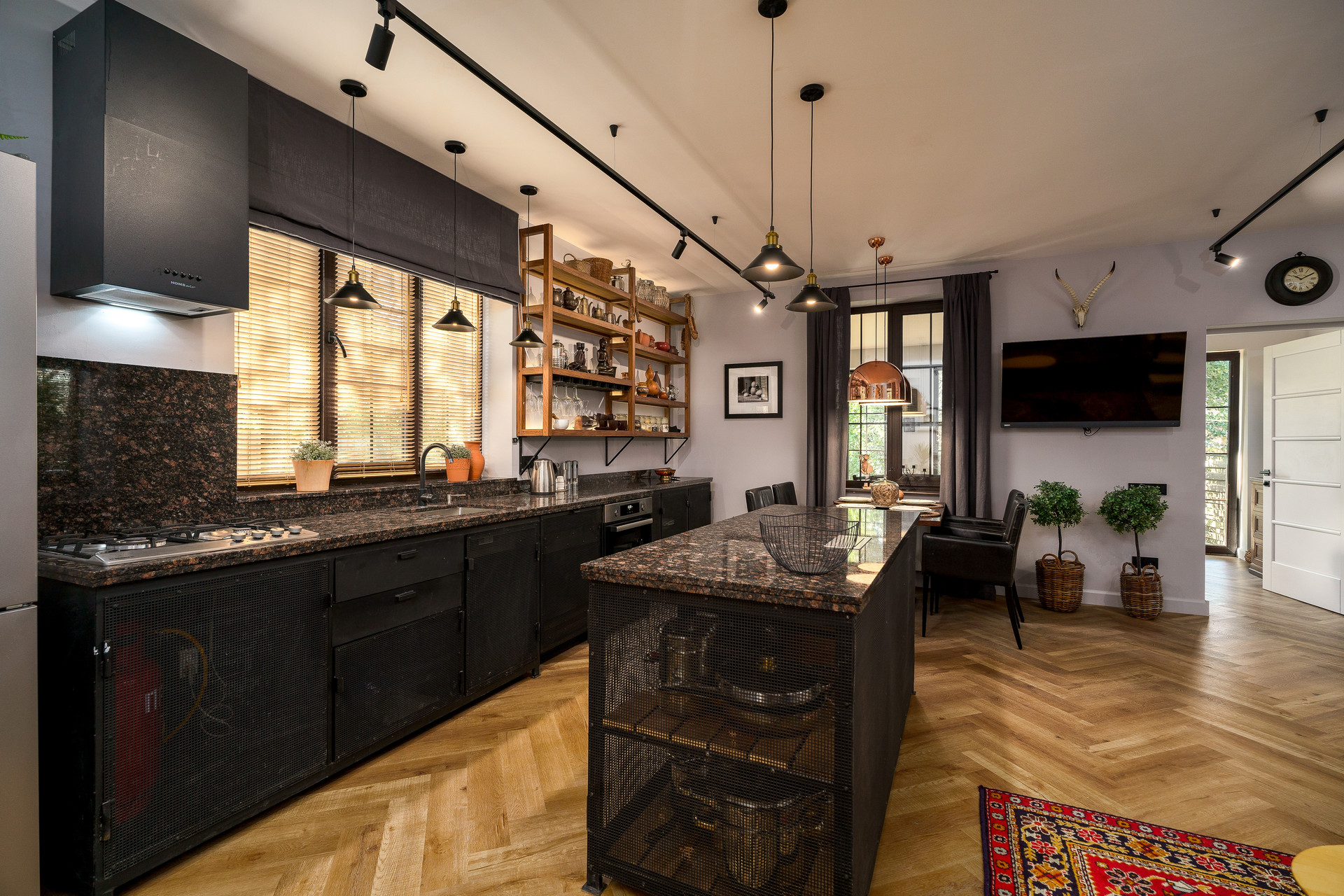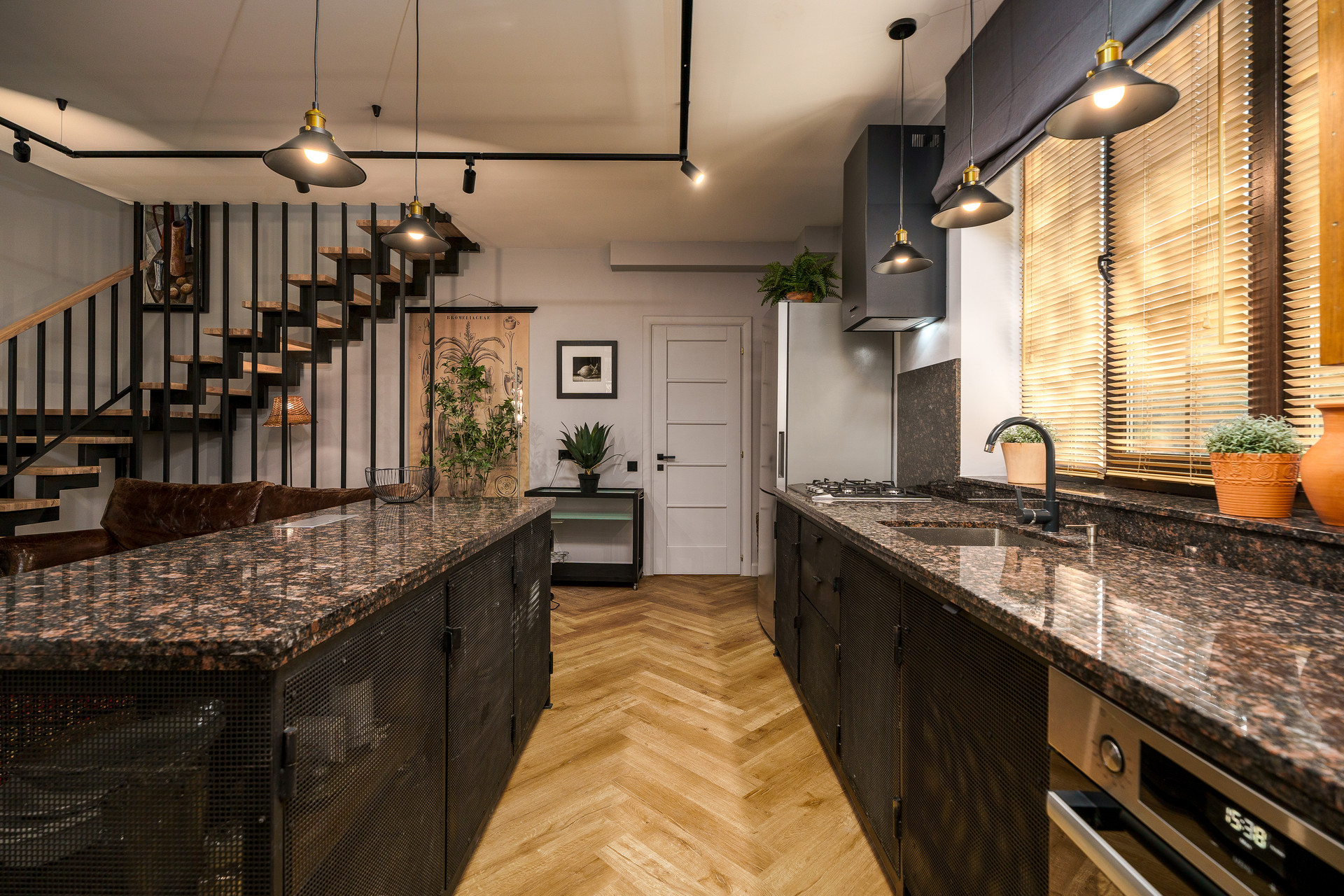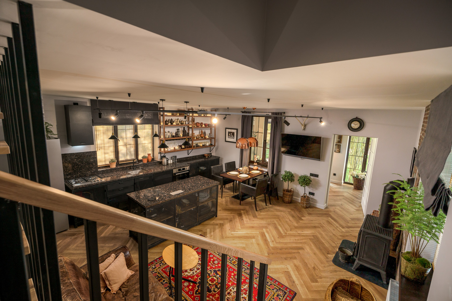 Планировка дома включает : просторную кухню-гостиную на первом этаже 39  метров. Кухня-остров со множеством места для хранения. Рабочая поверхность и фартук из натурального камня.