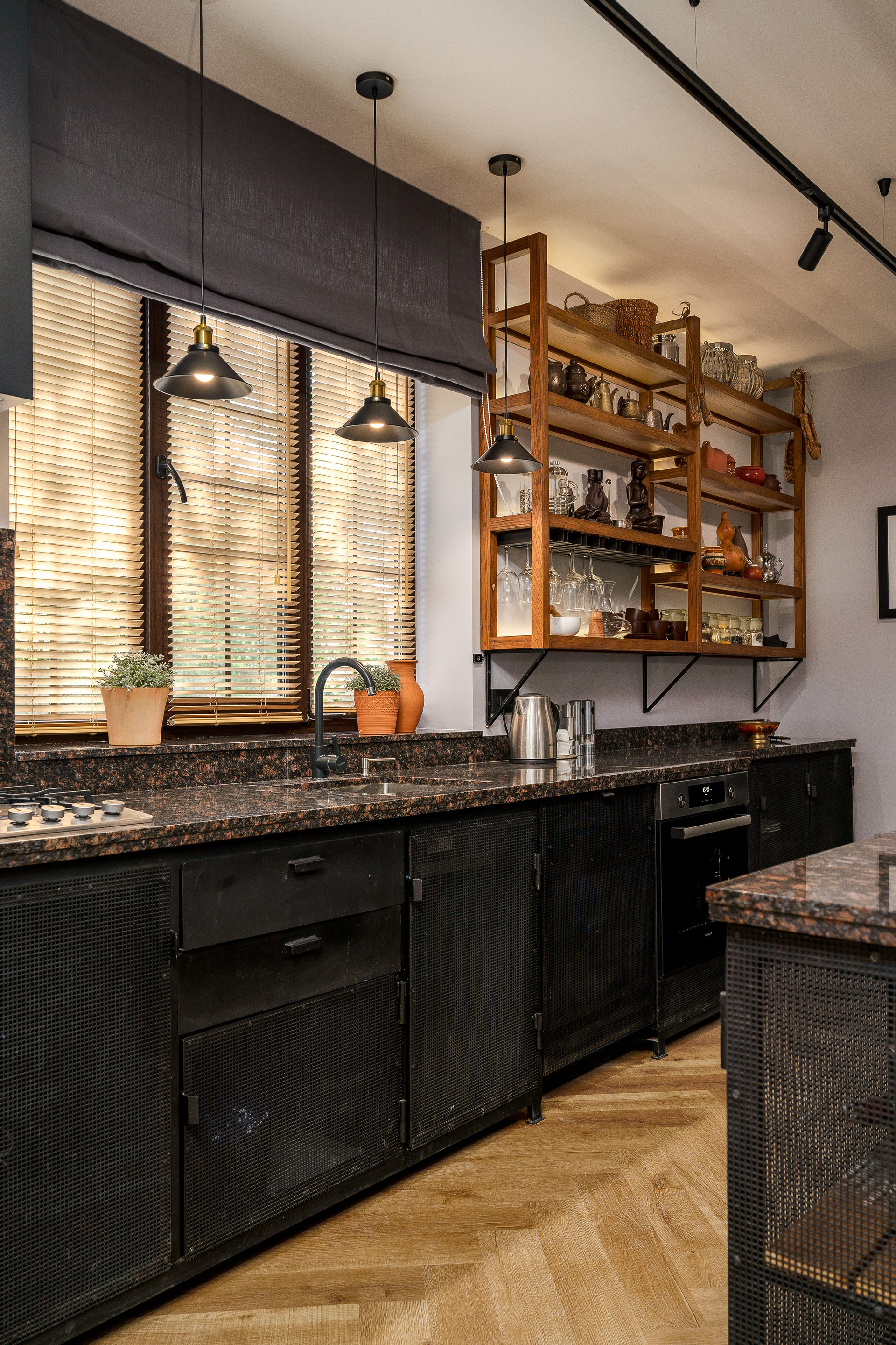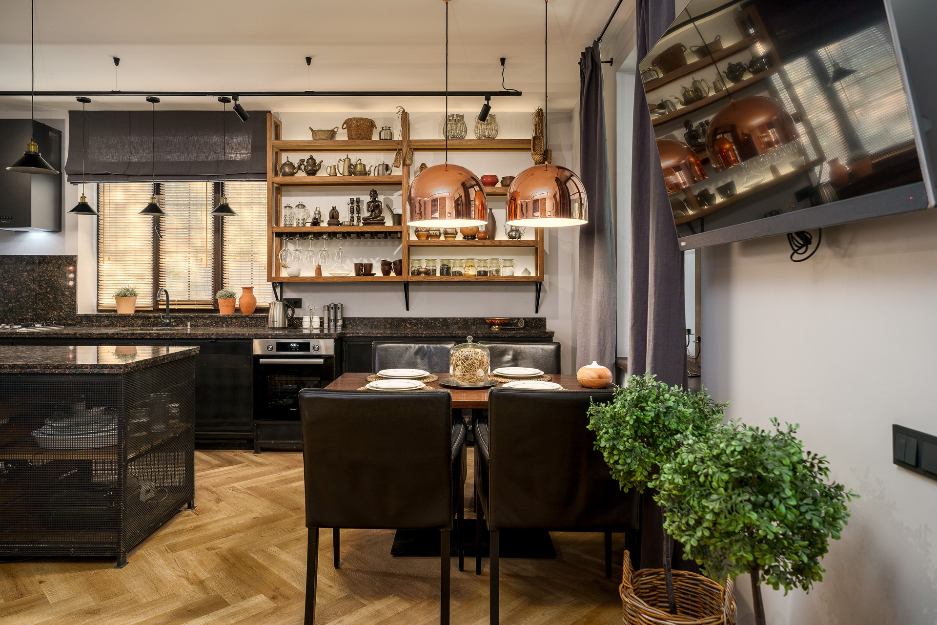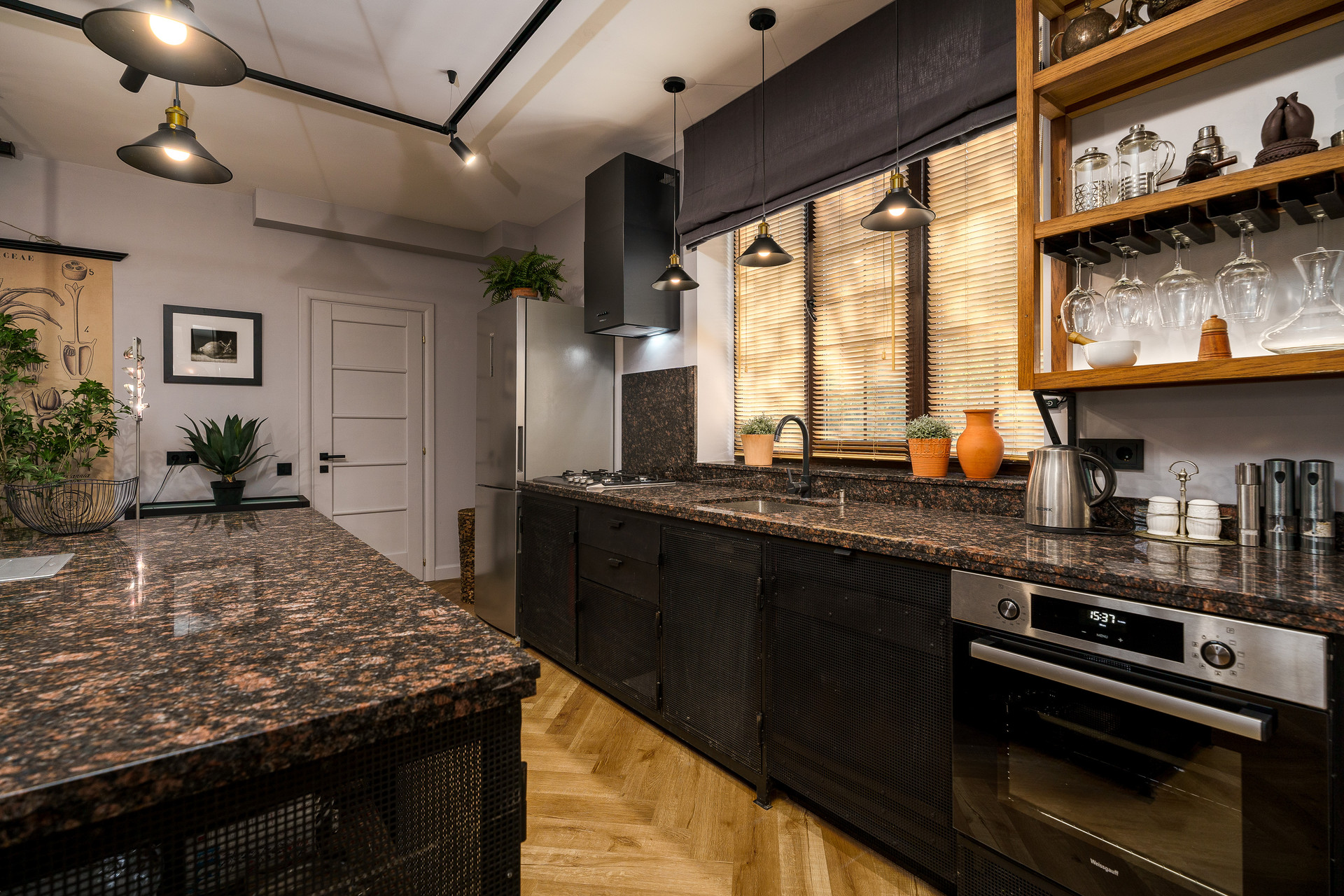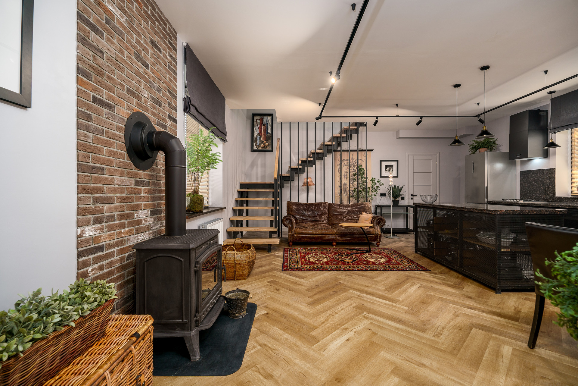 Планировка дома включает : просторную кухню-гостиную на первом этаже 39  метров. Кухня-остров со множеством места для хранения. Рабочая поверхность и фартук из натурального камня.