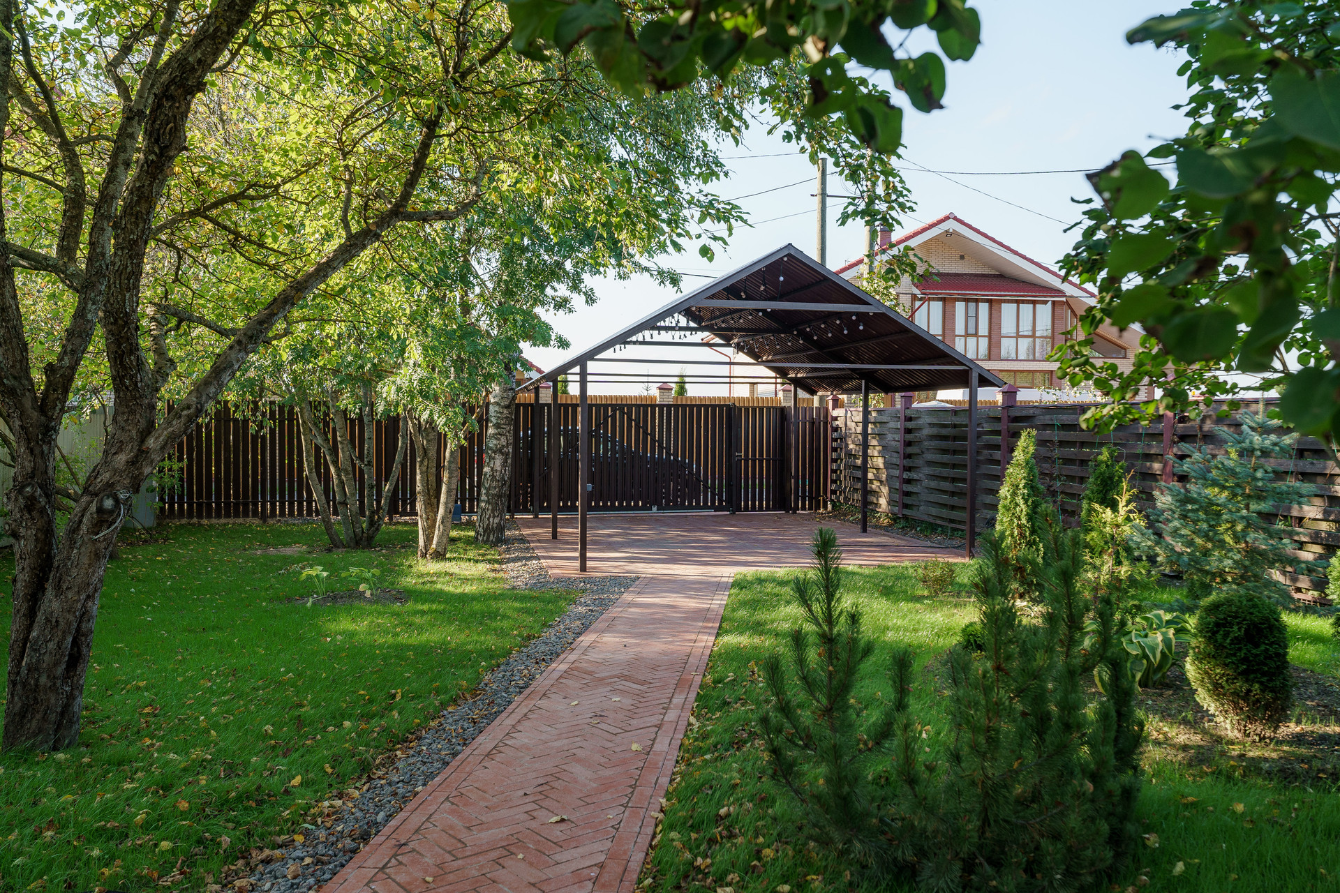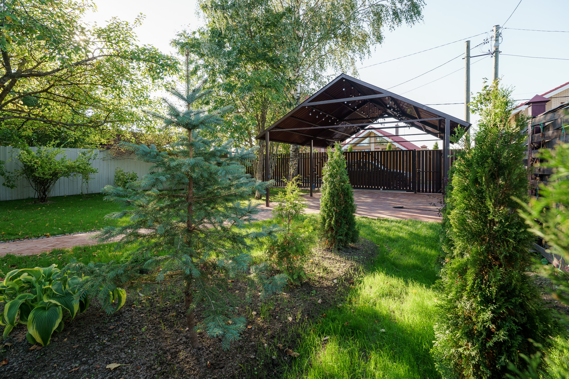 Плодовые деревья и кустарники по всему участку. Парковка под навесом на 2 машины. Хозблок для хранения. Откатные ворота. Участок огорожен металлическим забором.