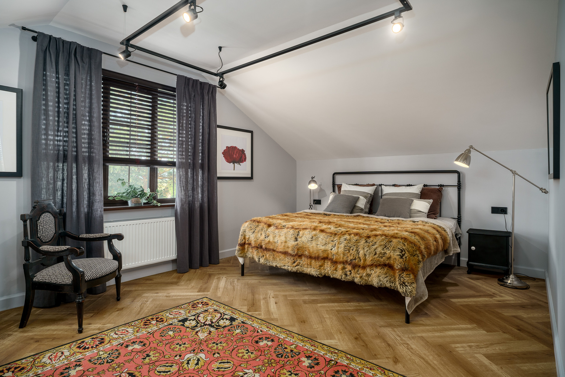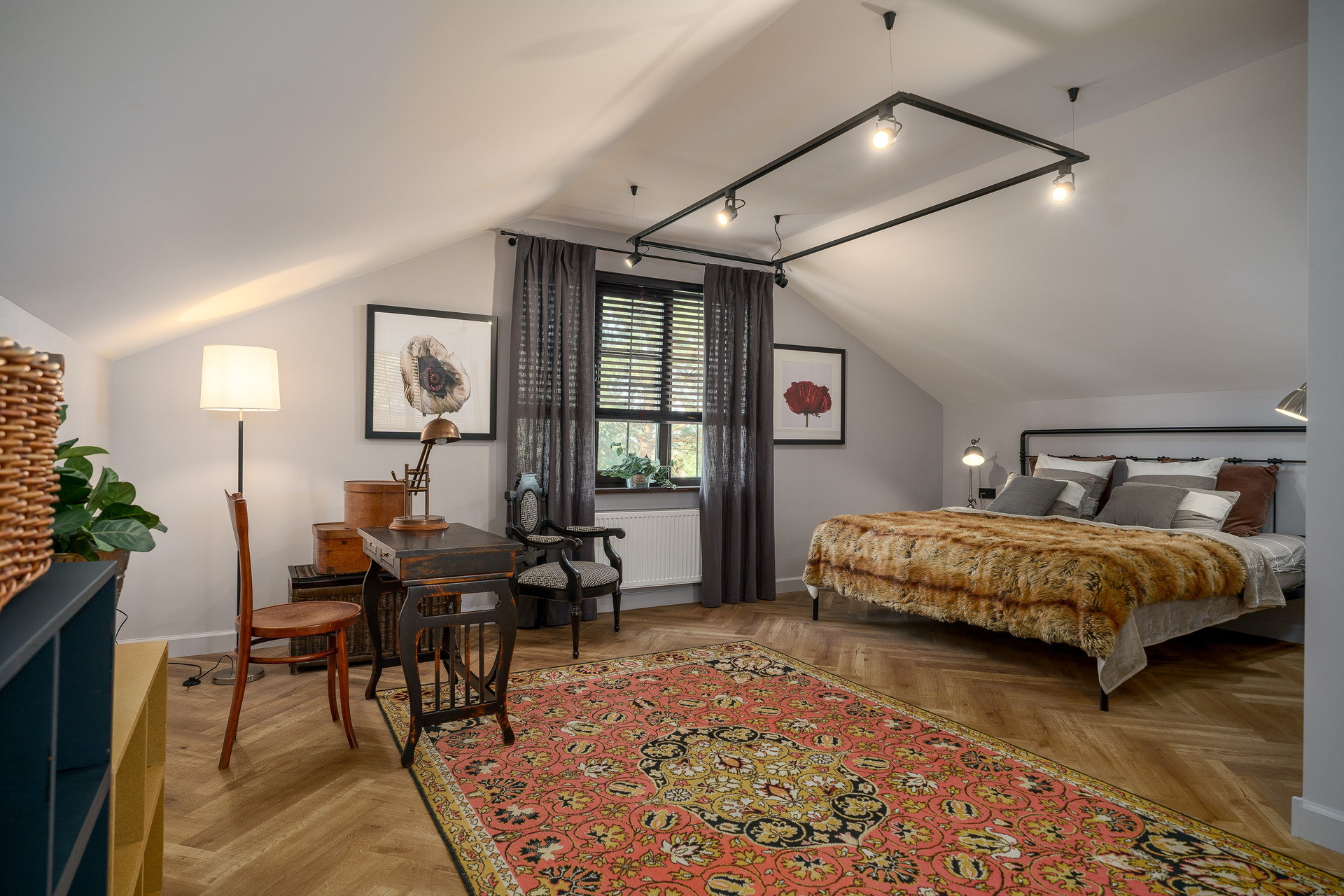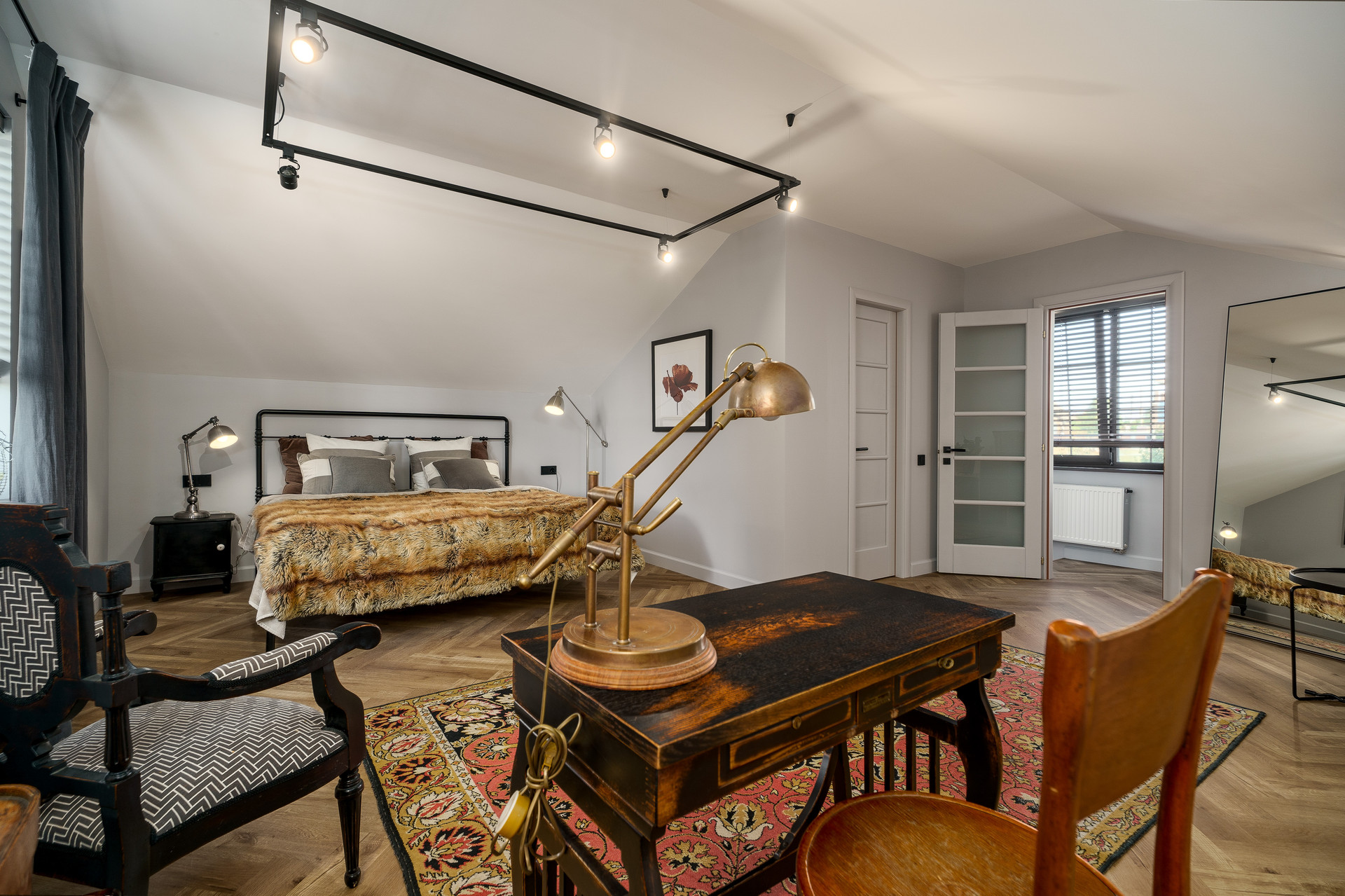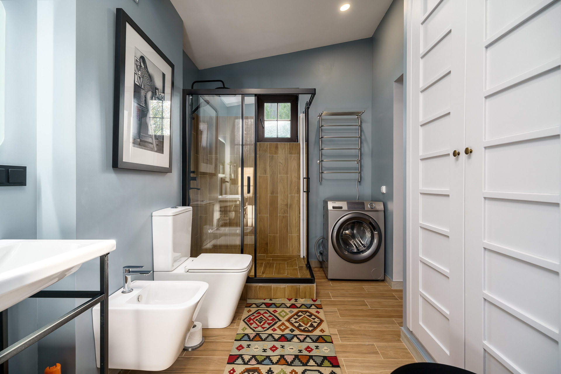 Уютная спальня 27 метров на втором этаже со своим санузлом и  просторной гардеробной 5 метров. Большой санузел на первом 7 метров. Также есть кладовая 5,3 метра.