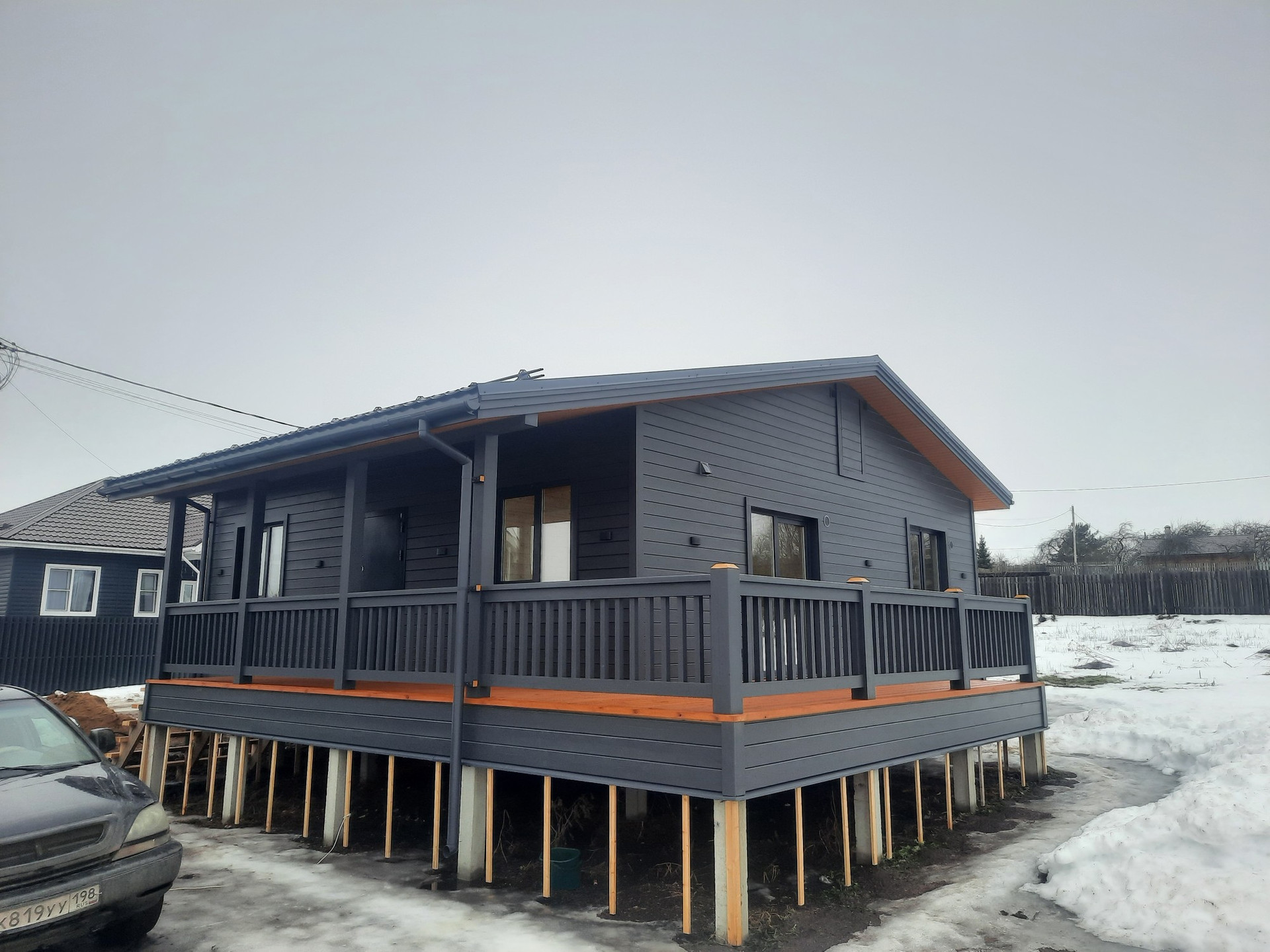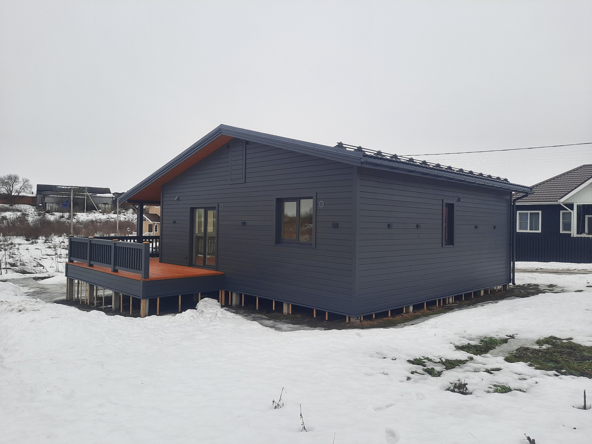 Одноэтажный каркасный дом размером 9*9м Площадь пятна застройки 108 кв.м Жилая площадь 74 кв.м. с двумя терассами, 12м² и 15м².