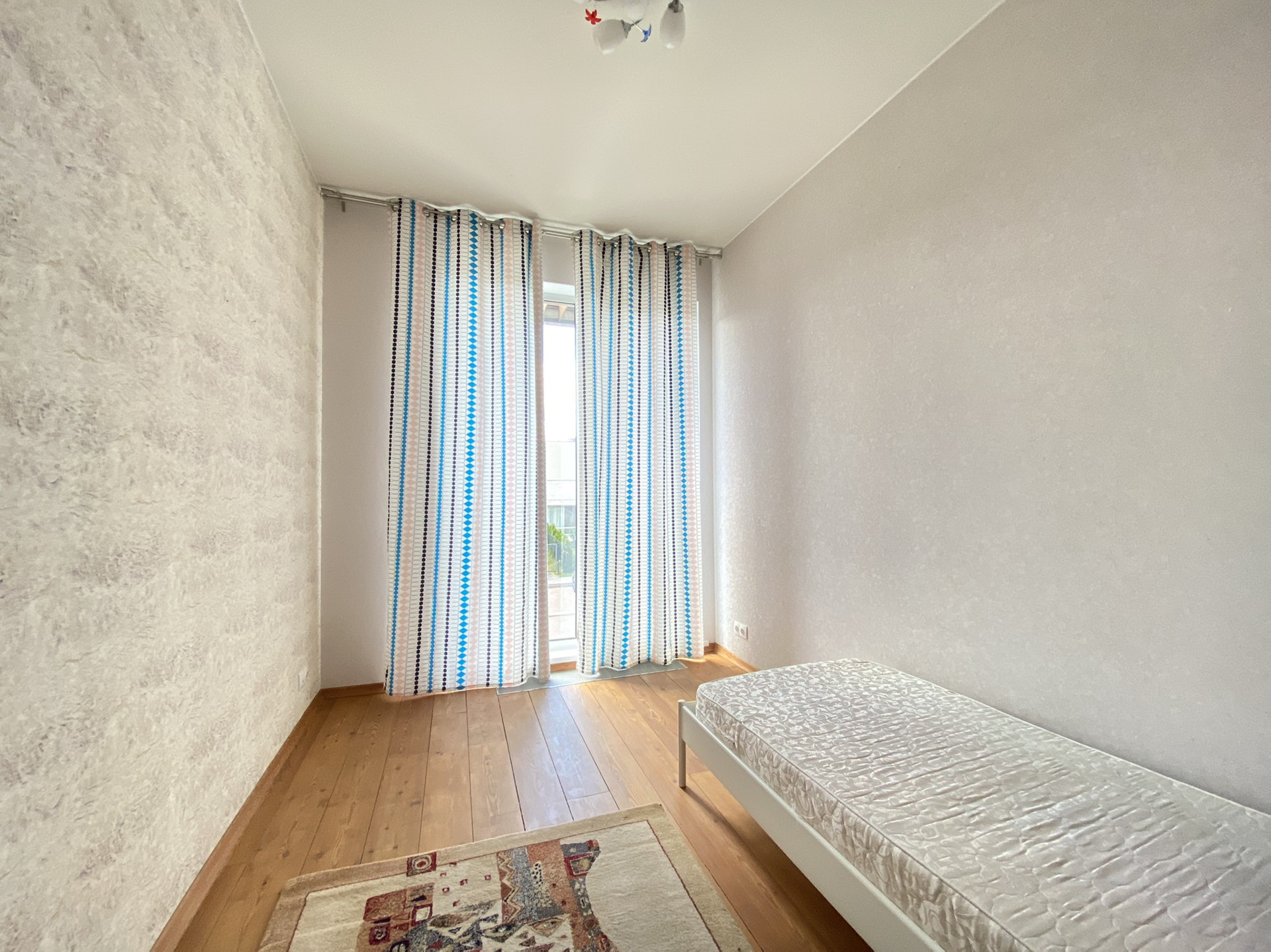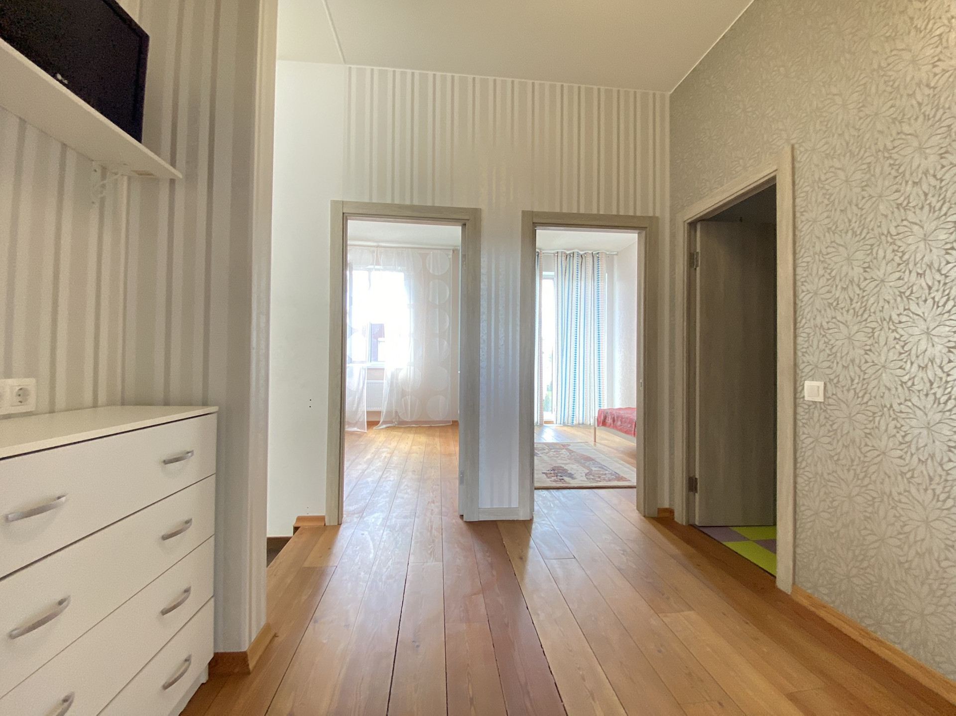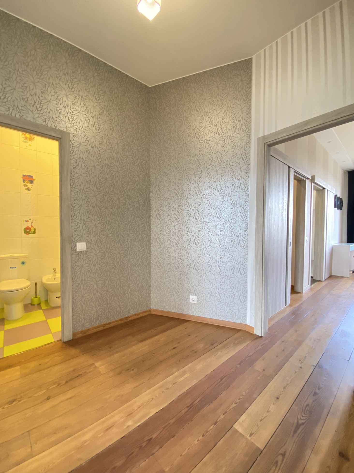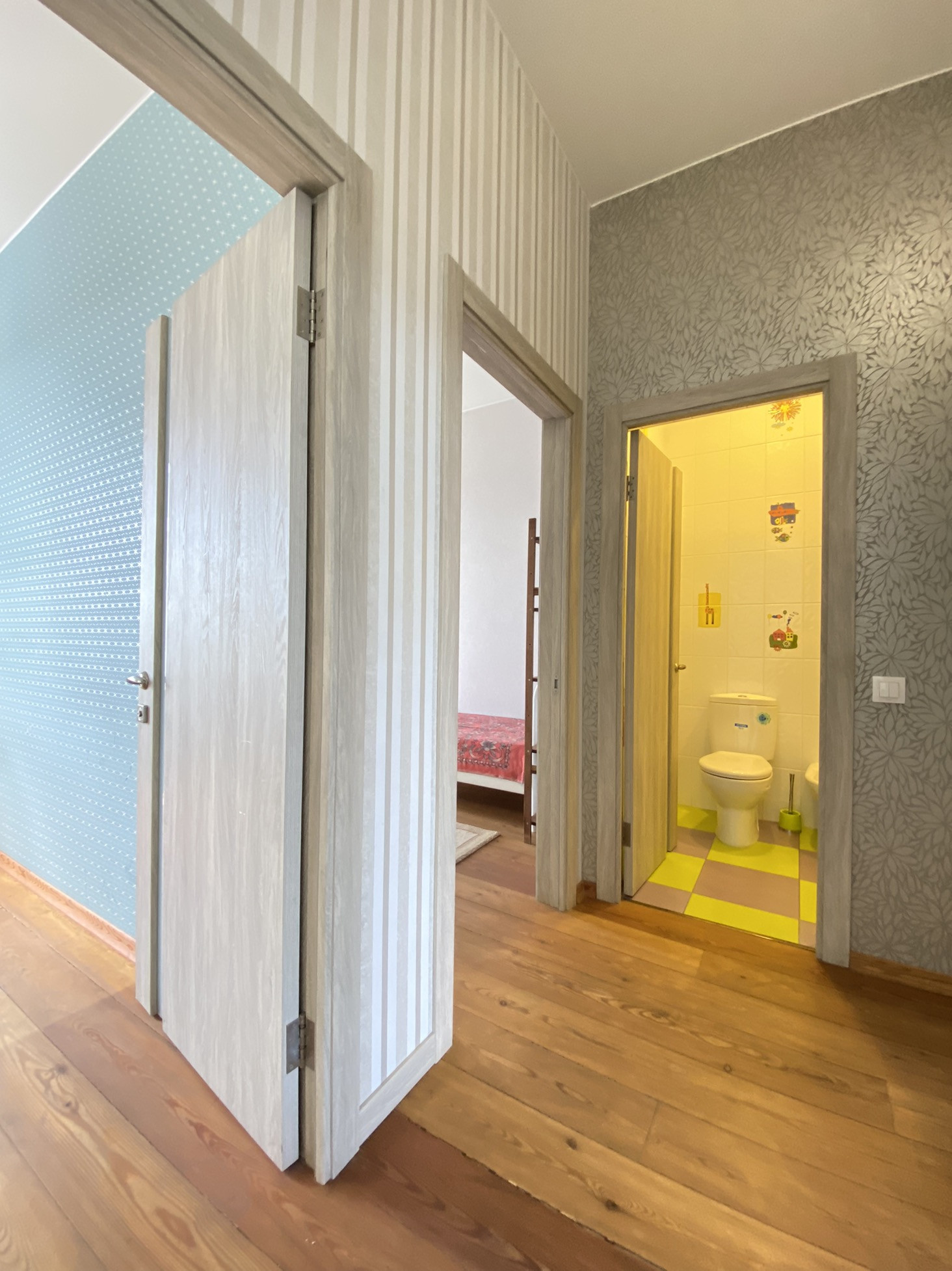 2-й этаж - три изолированные комнаты, одна из которых просторная спальня с выходом на террасу, собственным санузолом, сауной из натурального кедра, и гардеробной; вторая используется под спортивный зал; третья оборуована под детскую с санузлом и биде, так же для малышей предусмотрены ограничители на окнах и лестнице.