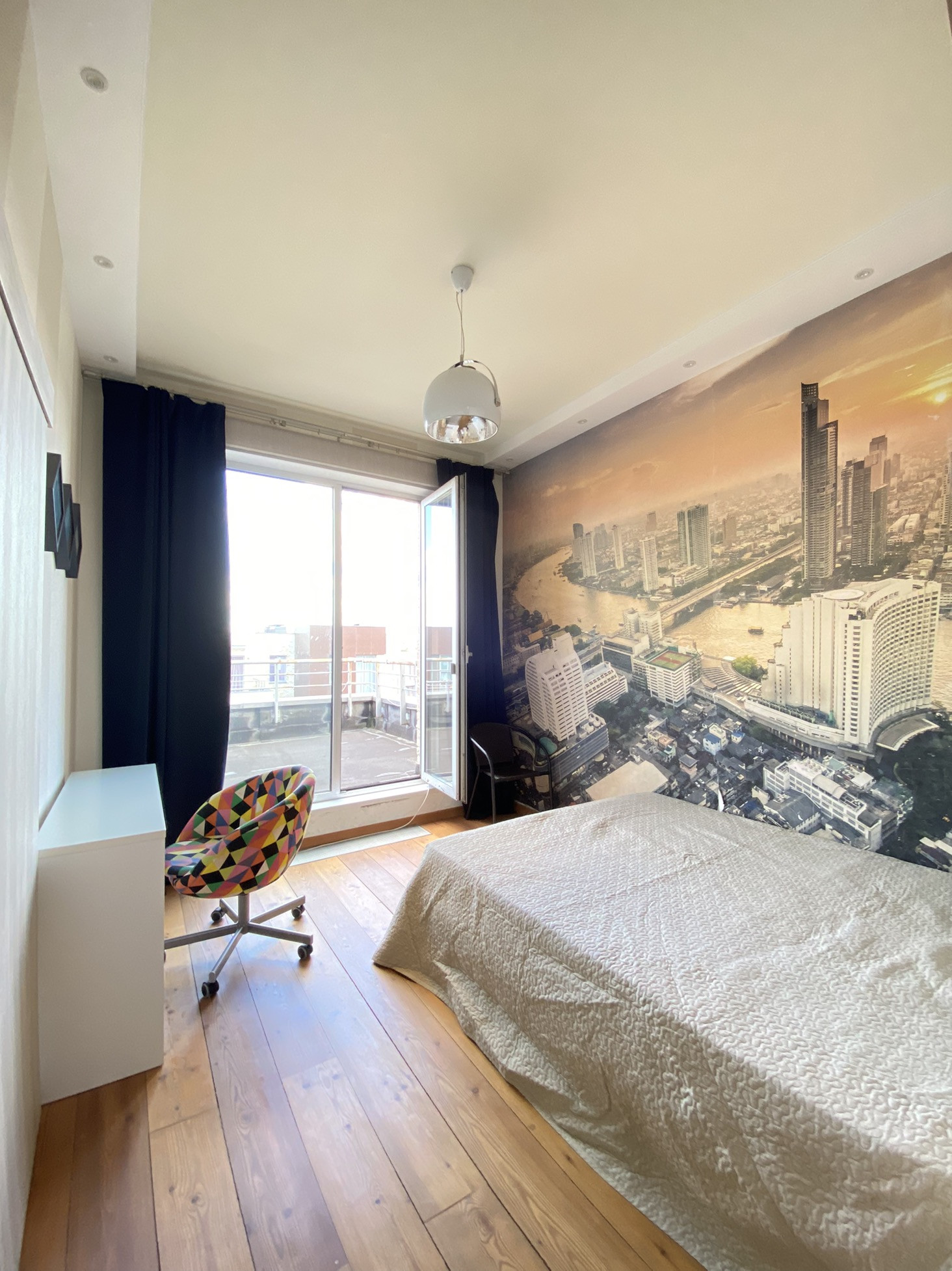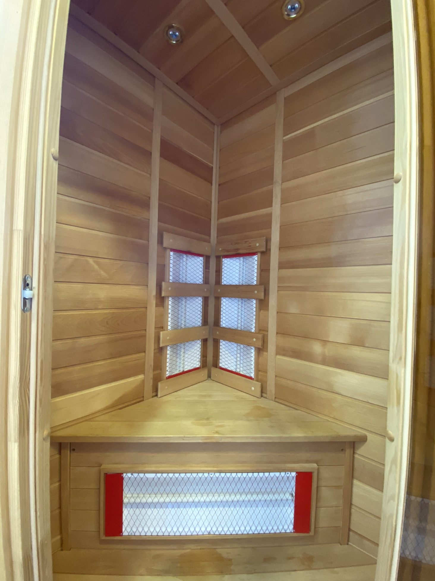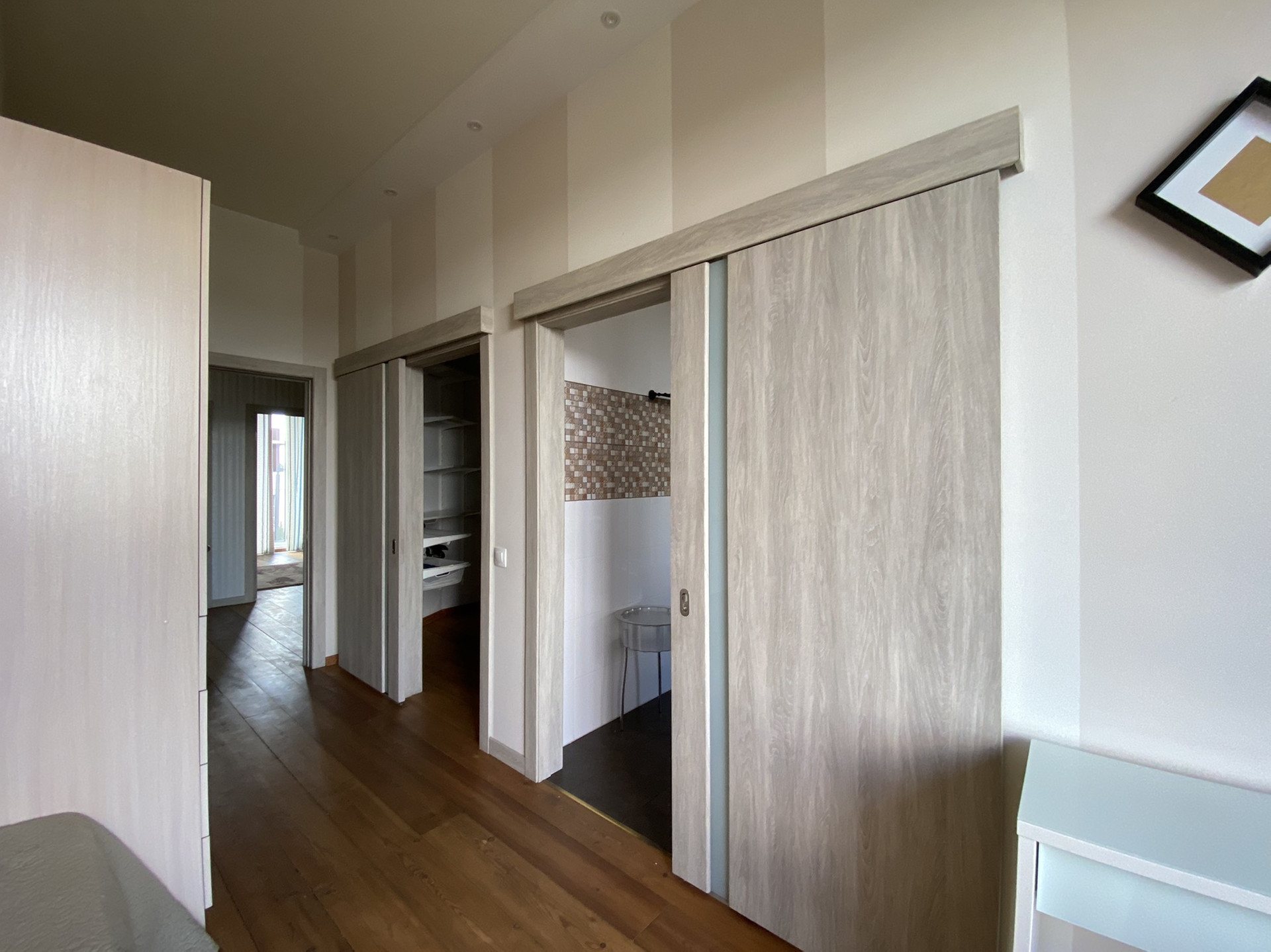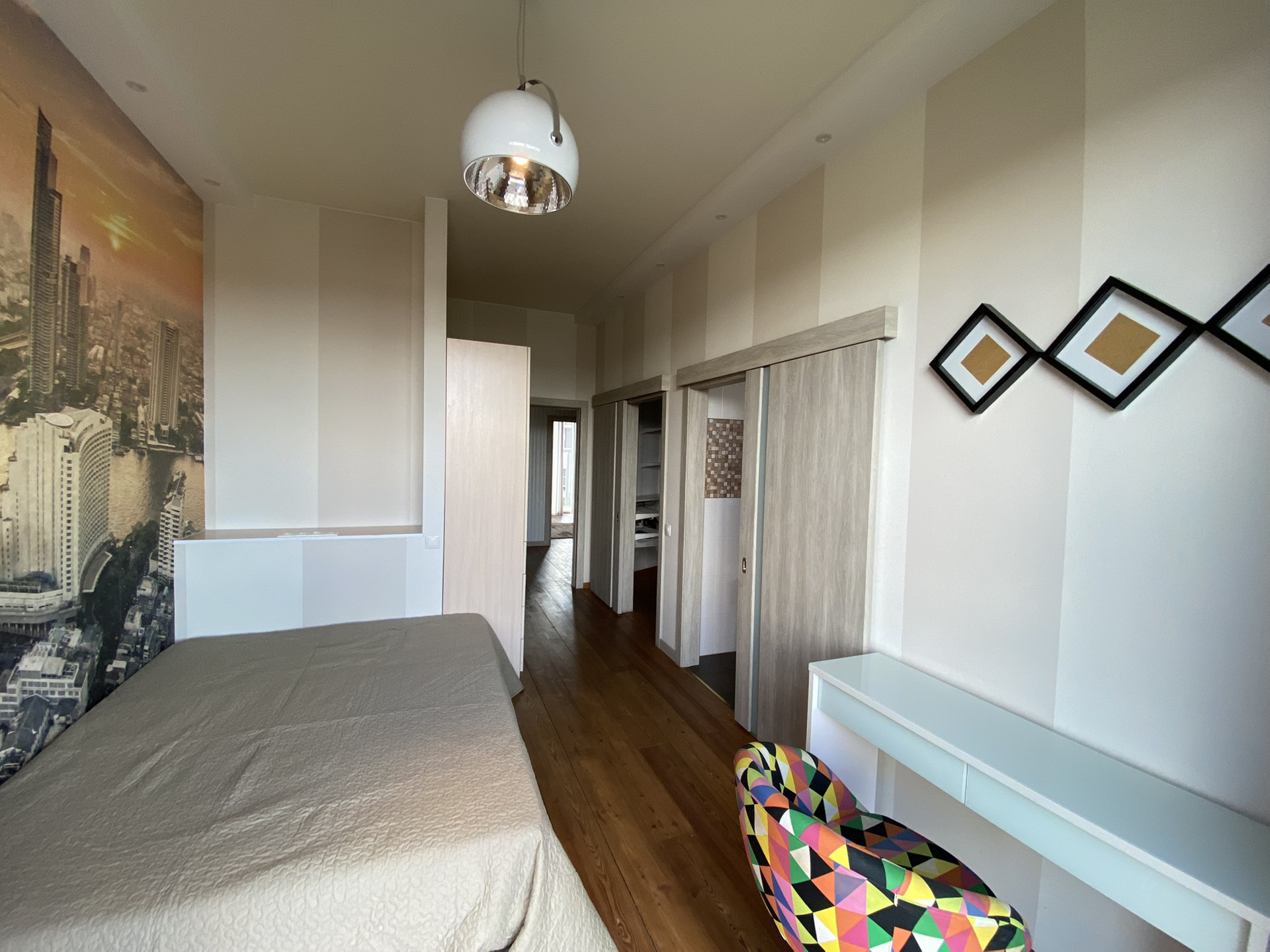2-й этаж - три изолированные комнаты, одна из которых просторная спальня с выходом на террасу, собственным санузолом, сауной из натурального кедра, и гардеробной; вторая используется под спортивный зал; третья оборуована под детскую с санузлом и биде, так же для малышей предусмотрены ограничители на окнах и лестнице.