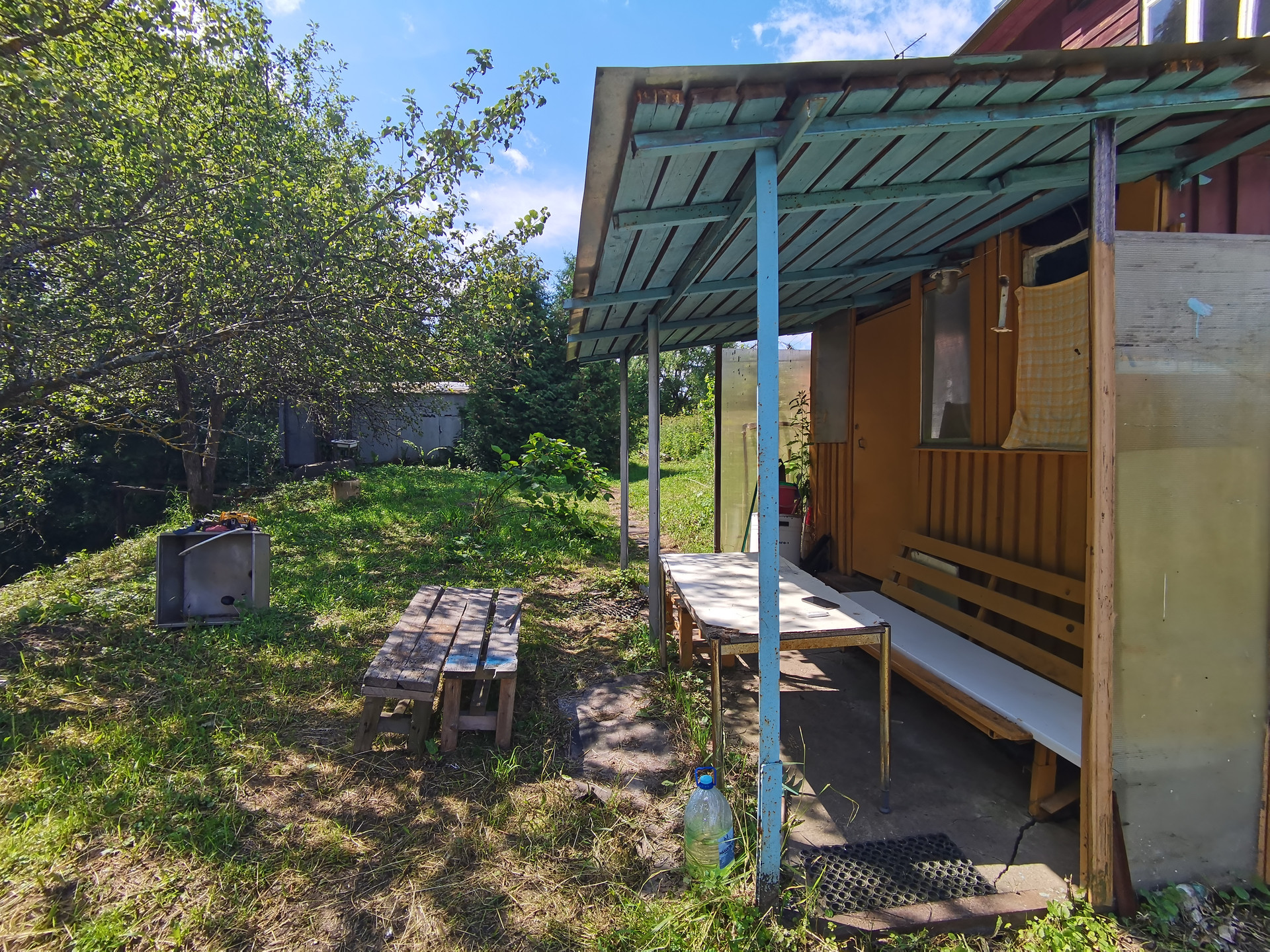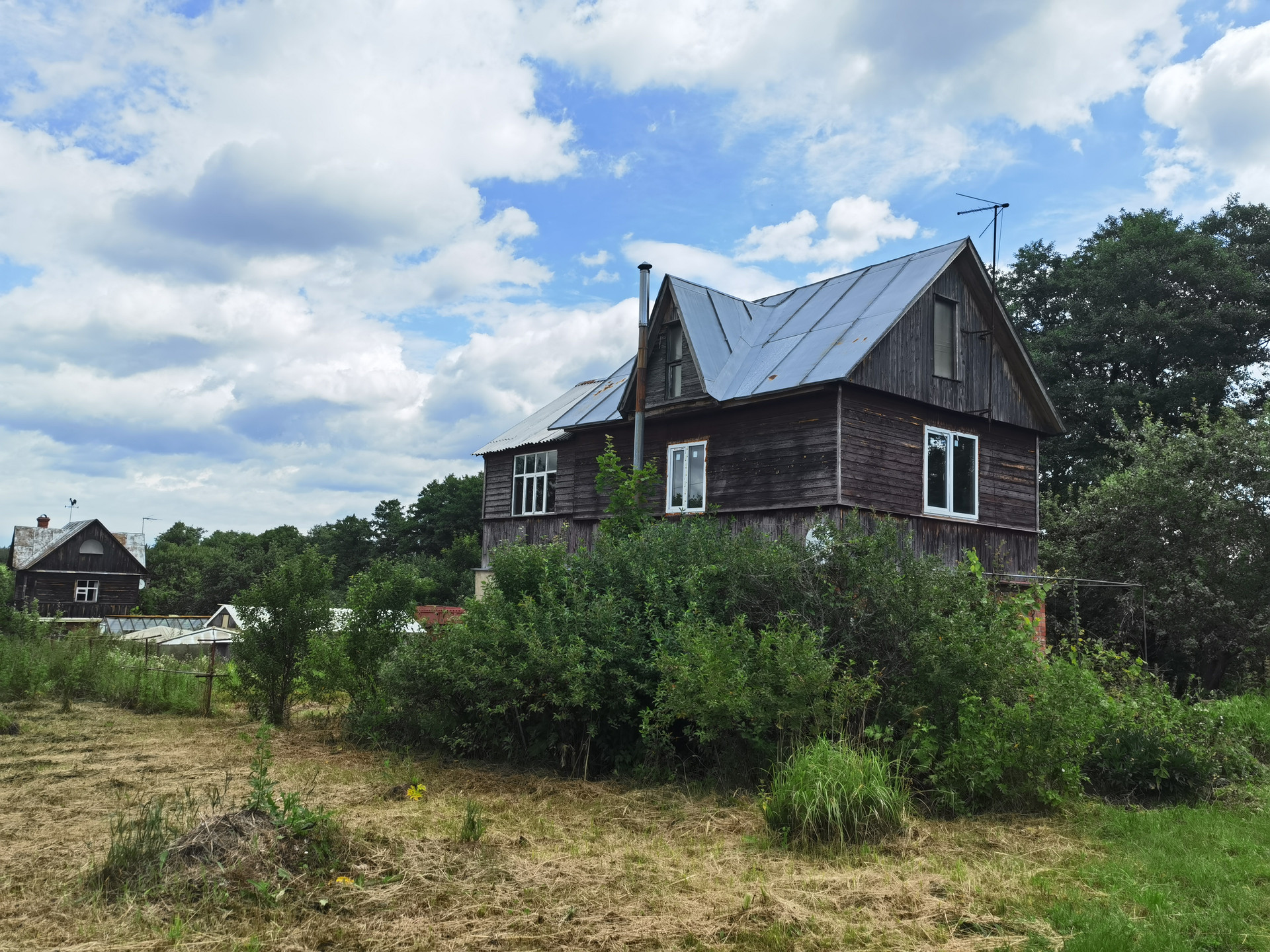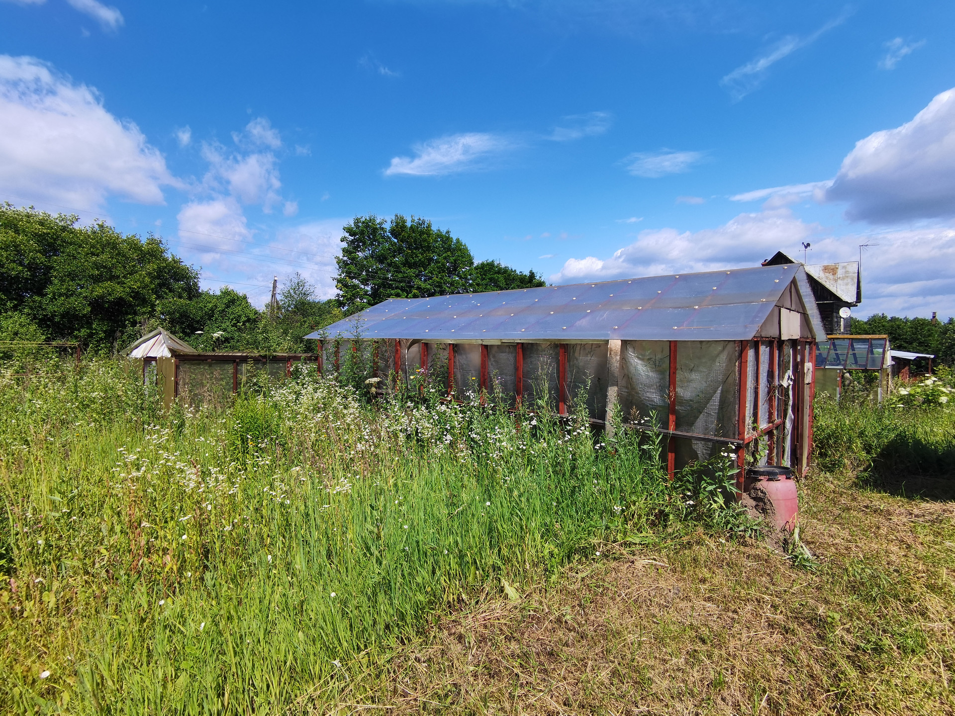 На участке две теплицы и гараж. На противоположной стороне сосновый бор.