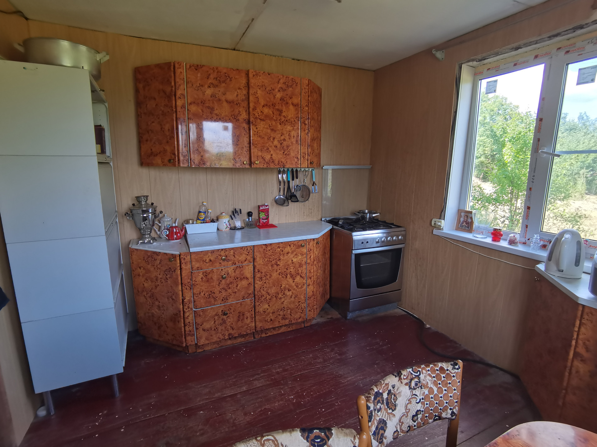 На первом этаже расположена кухня и две небольшие комнаты, утепленный холл, также установлена душевая кабина (вода горячая, холодная) и стиральная машина.