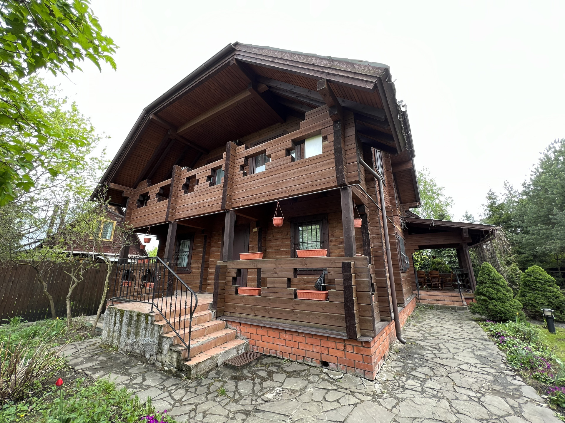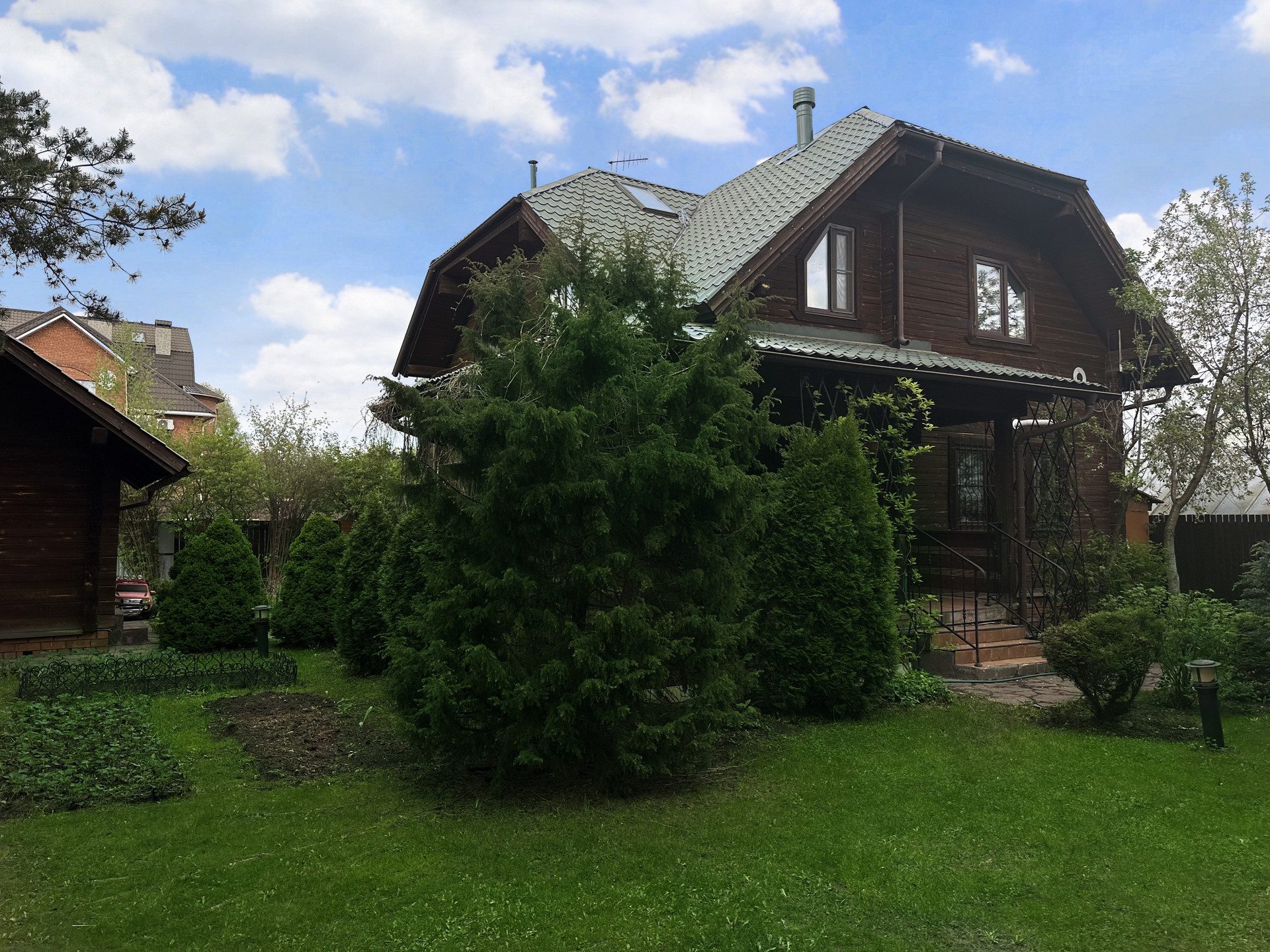 Двор засеян газоном, вдоль забора высажены хвойные деревья. На участке много взрослых деревьев, которые летом создают комфортную тень. Есть большая веранда, которая полностью обвита диким виноградом.