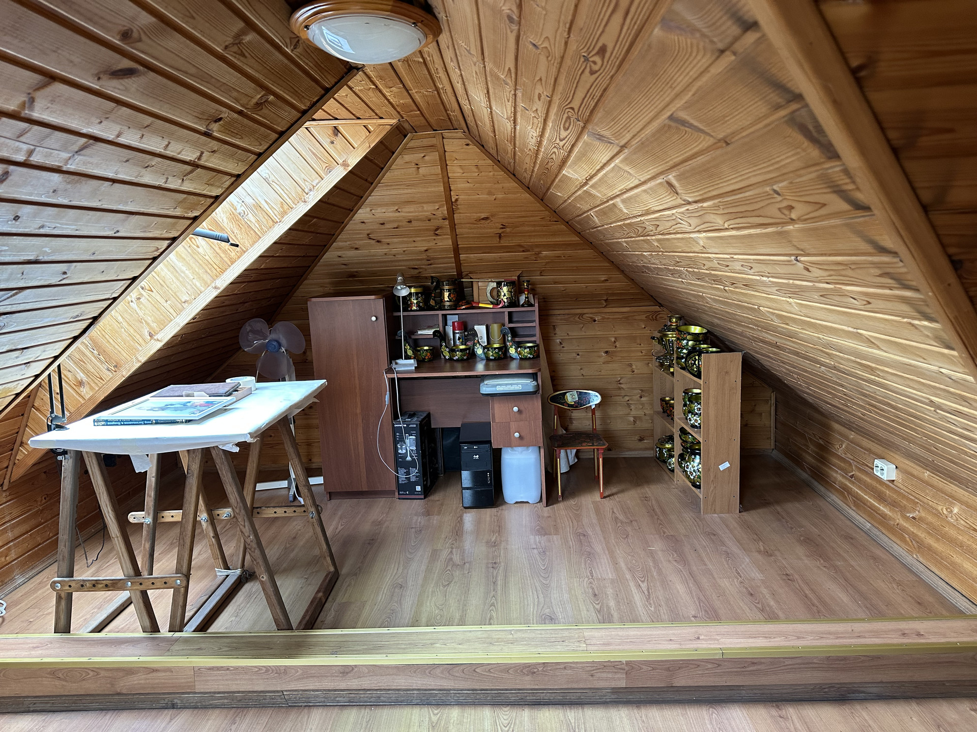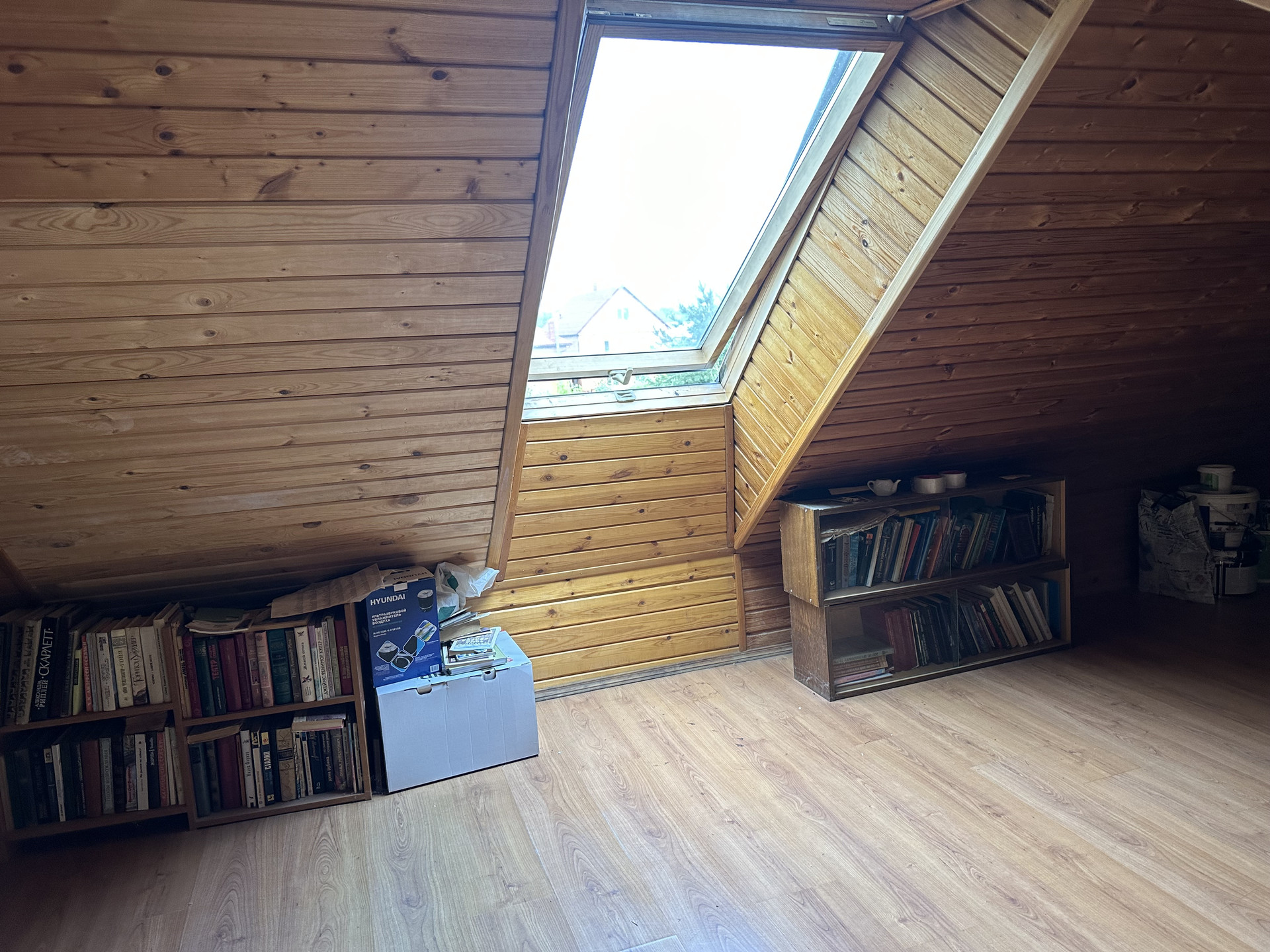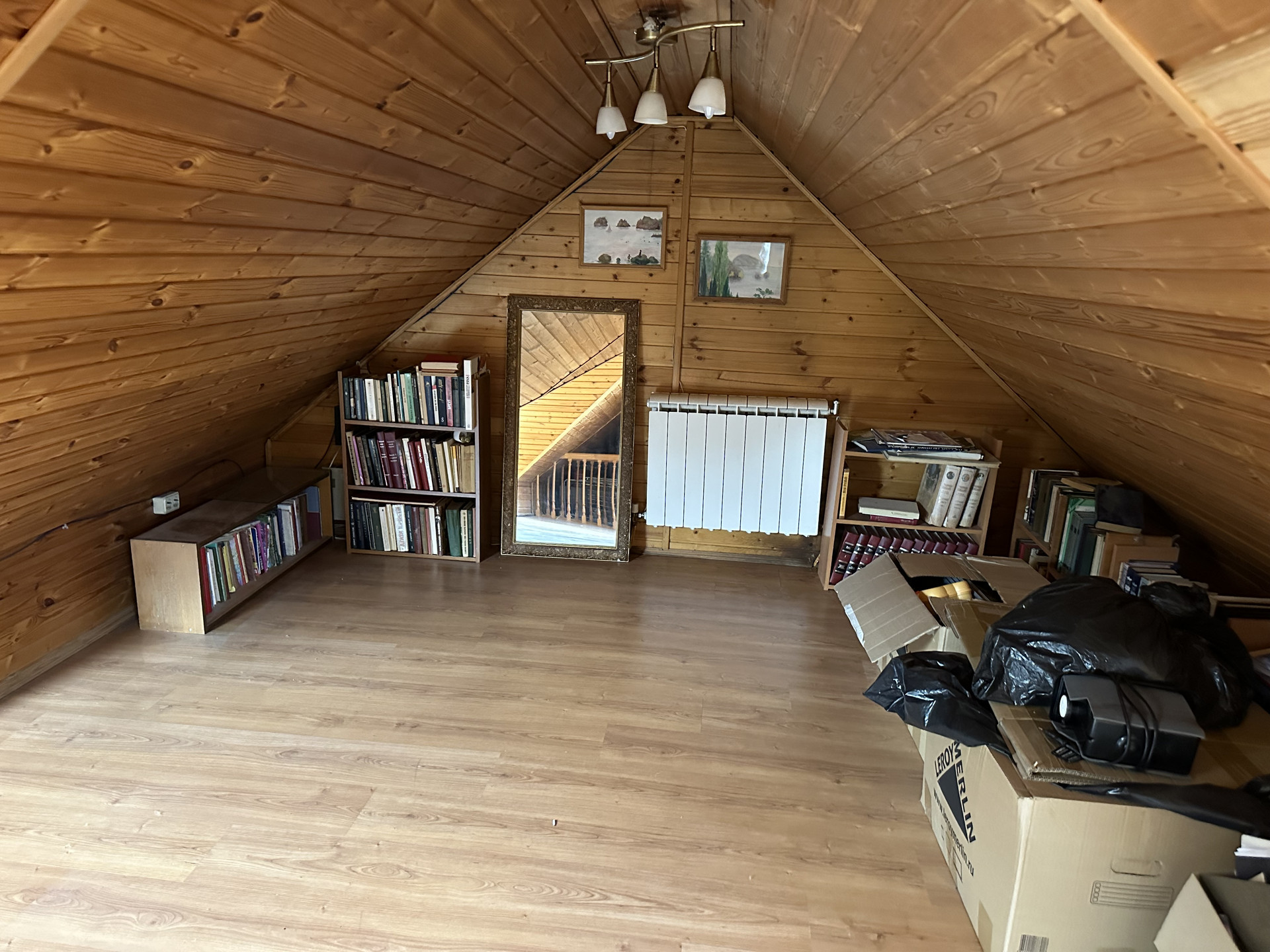 - Теплое помещение с мансардными окнами, пригодное для хранения вещей и обустройства дополнительной спальни для гостей или детской.