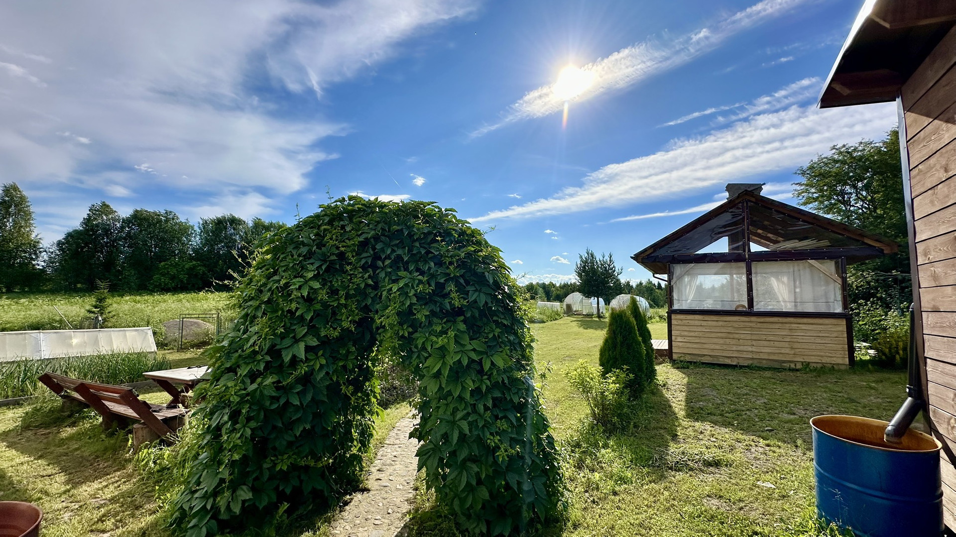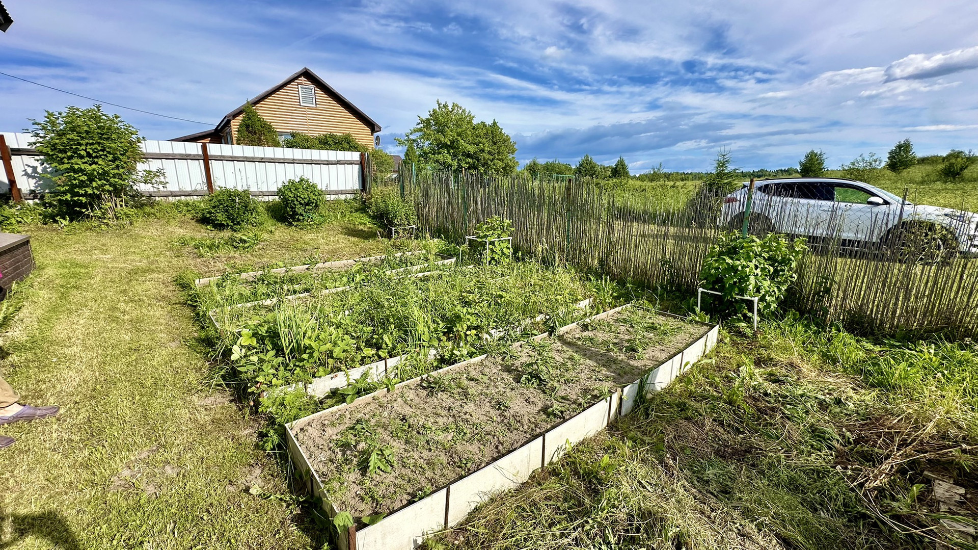 Облагороженные грядки, разработанное картофельное поле. Высажен газон, хвойники, красивые клумбы и арка для вьющих растений.