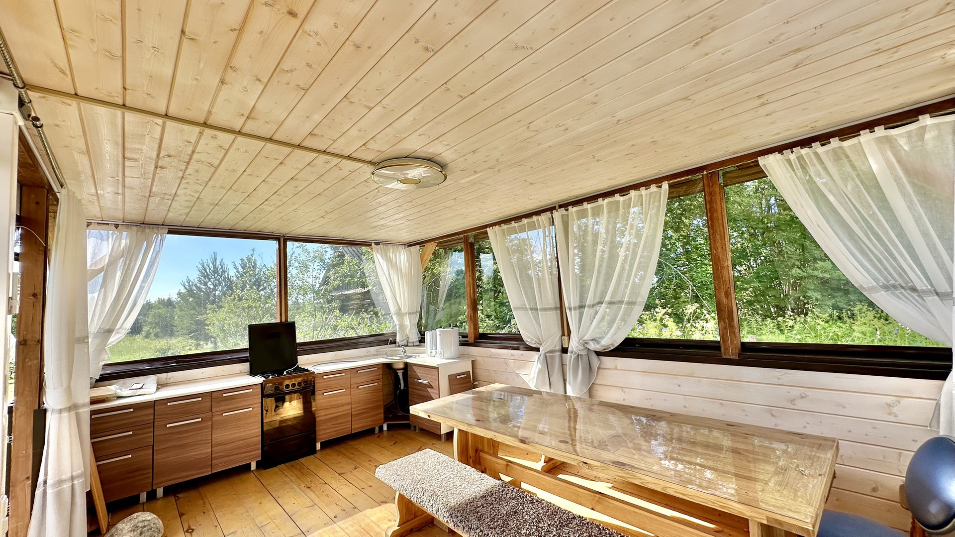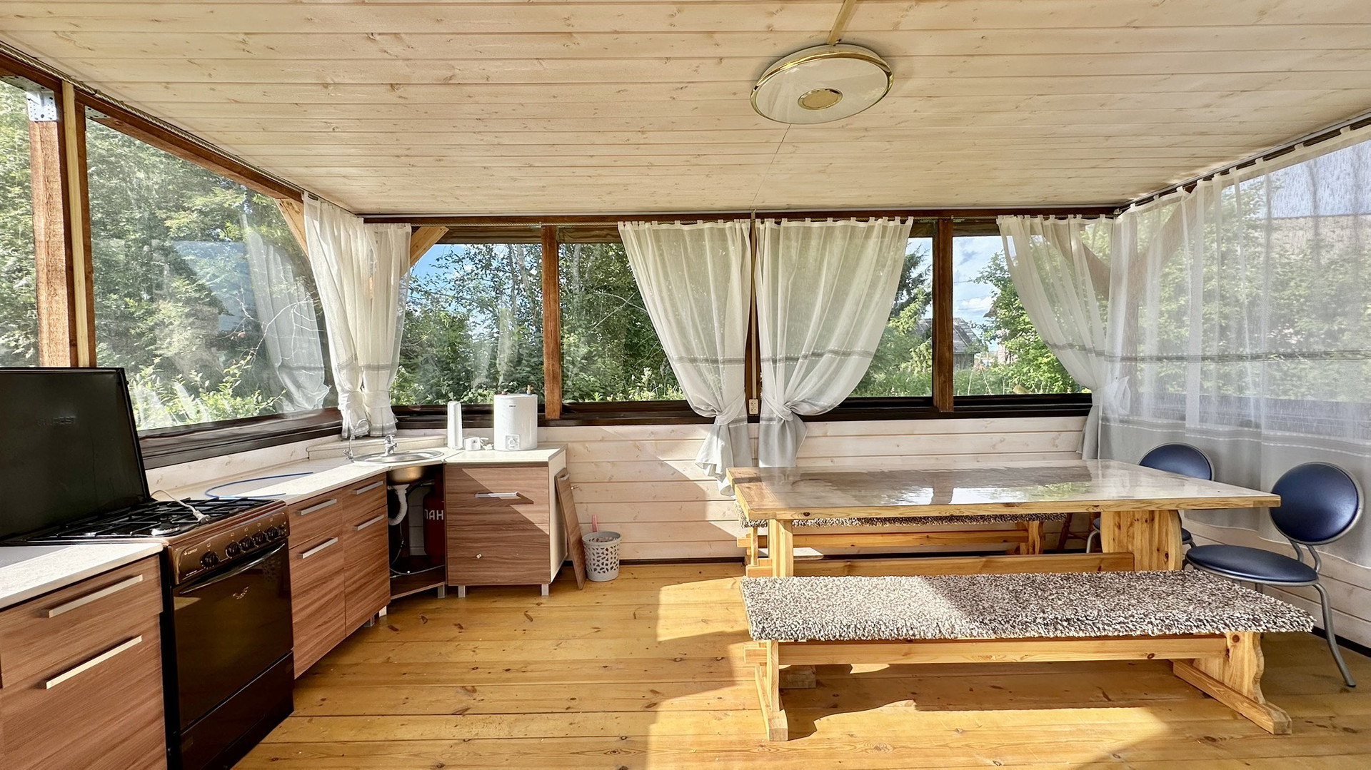⚜️ Летняя кухня – новая, постройки 2023 года, 4х6 метров. По периметру смонтированы мягкие окна, сделано светодиодное освещение и декоративная подсветка. Установлен новый кухонный гарнитур с новой газовой плитой, газ баллонный. Установлен шикарный монастырский стол с двумя лавками.