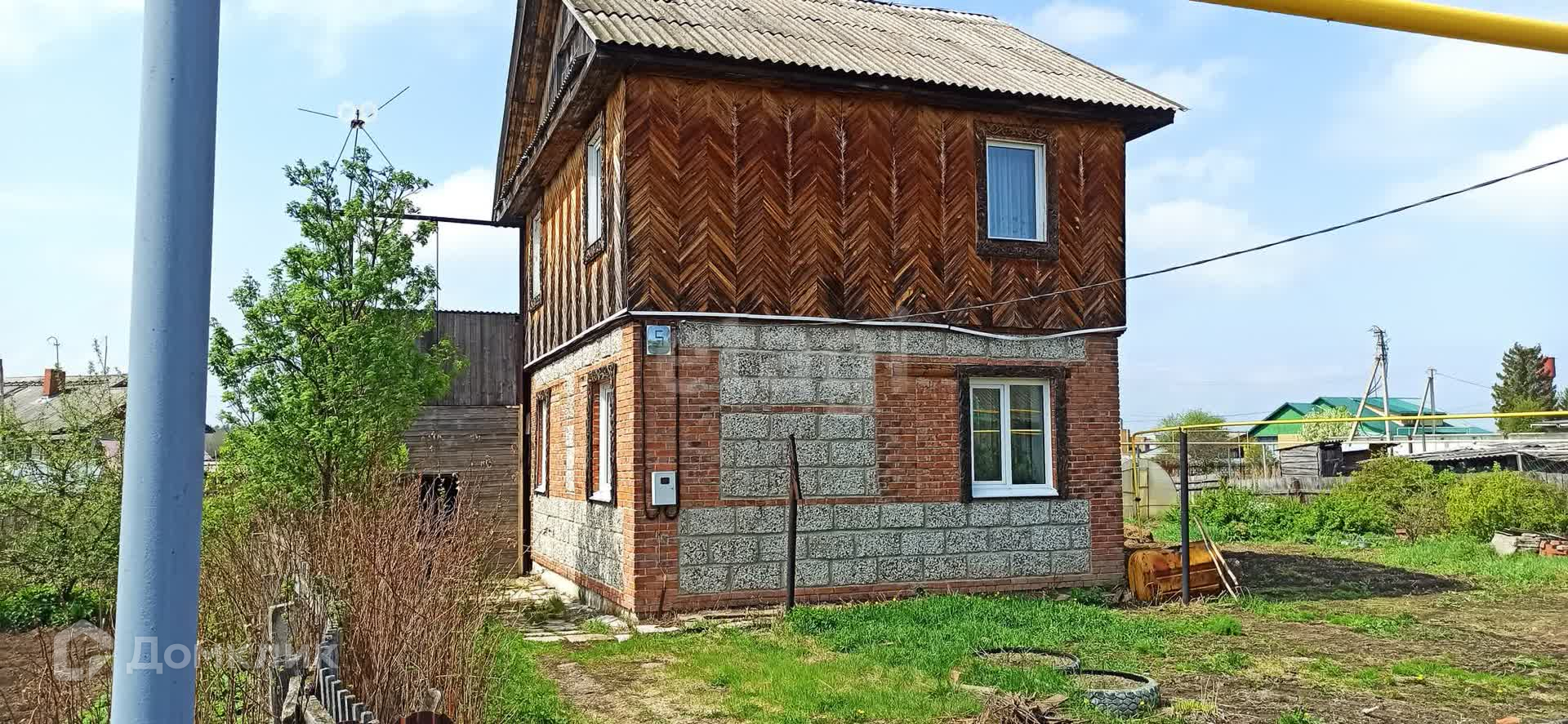 - Первый этаж выполнен из кирпича, что обеспечивает прочность и надежность конструкции, а второй этаж выполнен из дерева, придавая дому уютный и природный вид
