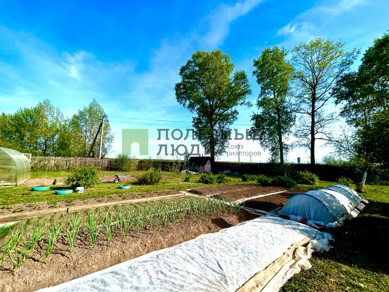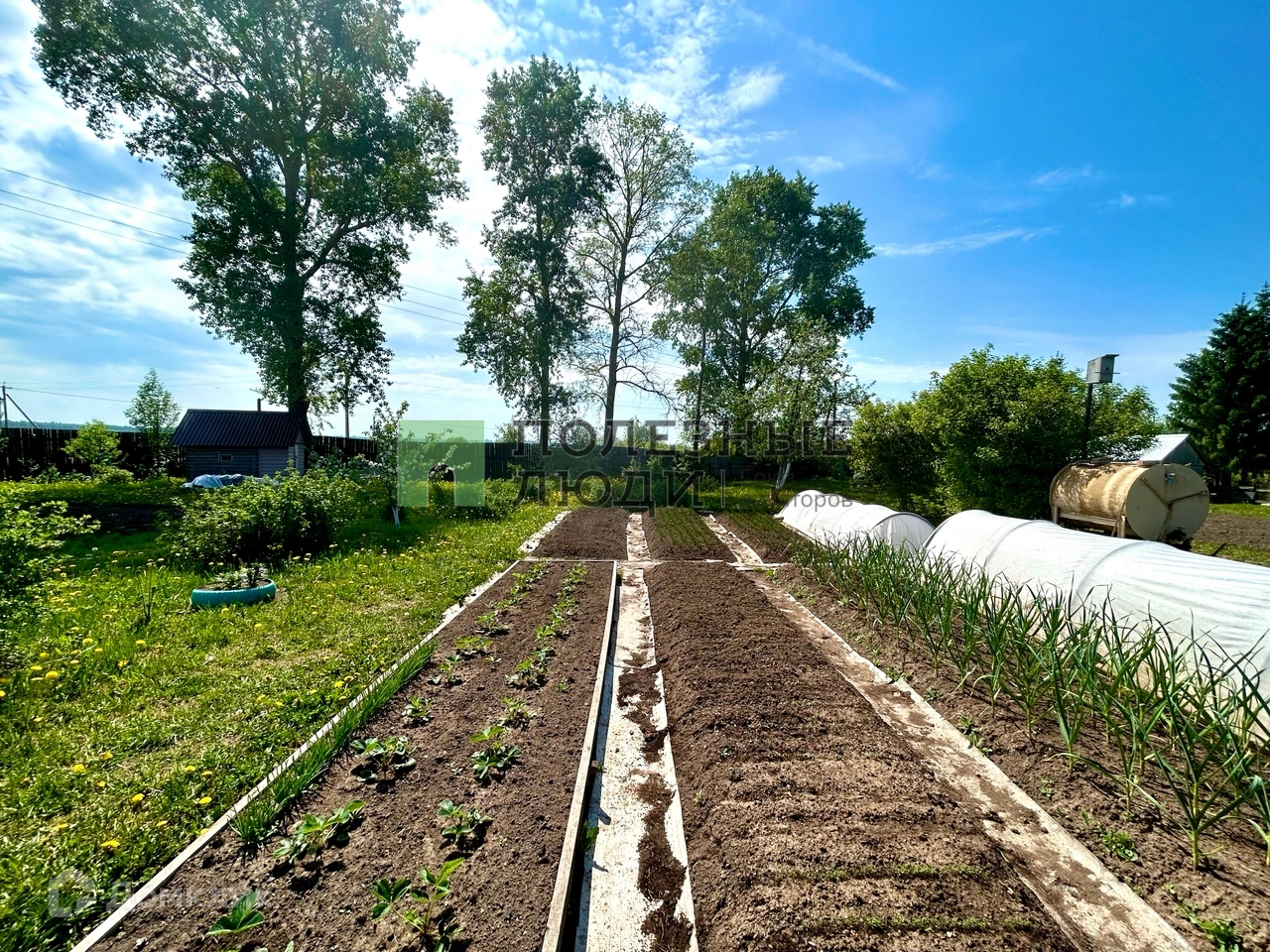 Большое количество гряд с урожаем,парник и теплица.