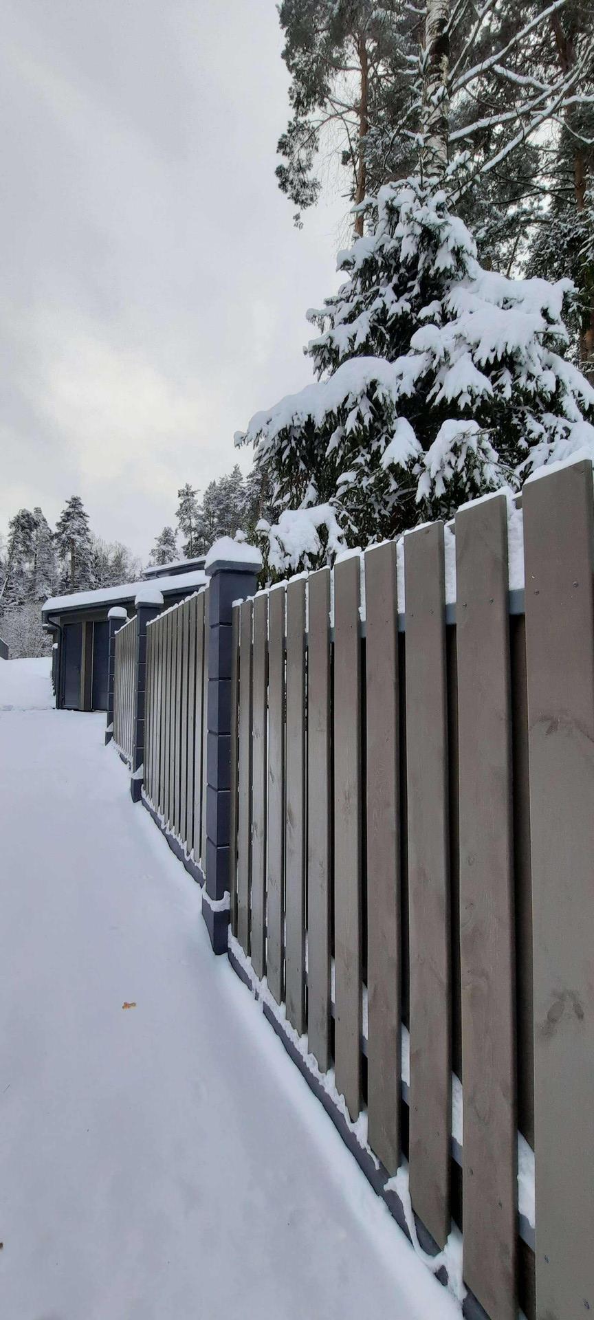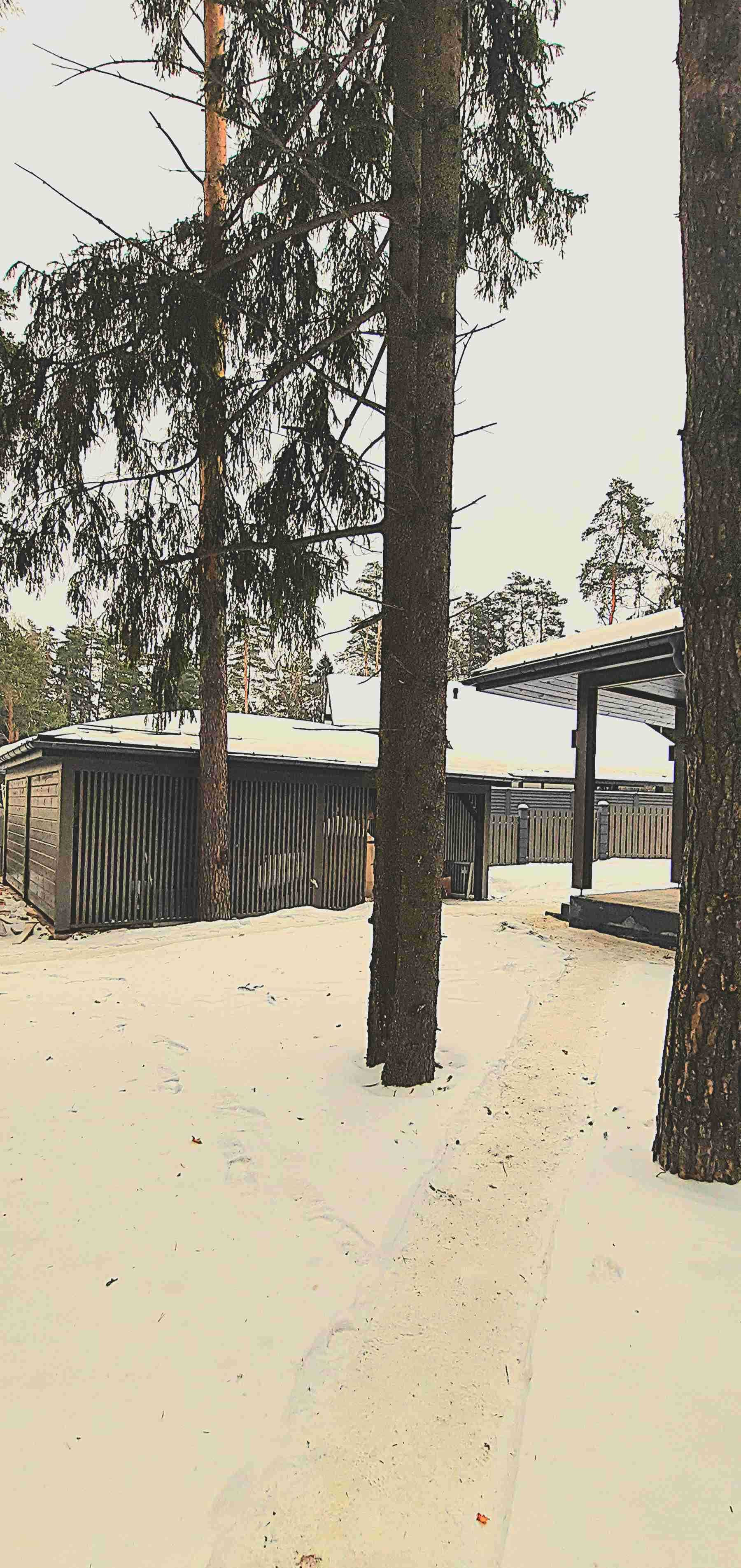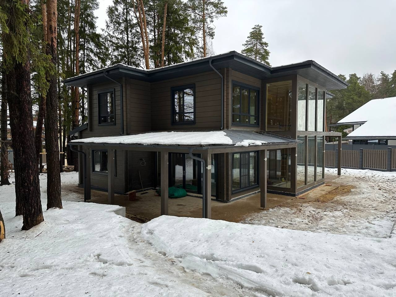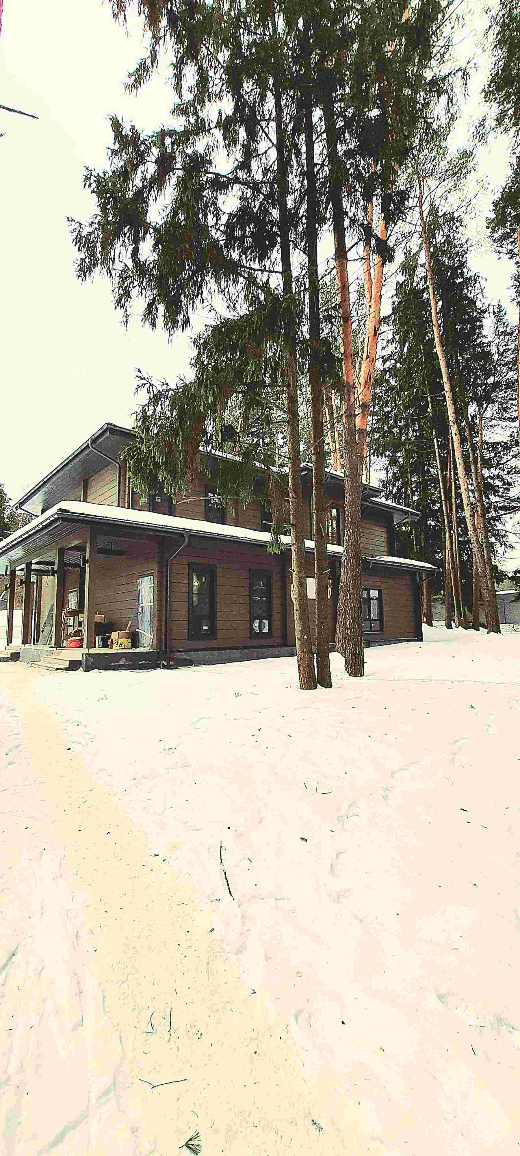 На участке расположен сам дом 307м² и навес, также из клееного бруса, для 2 автомобилей. Большая терраса с уличным освещением. Красивый забор по периметру участка.