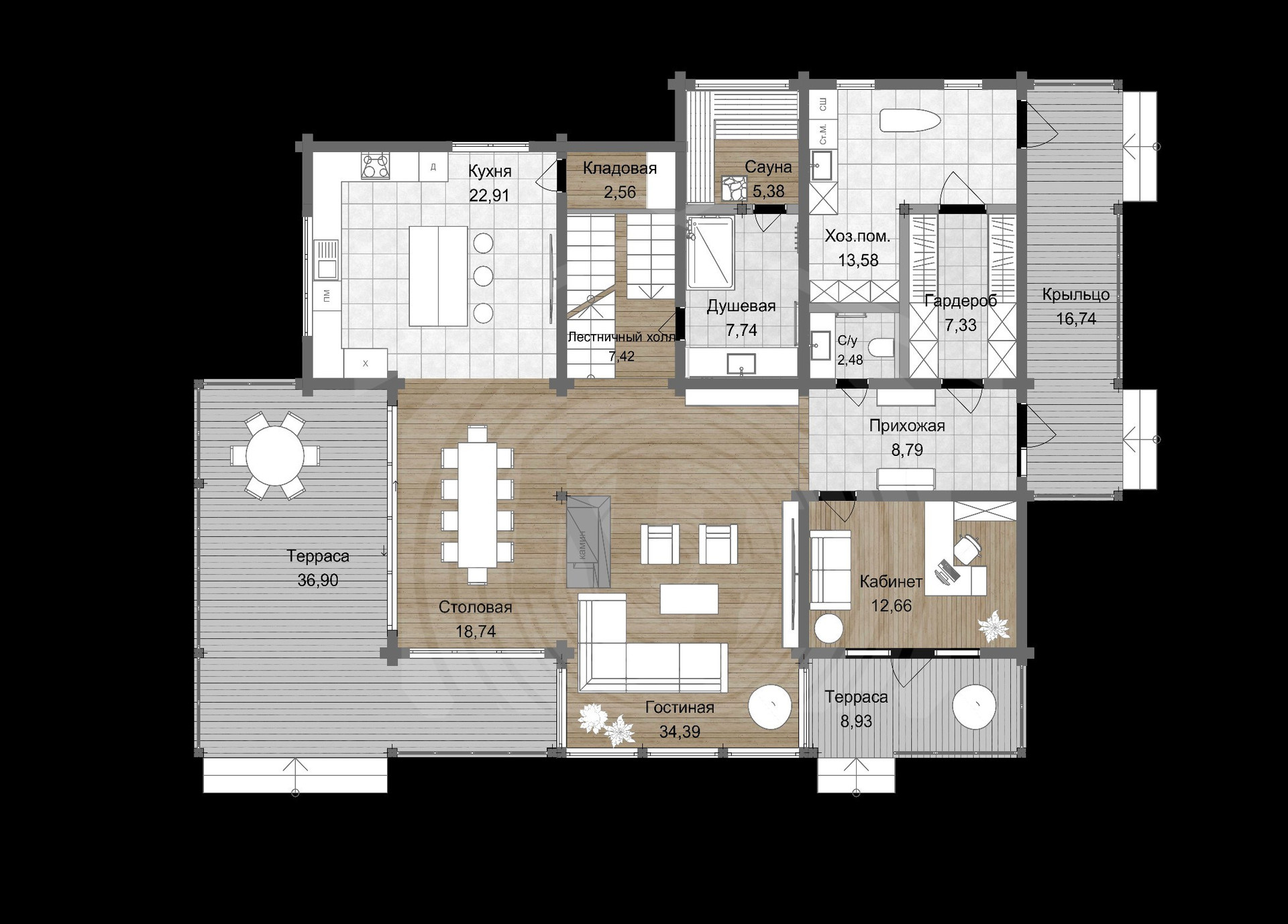 -Душевая (7,74 м2) с сауной (5,38 м2);
