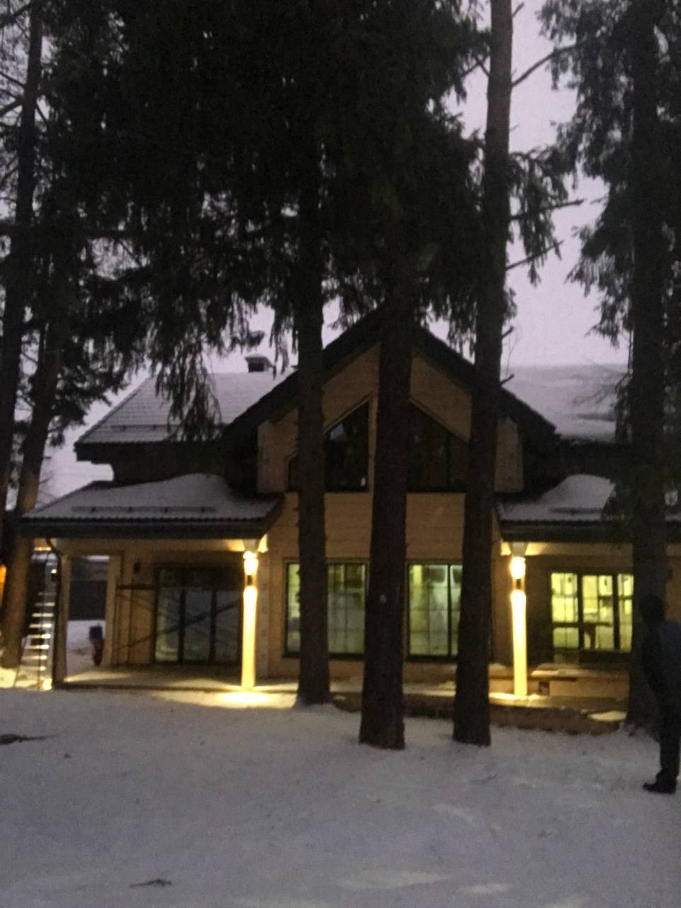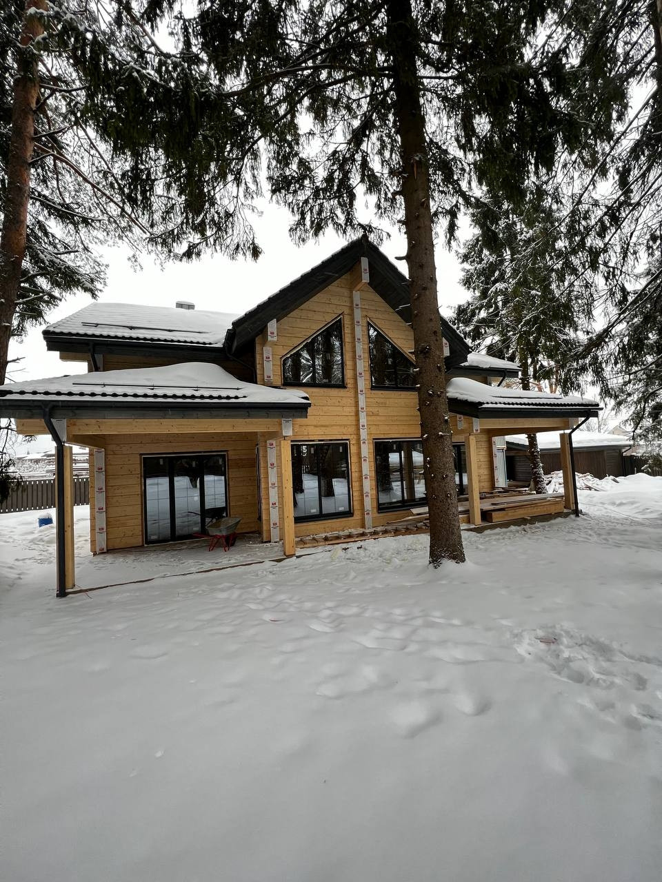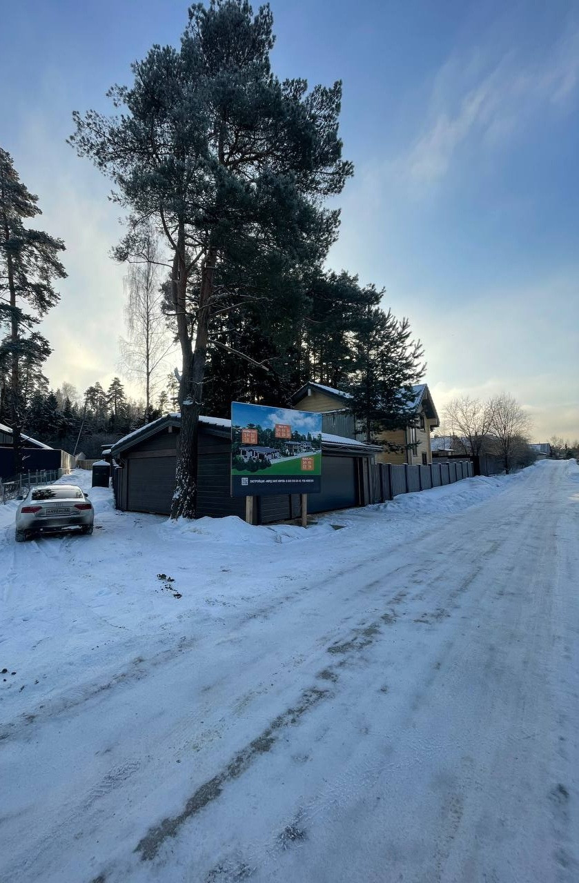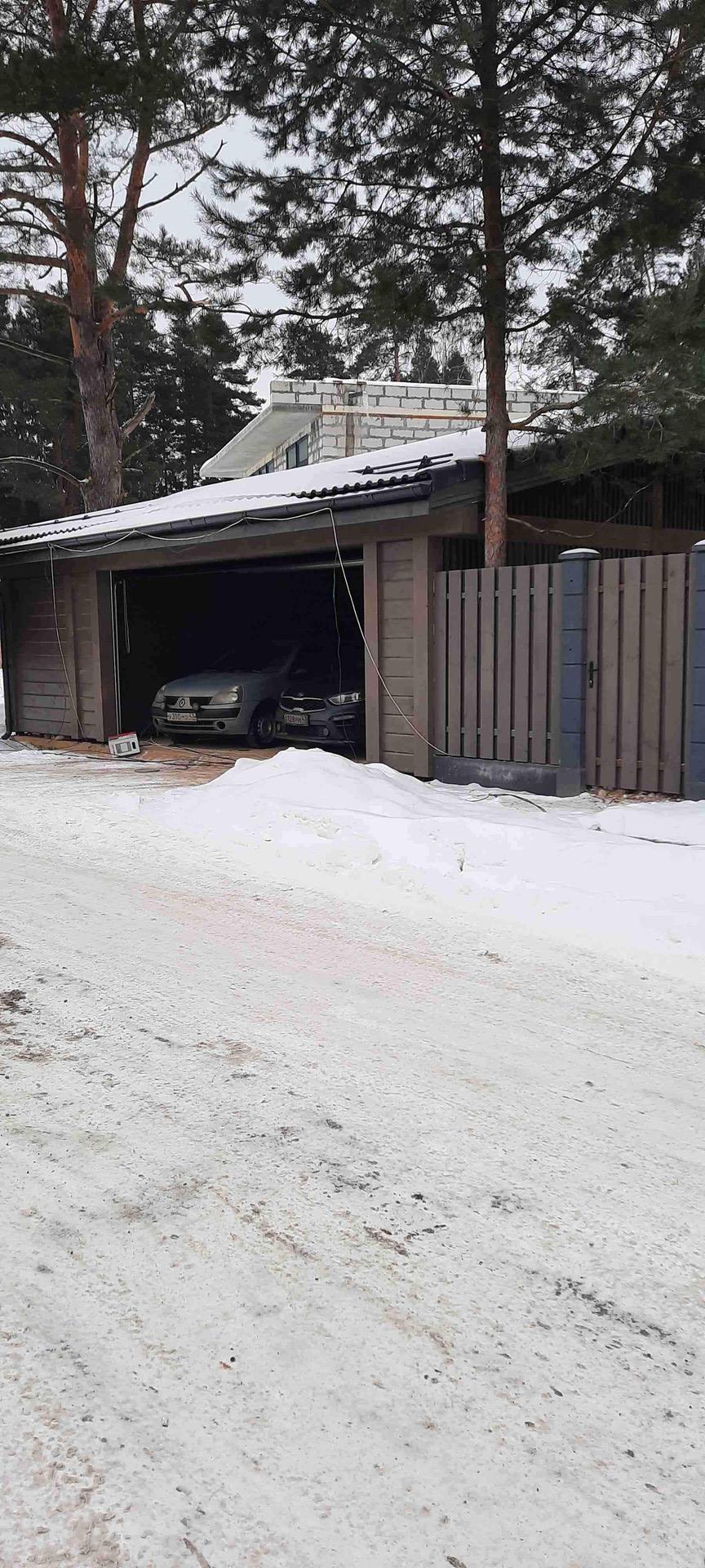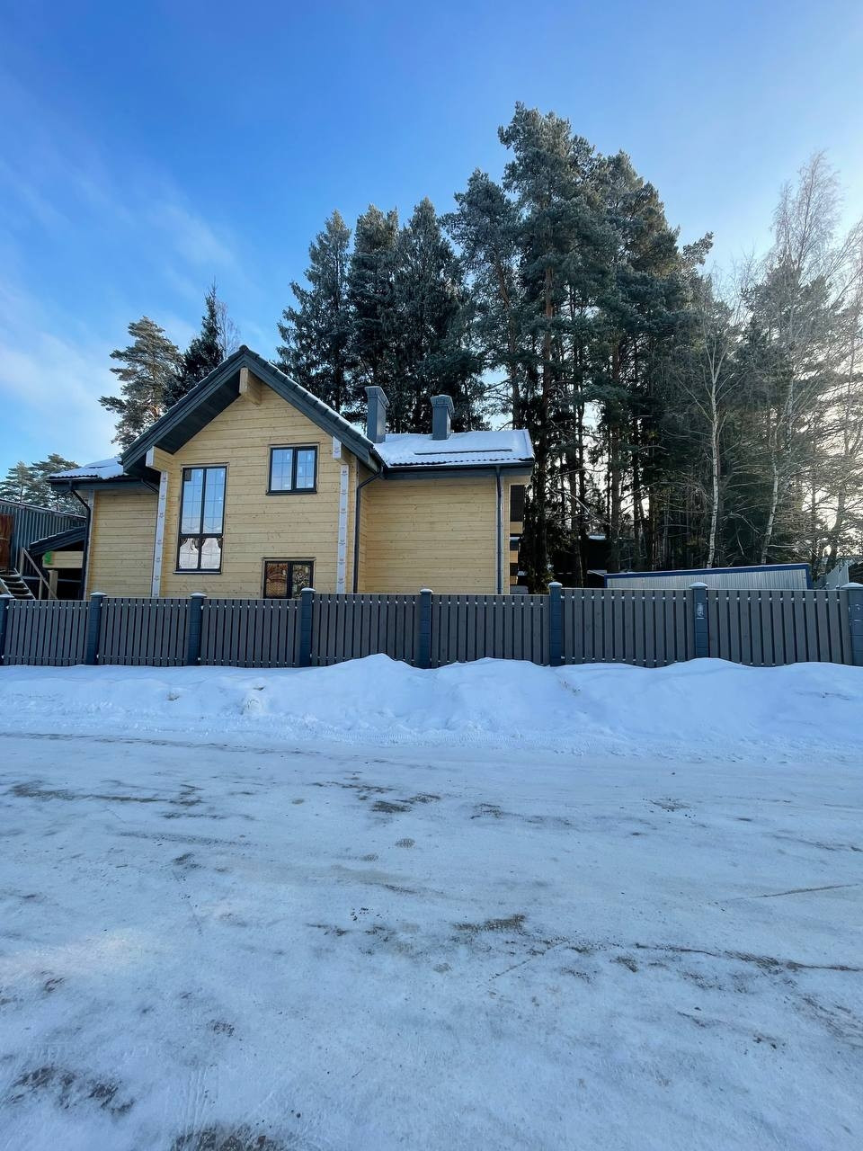 На участке расположен сам дом 230м² и навес, также из клееного бруса, для 2 автомобилей. Большая терраса с уличным освещением. Красивый забор по периметру участка.