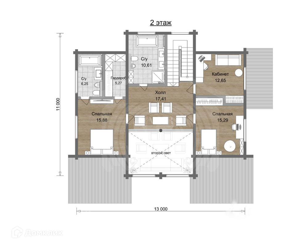 2 этаж: холл (17,41 м²), мастер-спальня (15,88 м²) с санузлом (6,25 м²) и гардеробом (5,27 м²), спальня (15,29 м²), кабинет (12,65 м²), санузел (10,61 м²), второй свет.