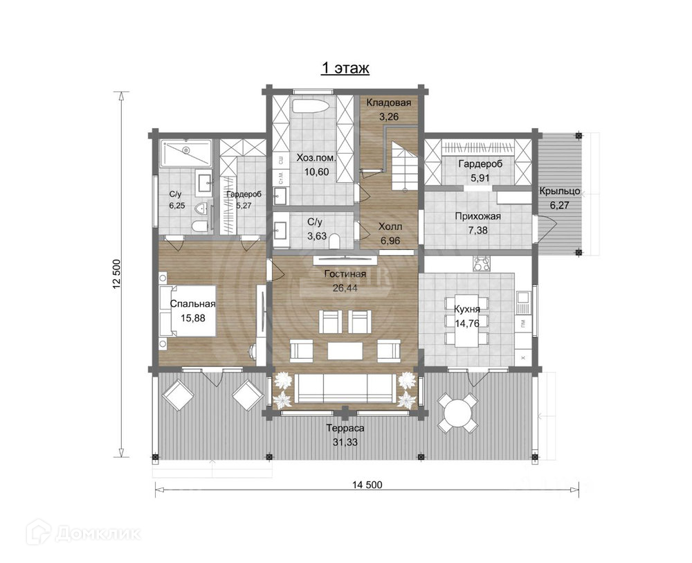 1 этаж: росторная гостиная (26,44 м²) с большими панорамными окнами, зона кухни (14,76 м²), спальня (15,88 м²) с гардеробом (5,27 м²) и санузлом (6,25 м²), хоз. помещение, прихожая (7,38 м²) с гардеробом (5,91 м²), терраса (31,33 м²)