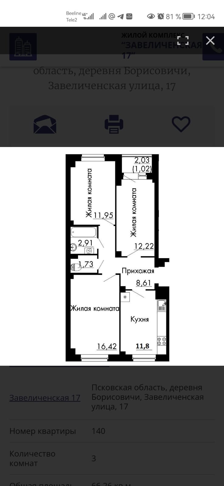 3-комнатная квартира, 66 м2, этаж 9 / 9, на продажу в деревне Борисовичи, Завеличенская улица, 17
