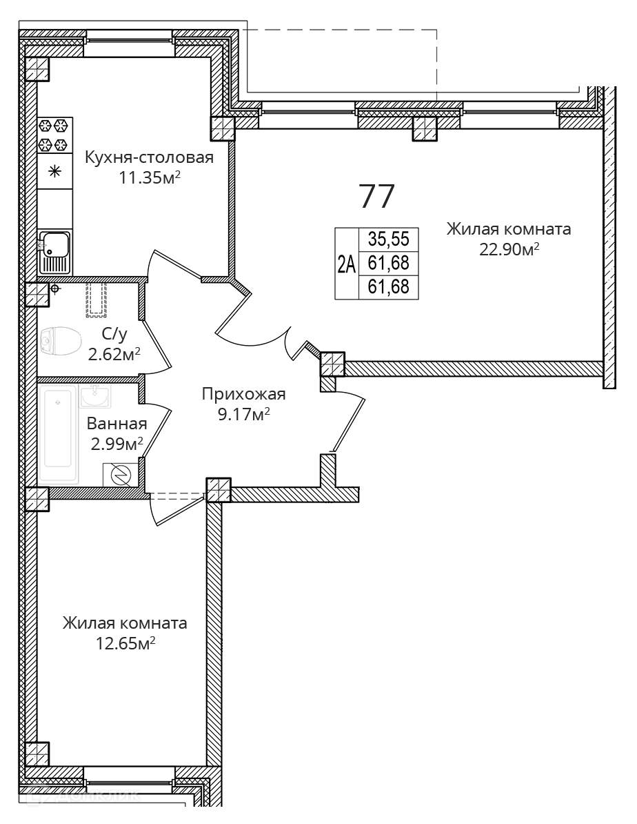 Продается 2-комнатная квартира, 61.68 кв. м, по адресу Россия, Псковская область, Псковский район, д. Борисовичи, ул. Завеличенская, д. 26, 26. Этаж 1/9.
