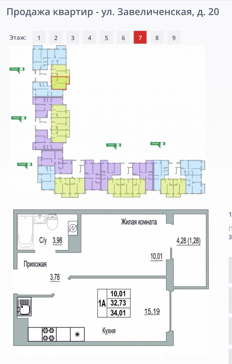 1-комнатная квартира, 34.1 м2, этаж 7 / 9, на продажу в деревне Борисовичи, Завеличенская улица, 20