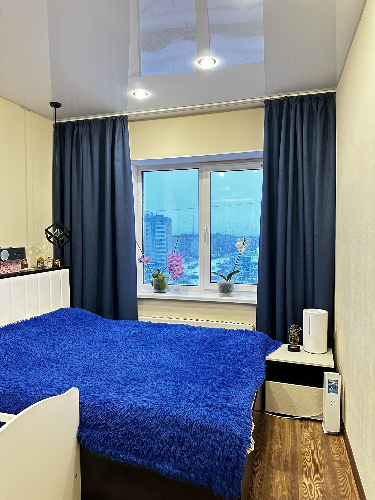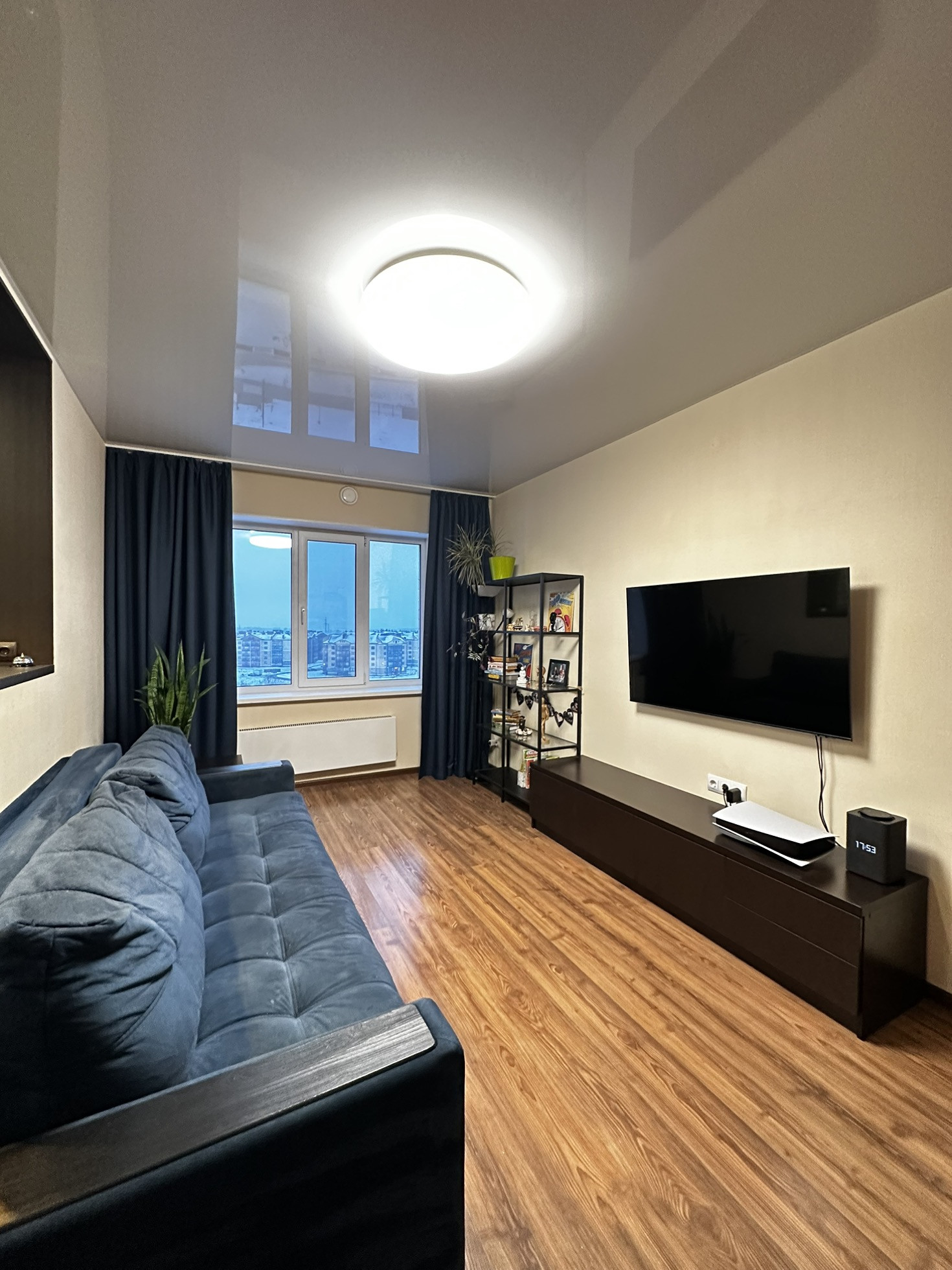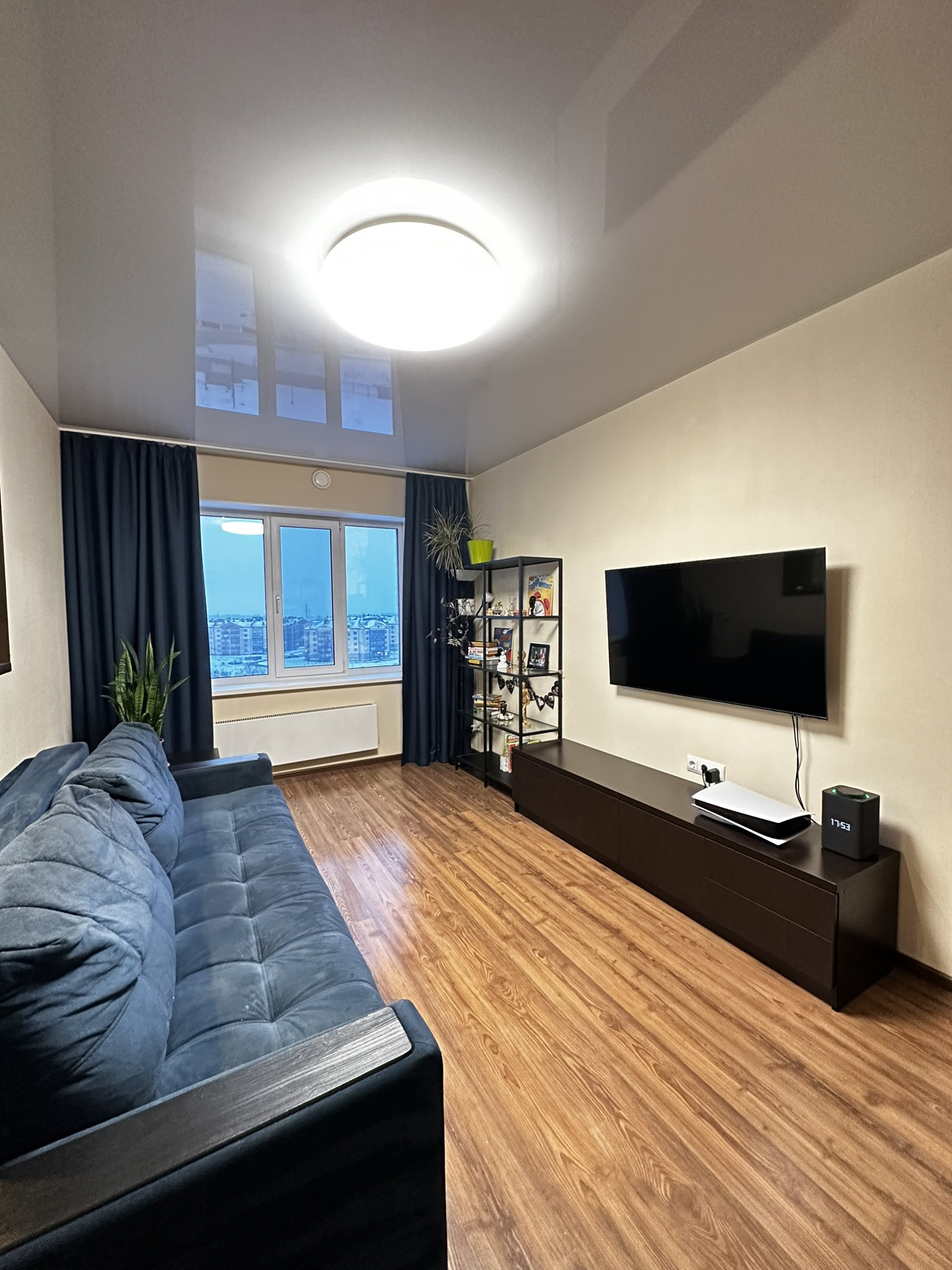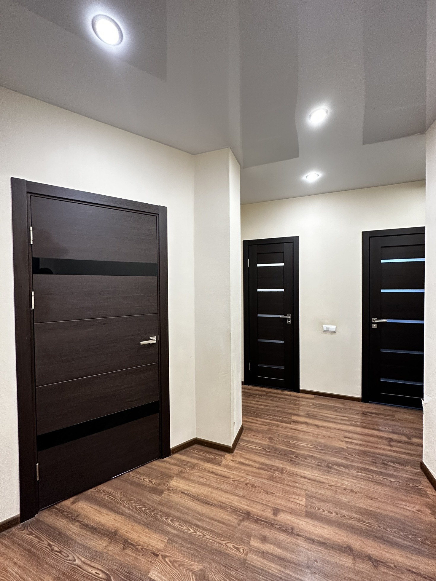 ✨Потолки натяжные со встроенными светильниками и люстрой.