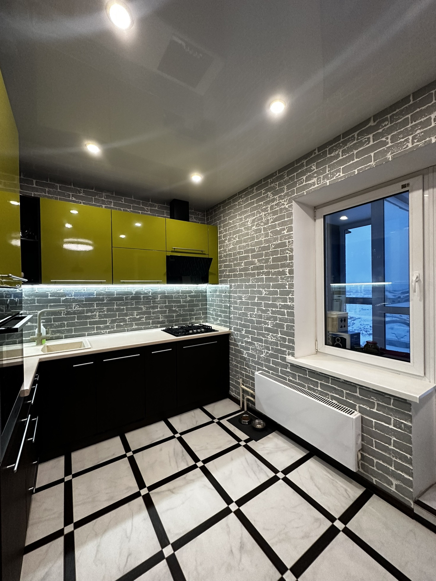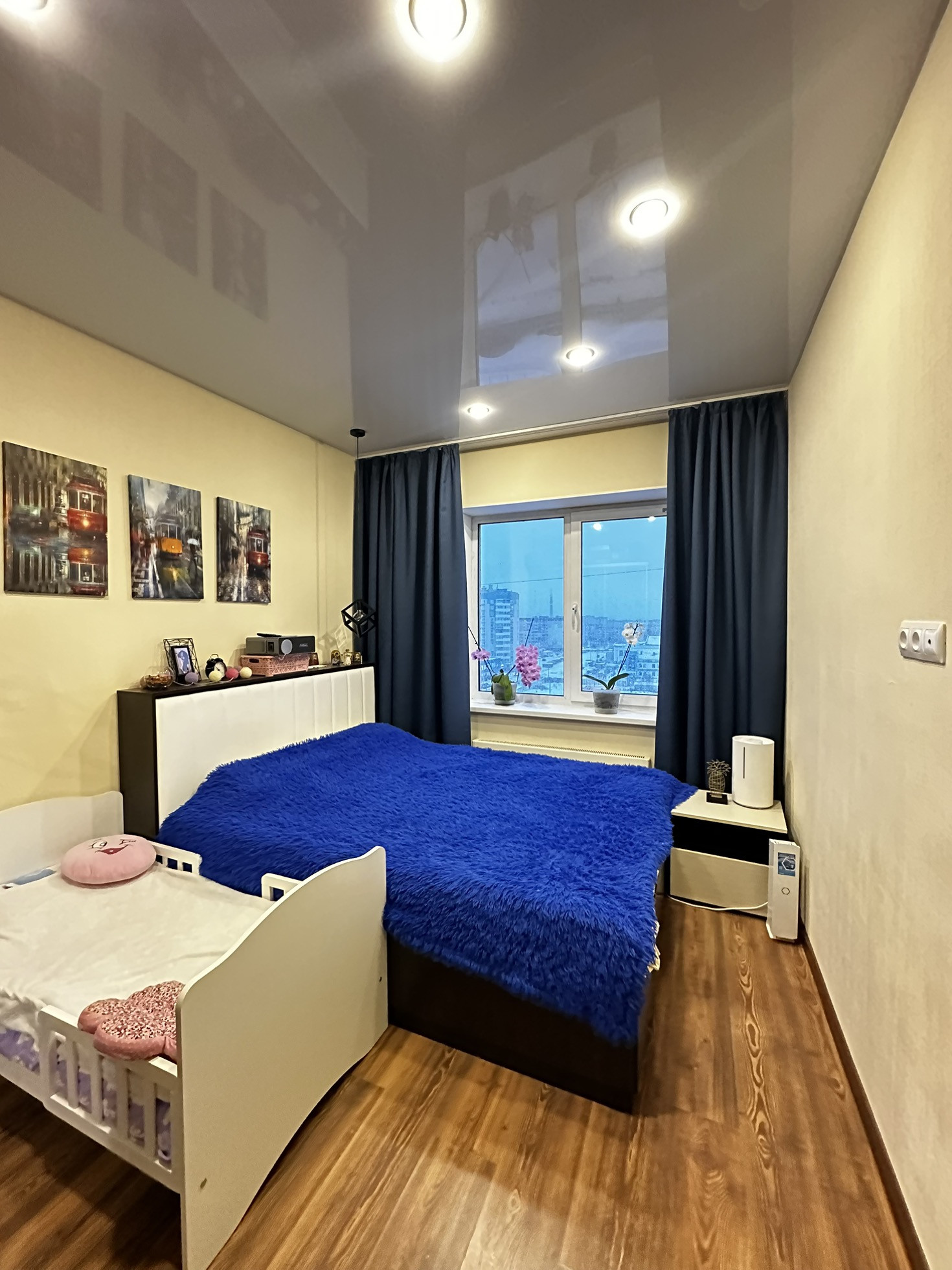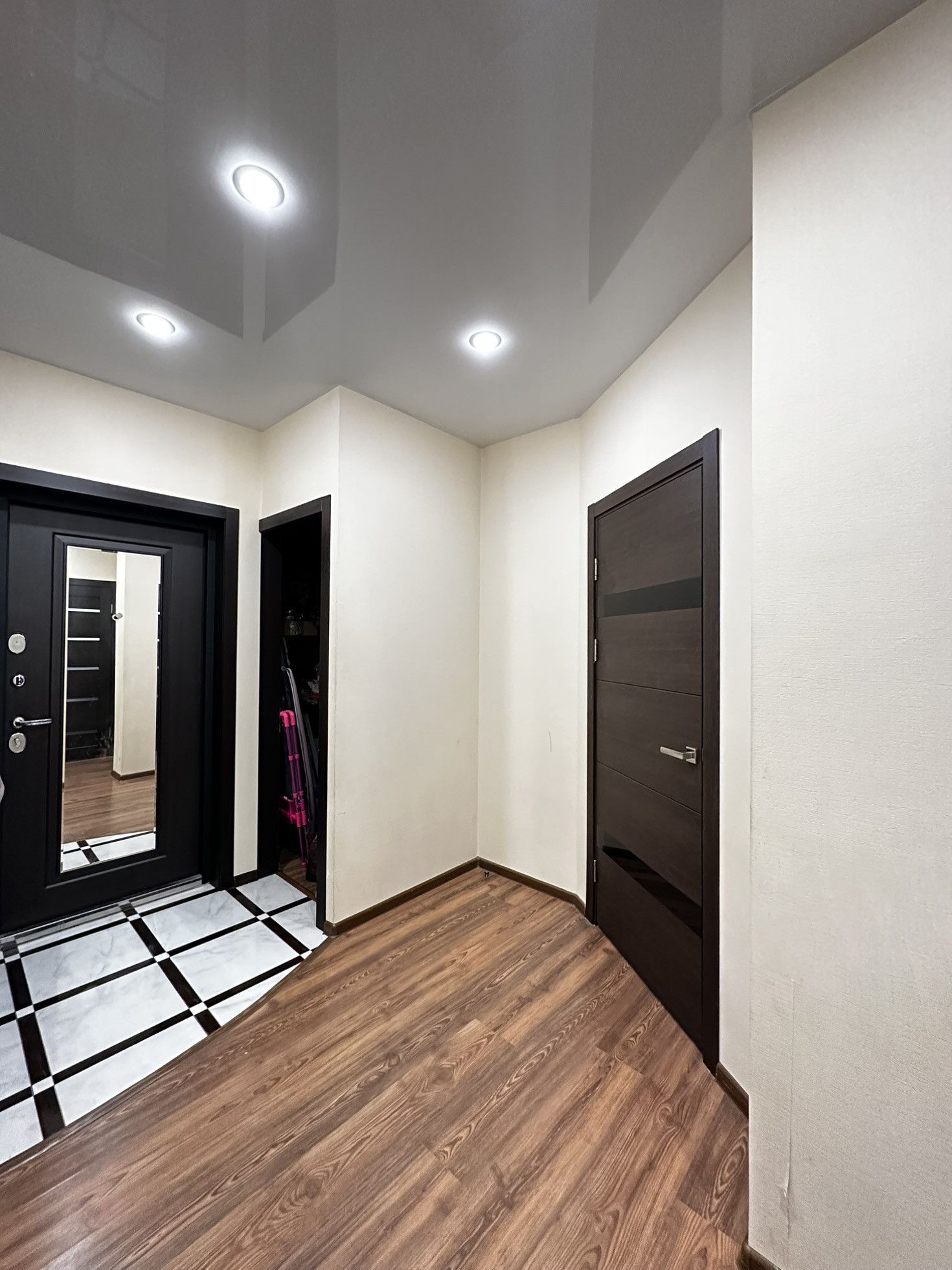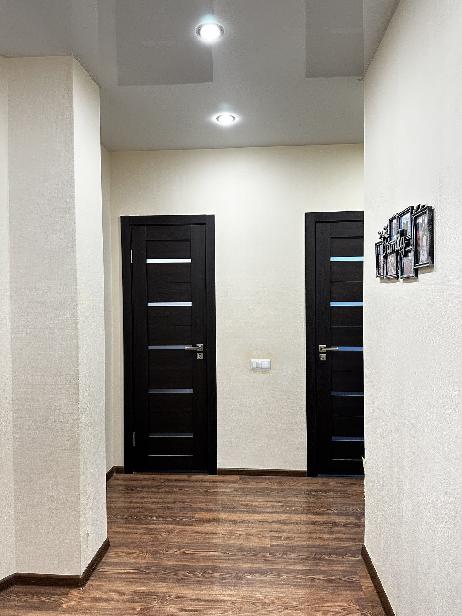 ✨Потолки натяжные со встроенными светильниками и люстрой.