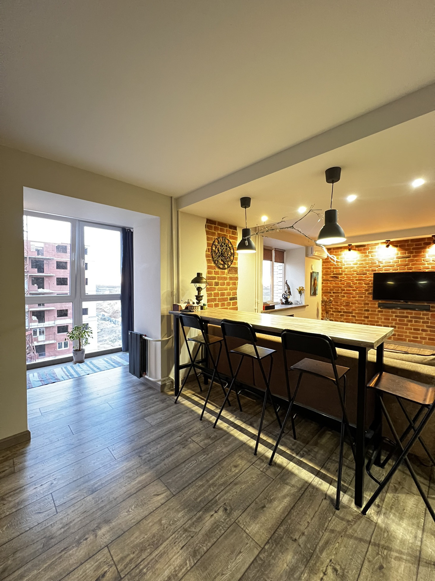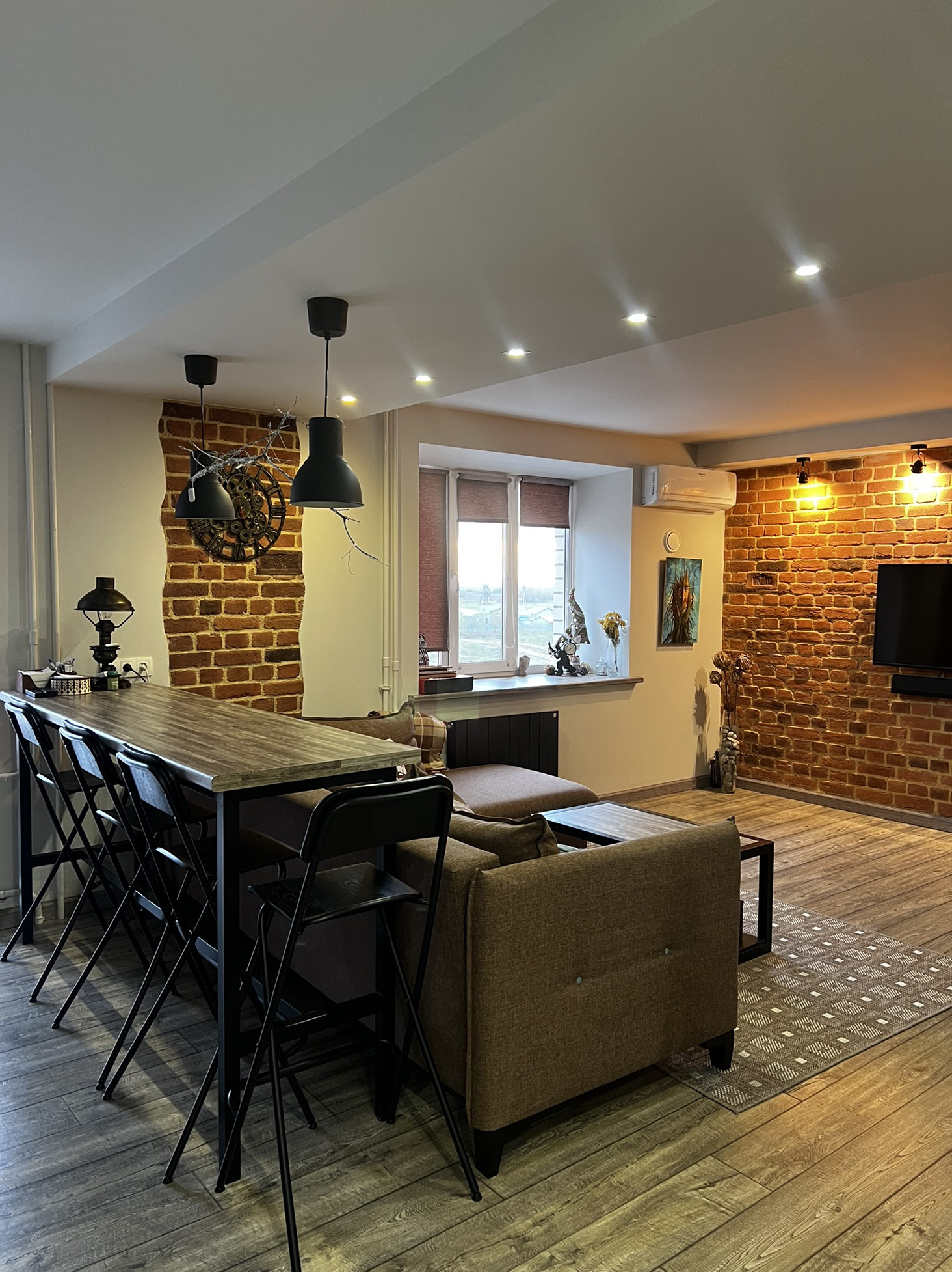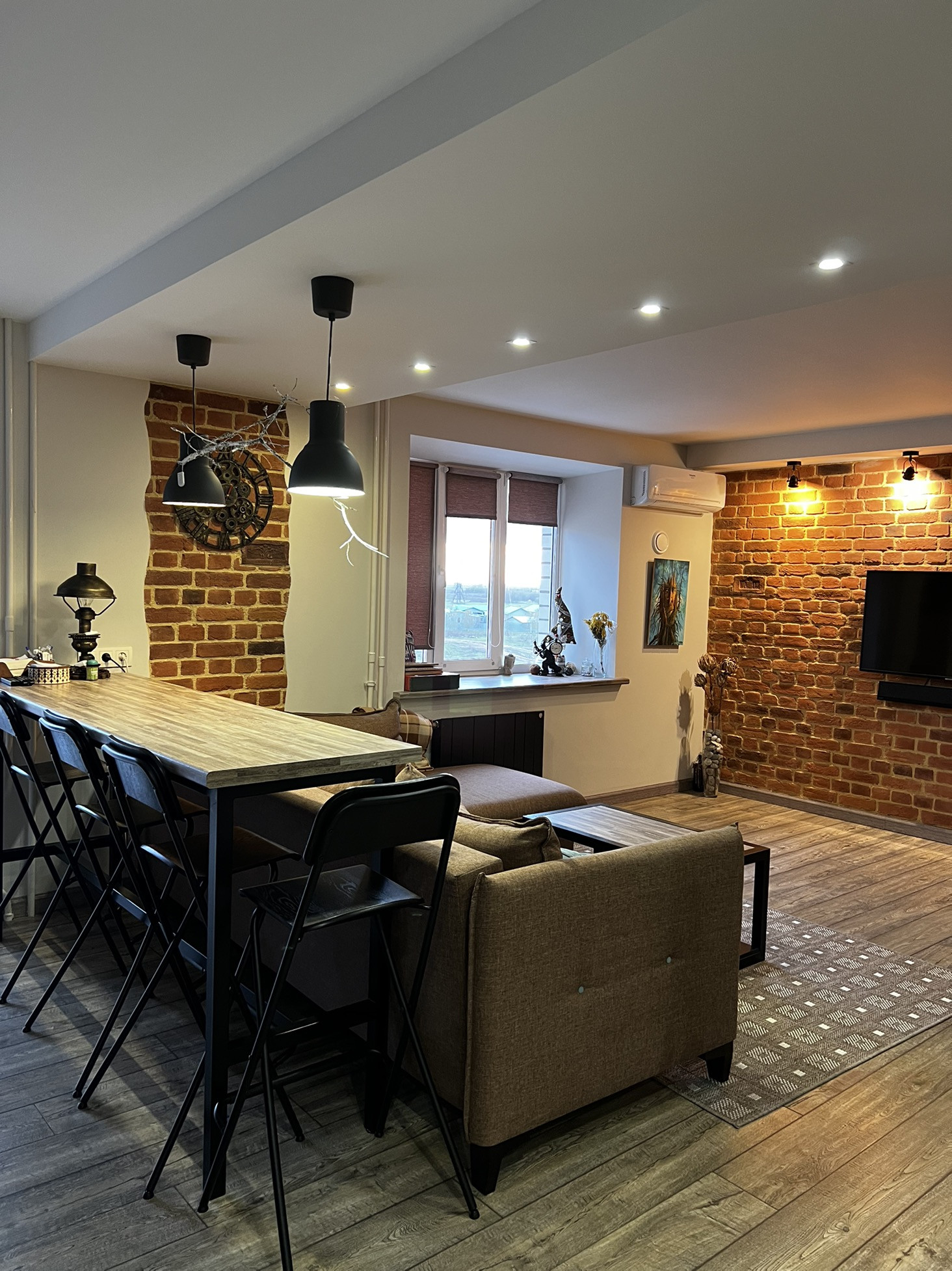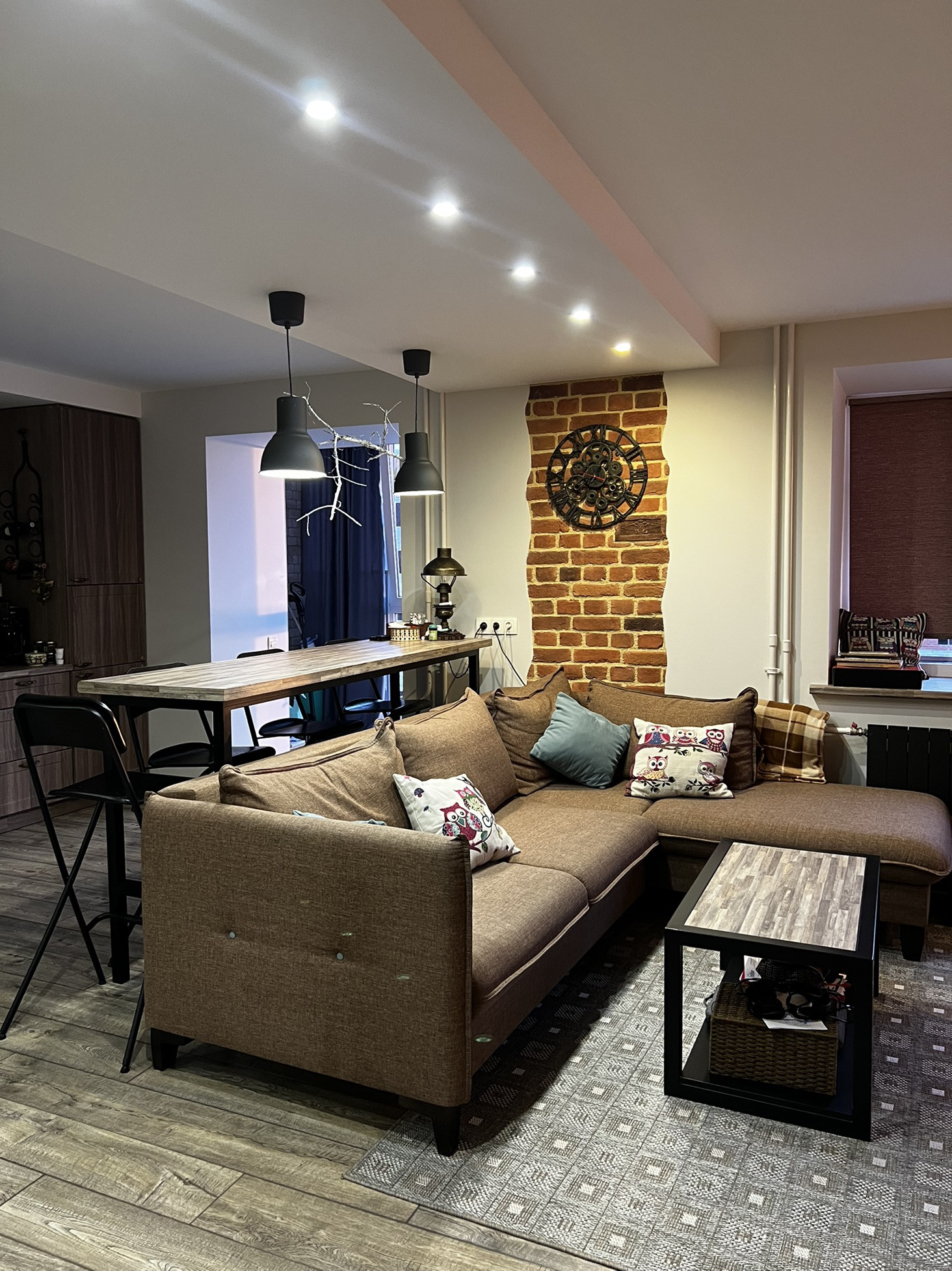 ✨В гостиной барная стойка, журнальный стол ,подоконник - выполнены из одних материалов, что подчеркивает красоту и эстетикe данного пространства!