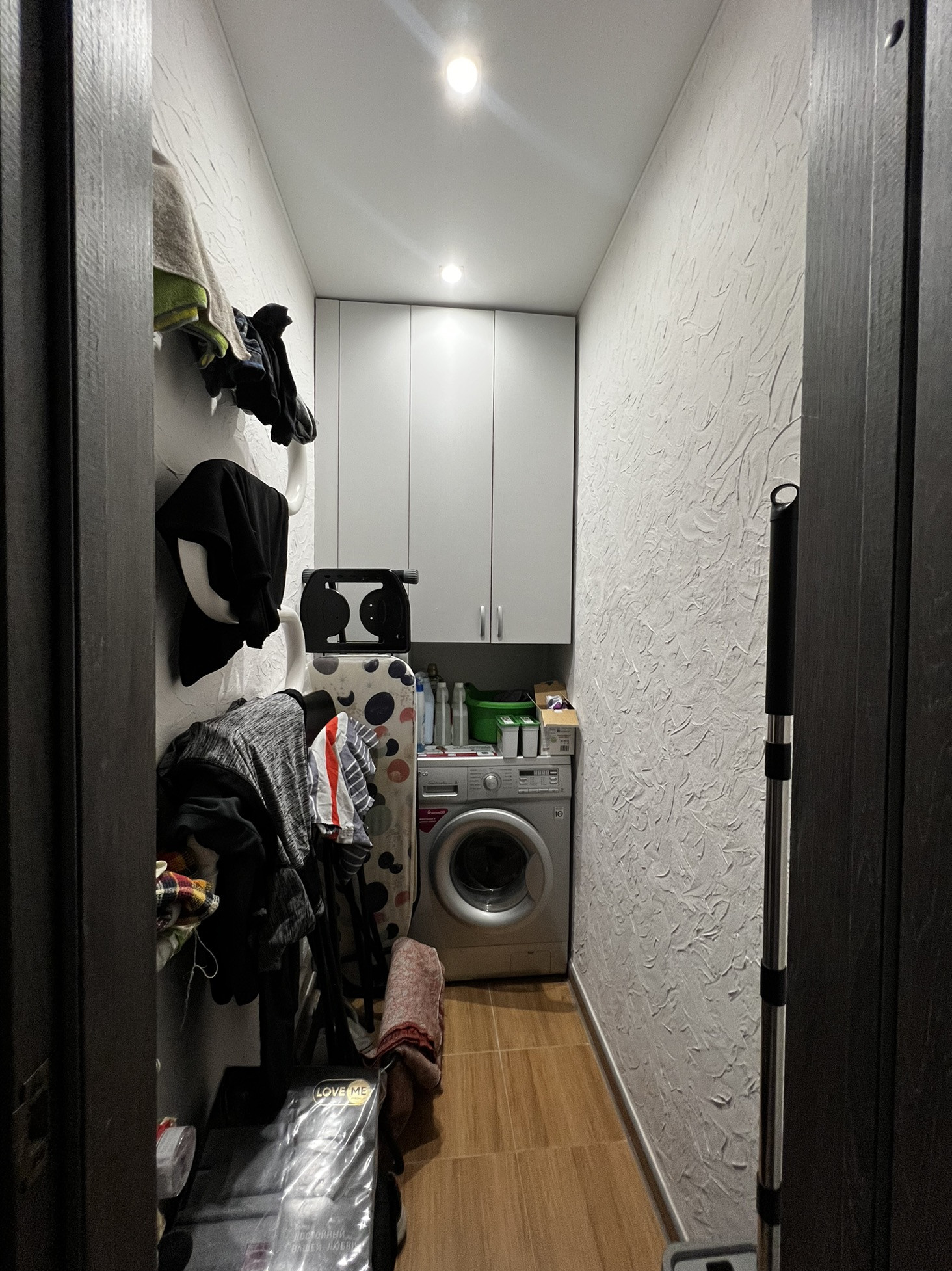 Туалет - 1,7 м2 - переоборудован под прачечную (со шкафами, стиральной машиной и местами для глажки и сушки белья)