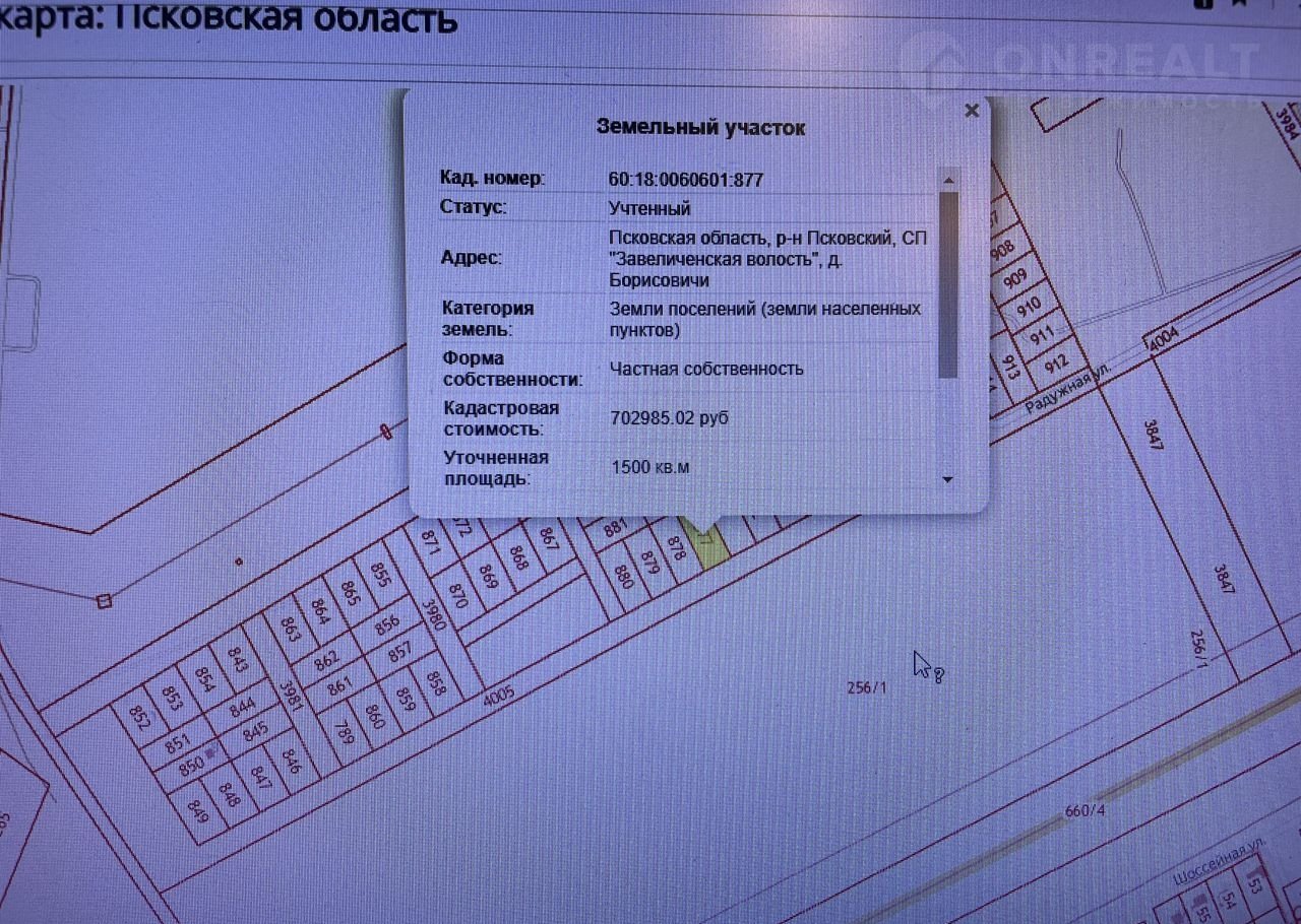 Продается земельный участок в деревне Борисовичи (Псковский район), близлежащее расположение от города - 2-3 минуты, ИЖС, 15 соток КД 60:18:0060601:877