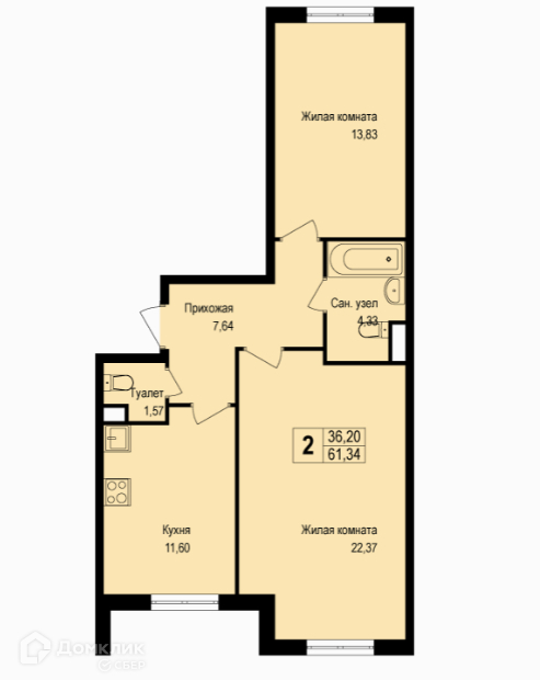 Общая площадь 61.34 м2