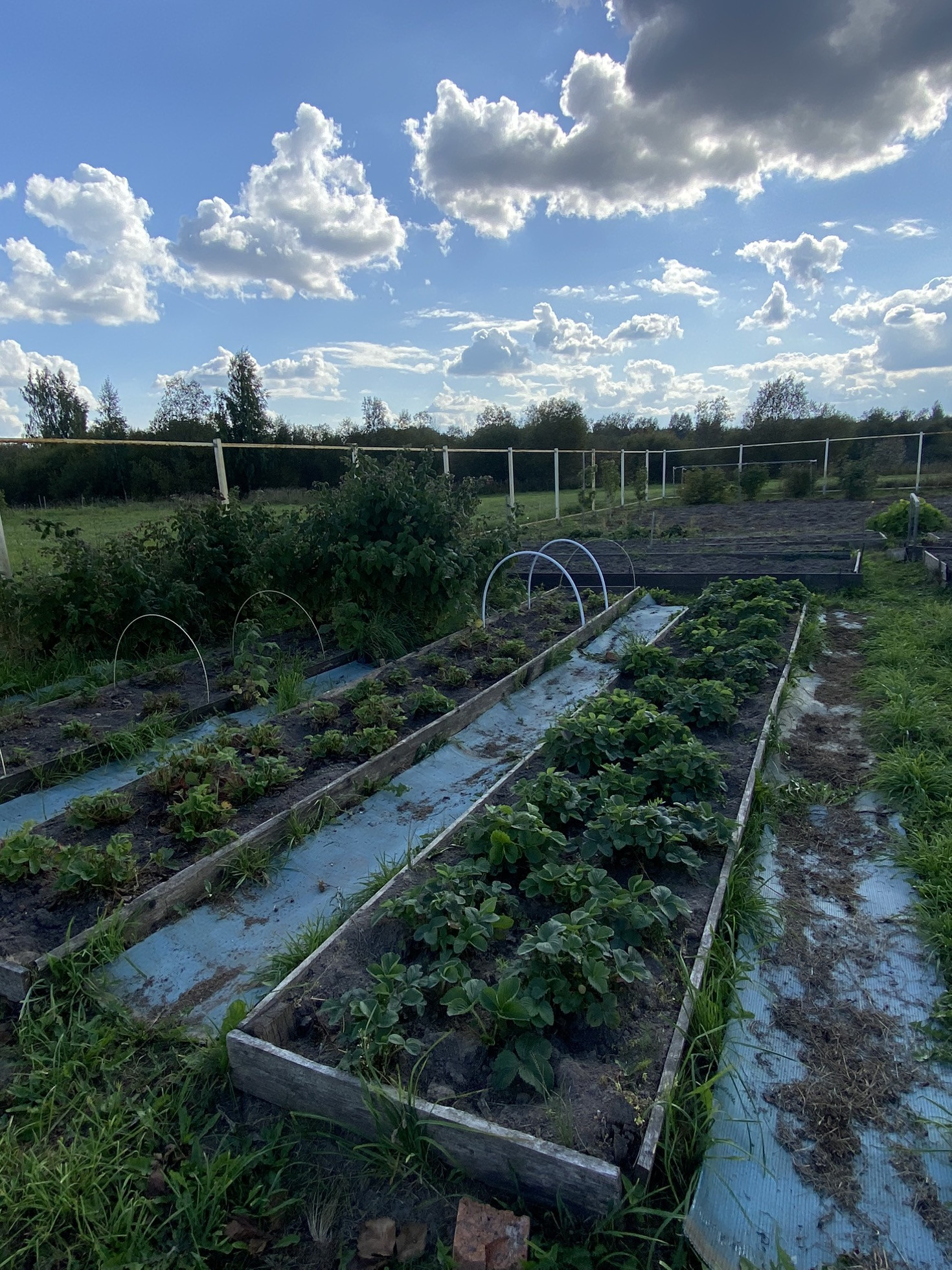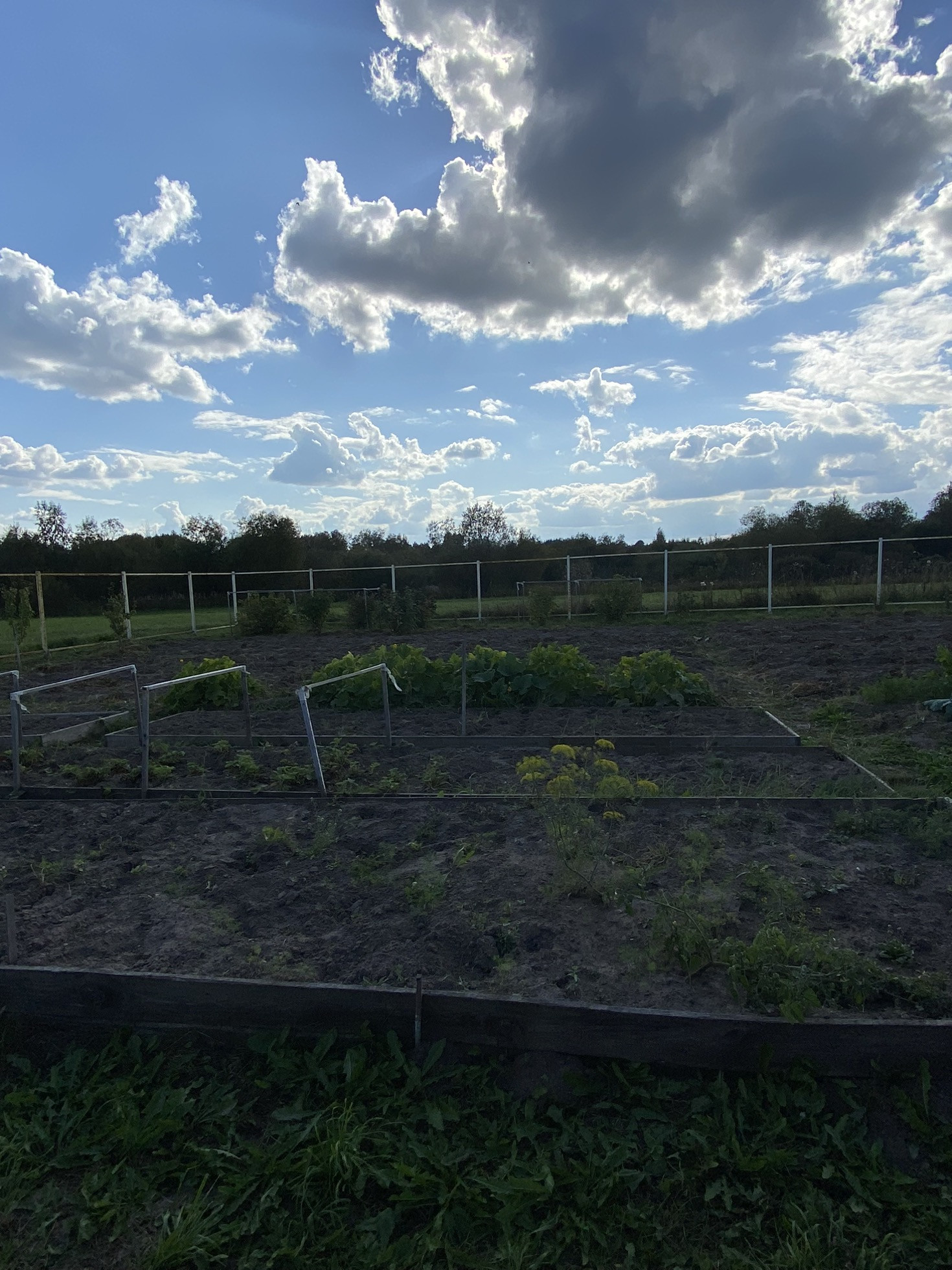 Территория участка подготовлена к установке забора (вкопаны столбы и установлен металлический каркас) с воротами.