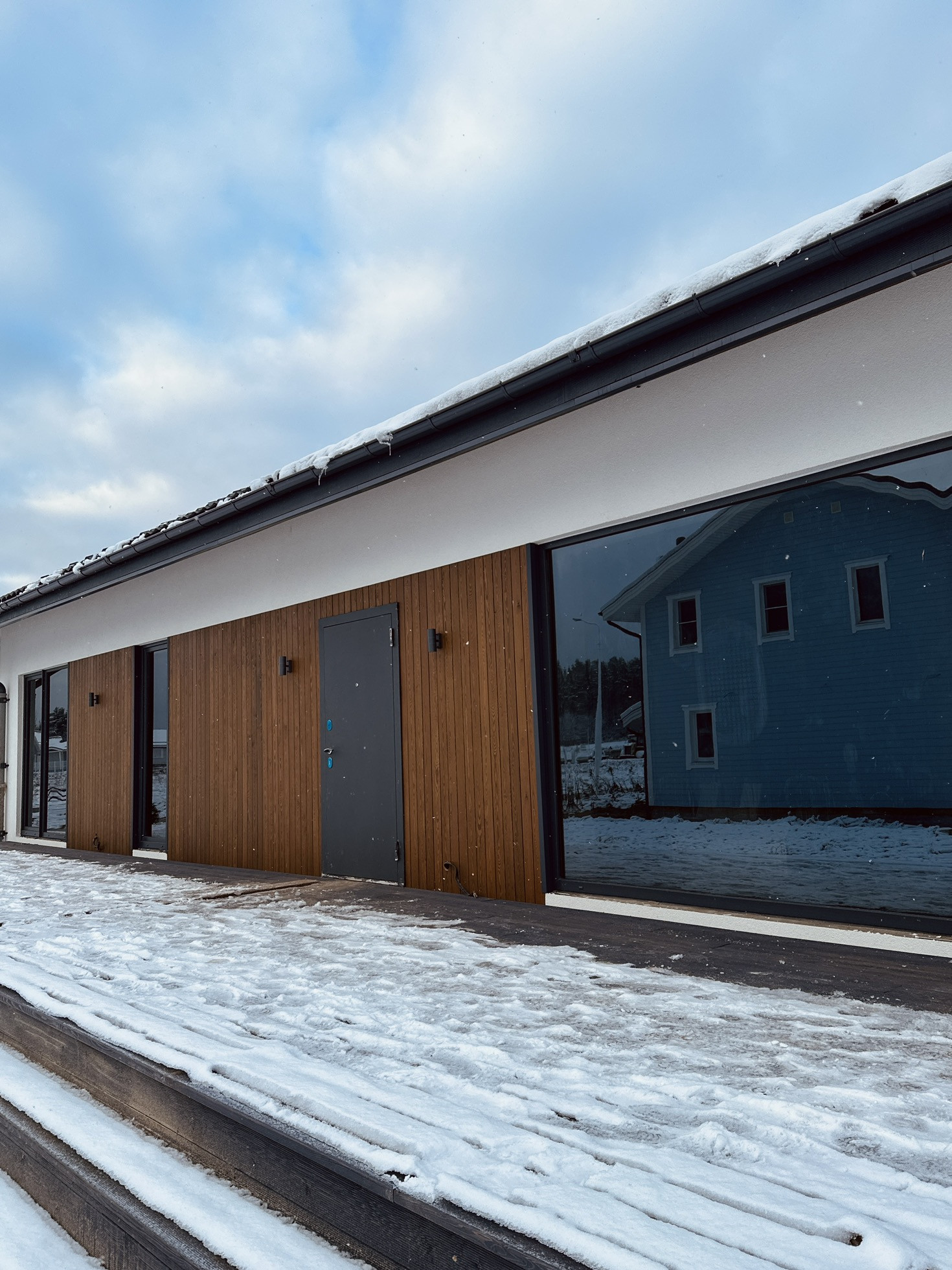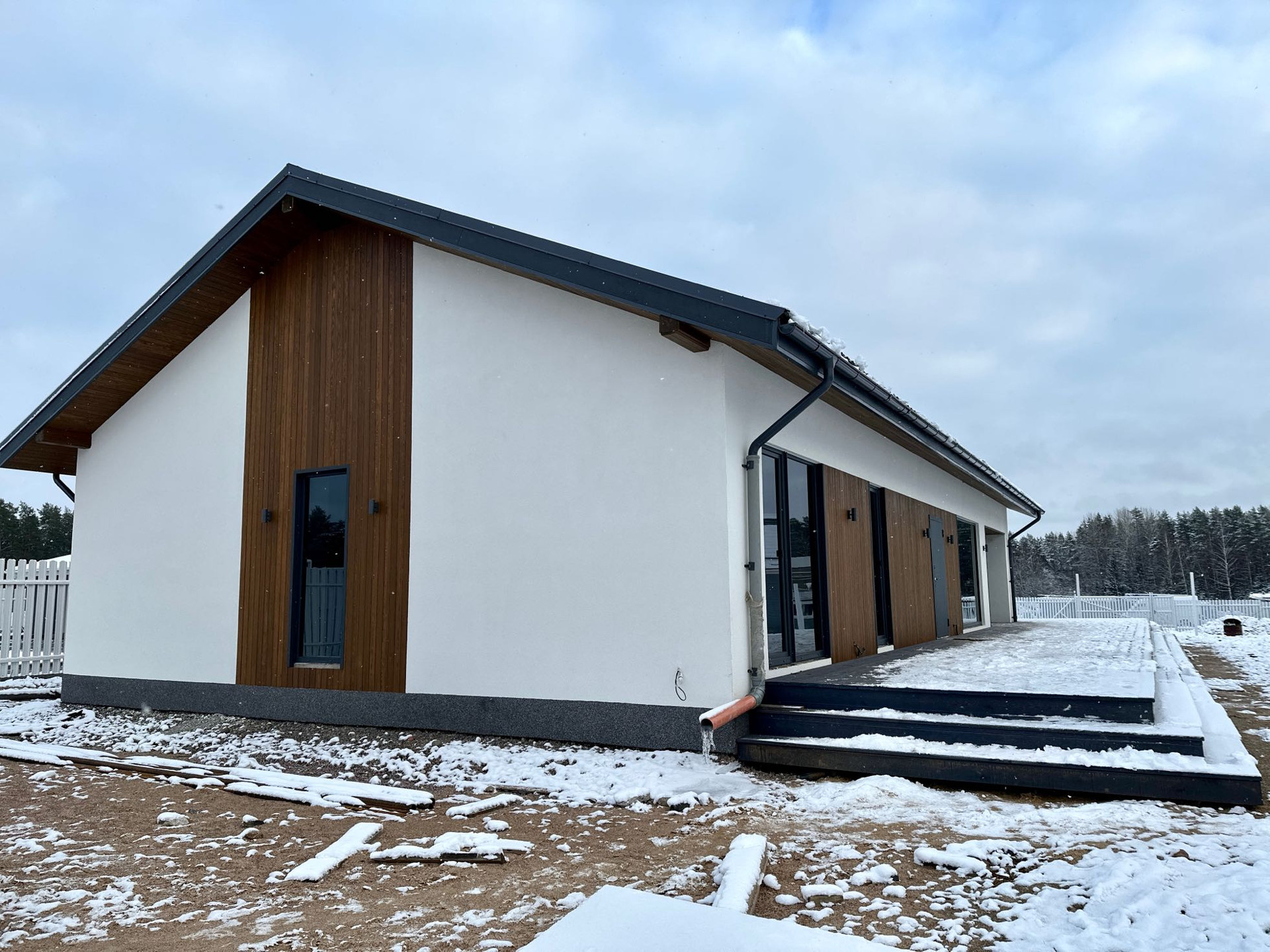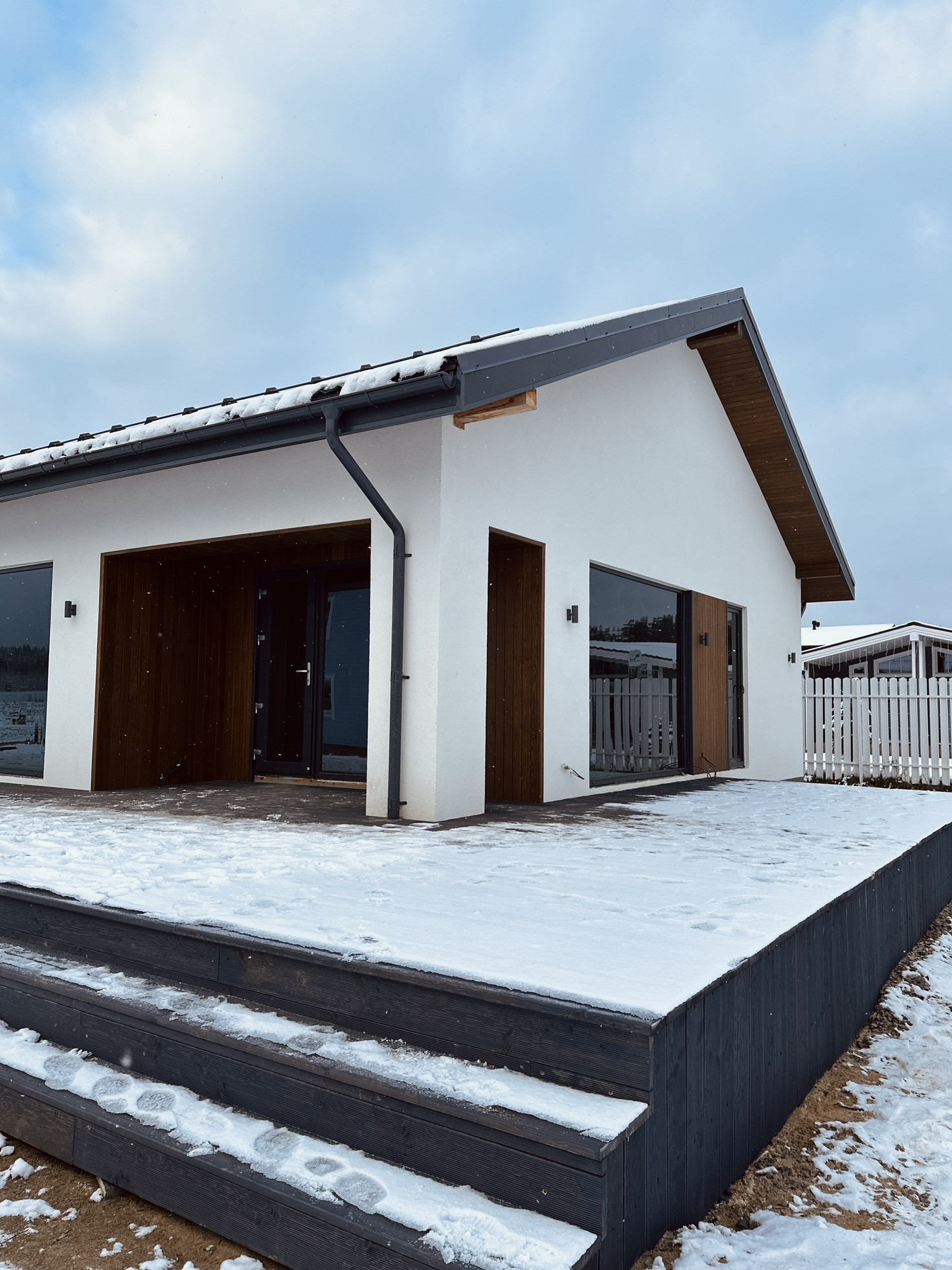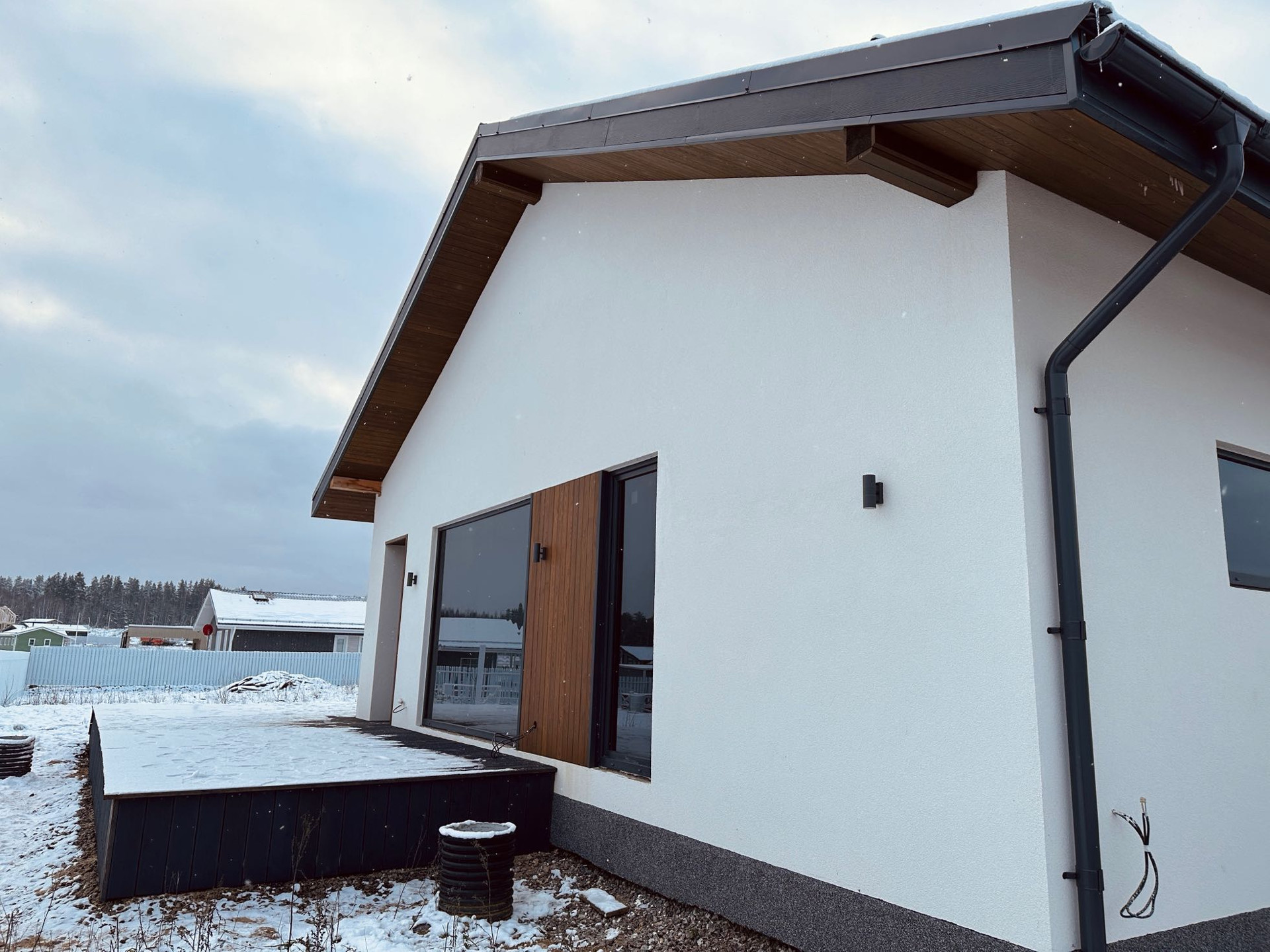 Терасса — покрыта лиственницей (вельвет), так же ошлифована и покрашена на производстве в цвет кровли и окон RAL 7024. Часть террасы располагается на плите 300 мм для последующей возможности создания всезенной террасы с остеклением и утеплением.