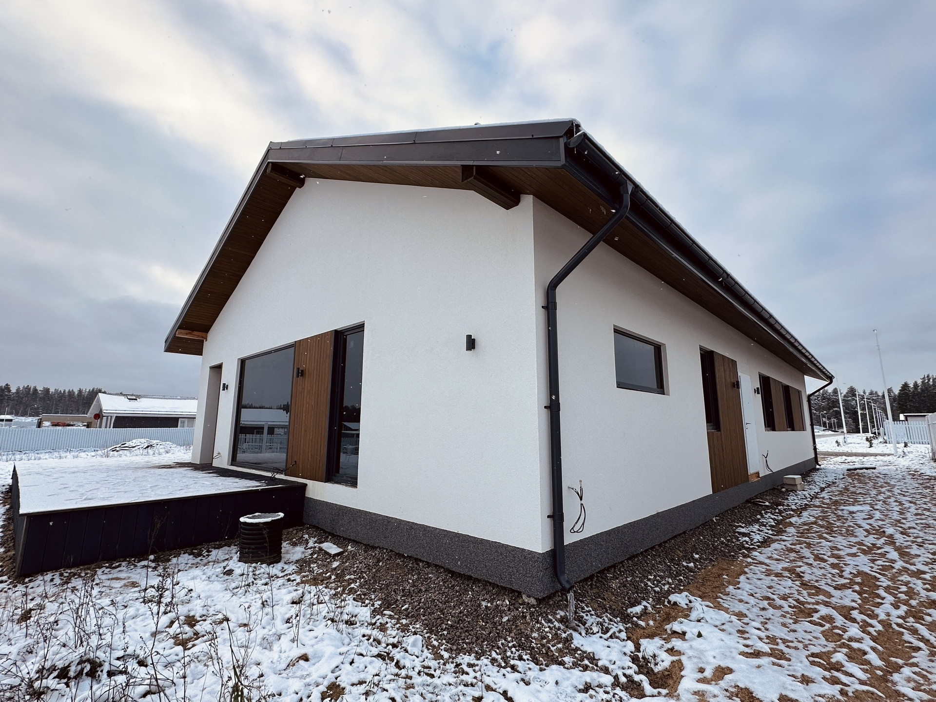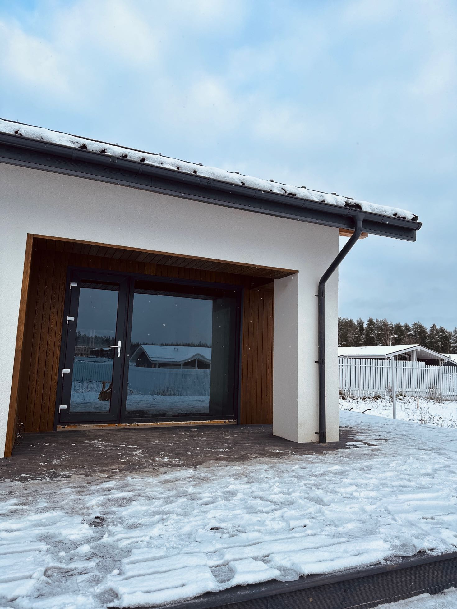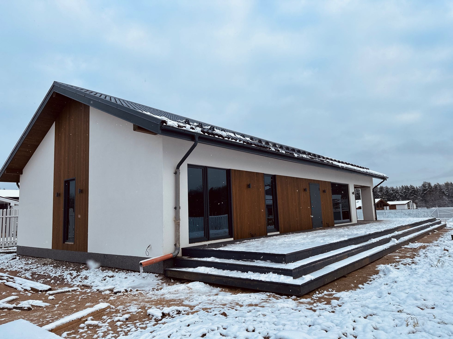 Терасса — покрыта лиственницей (вельвет), так же ошлифована и покрашена на производстве в цвет кровли и окон RAL 7024. Часть террасы располагается на плите 300 мм для последующей возможности создания всезенной террасы с остеклением и утеплением.