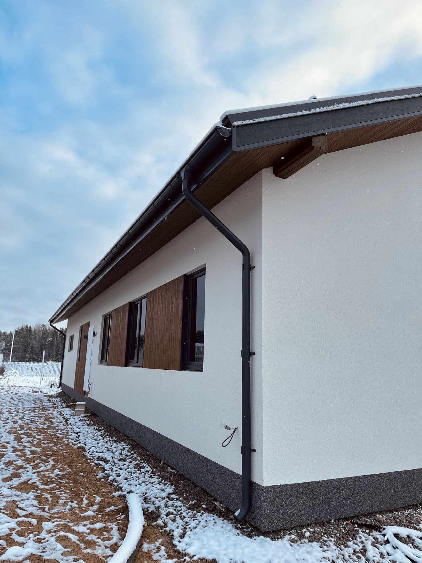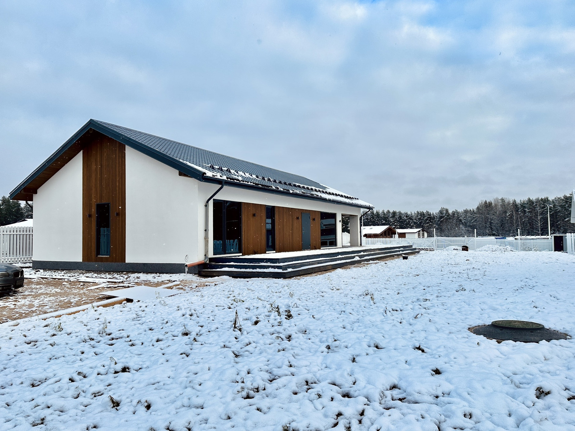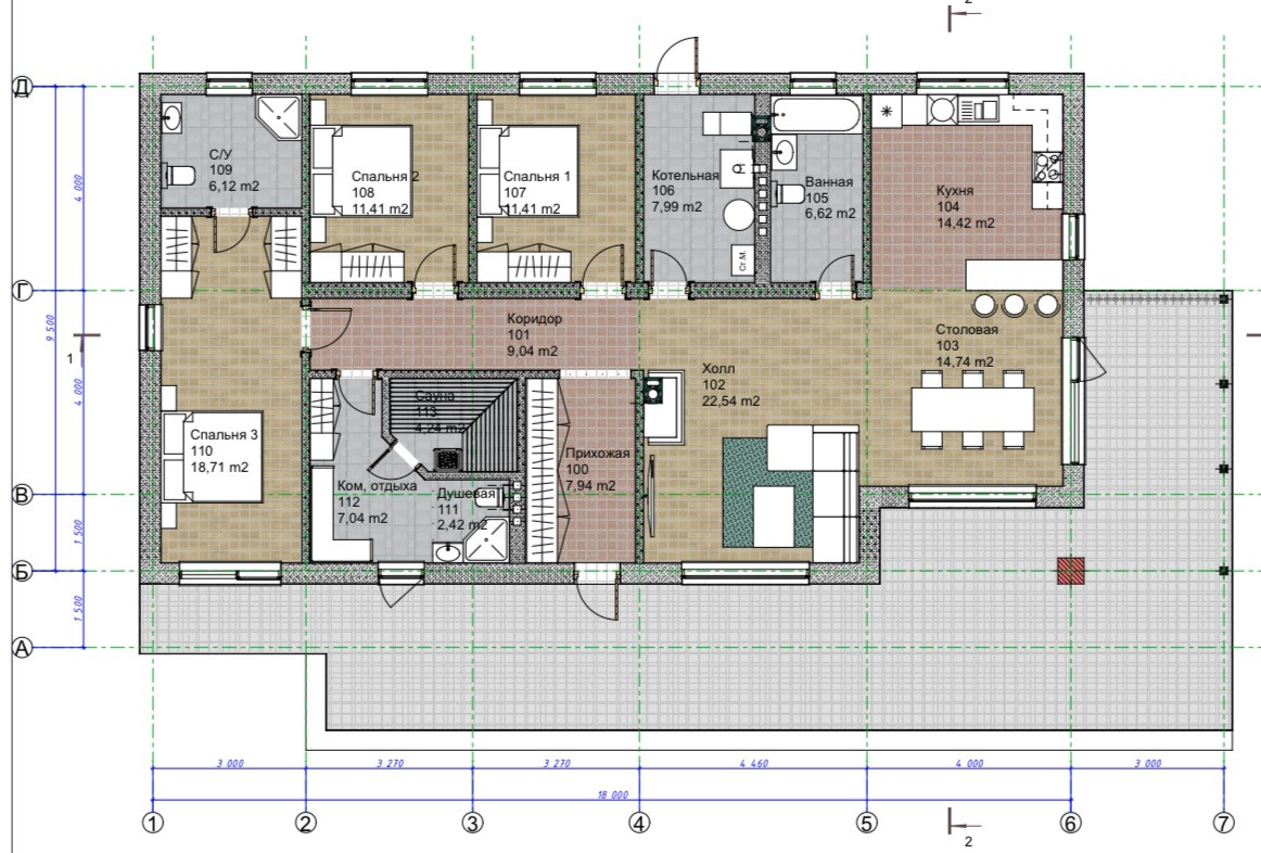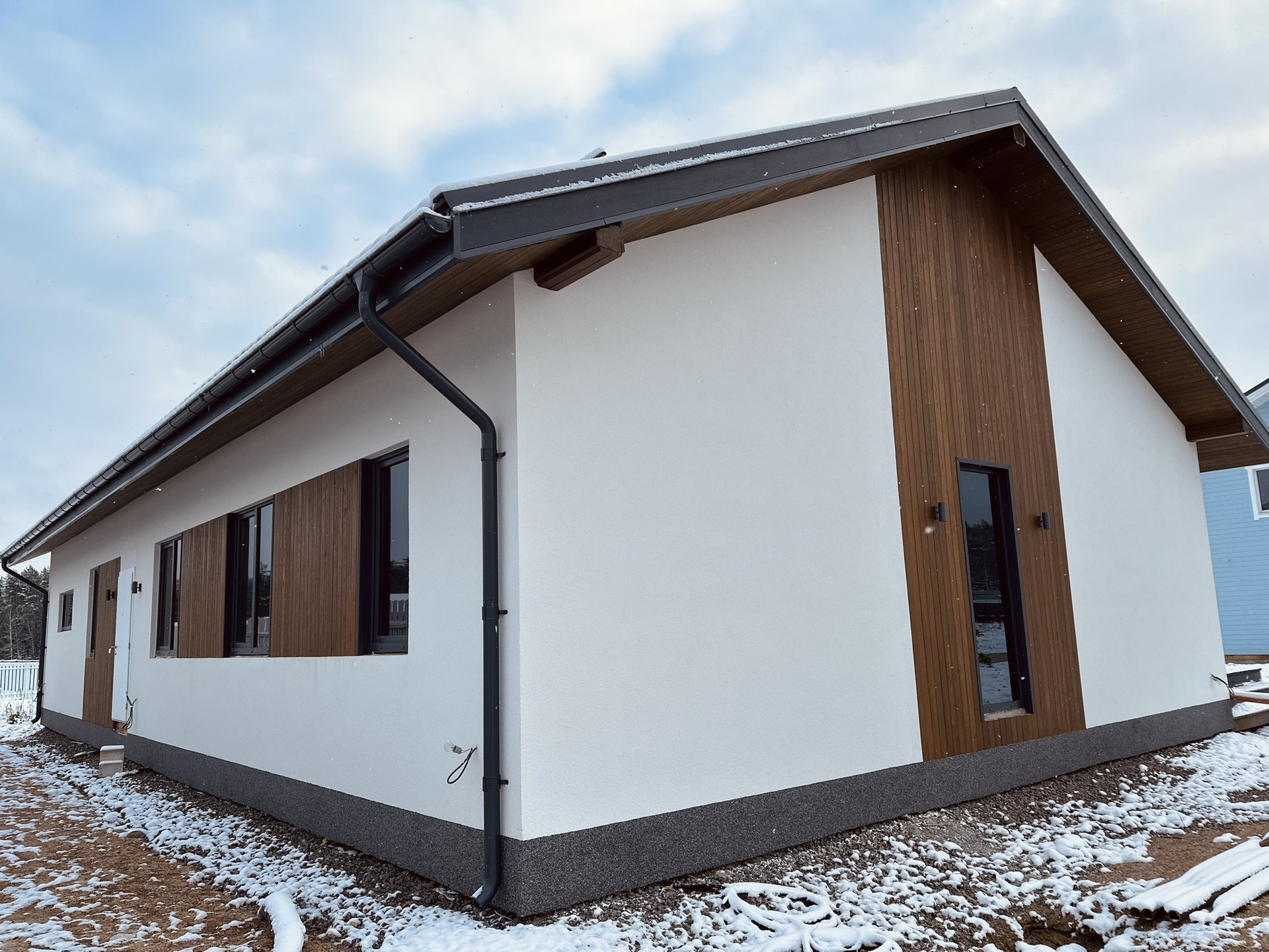 Терасса — покрыта лиственницей (вельвет), так же ошлифована и покрашена на производстве в цвет кровли и окон RAL 7024. Часть террасы располагается на плите 300 мм для последующей возможности создания всезенной террасы с остеклением и утеплением.