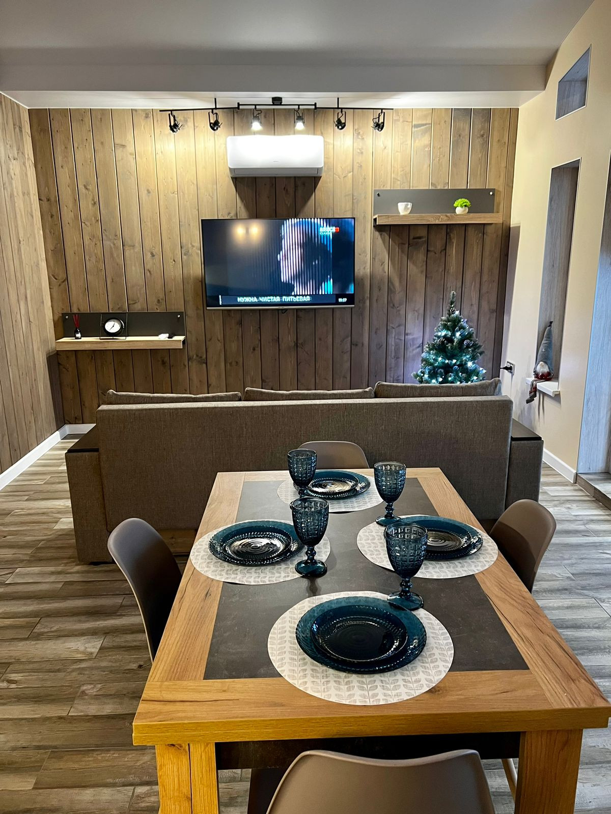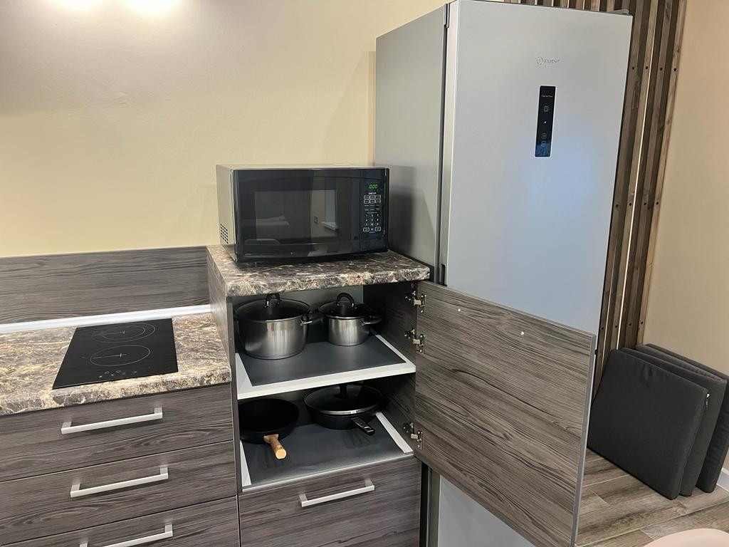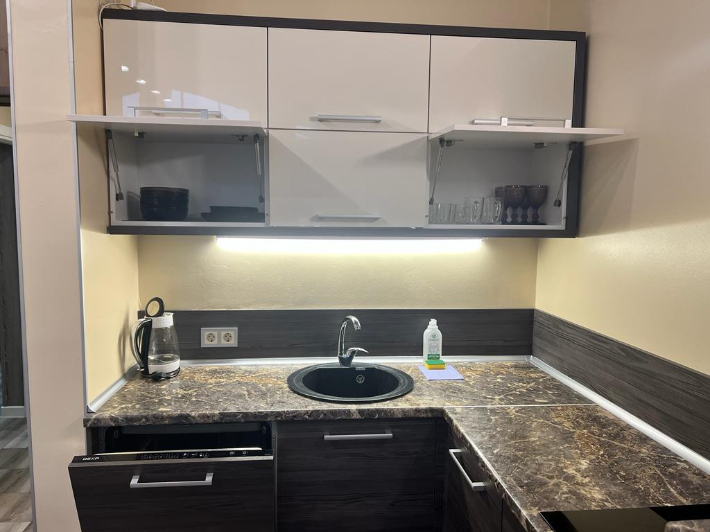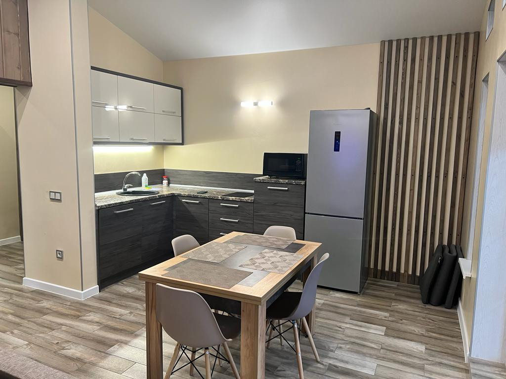 Кухня оборудована всей необходимой техникой (варочная панель, посудомоечная машина ,холодильник, чайник, микроволновая печь).Посуда, столовые приборы в наличии.