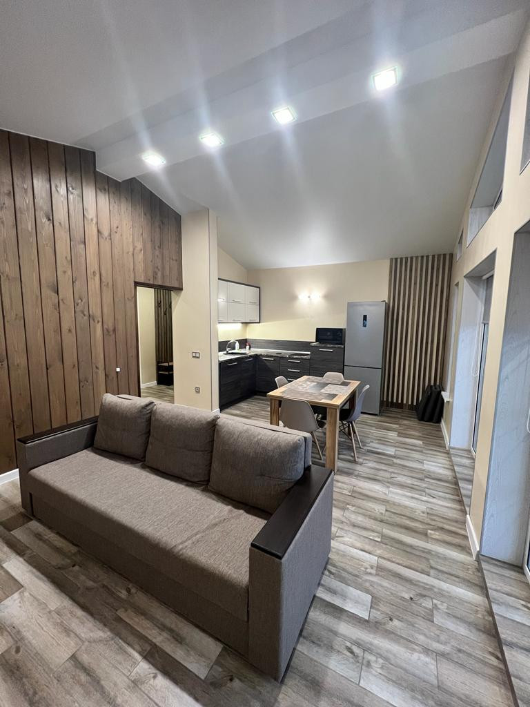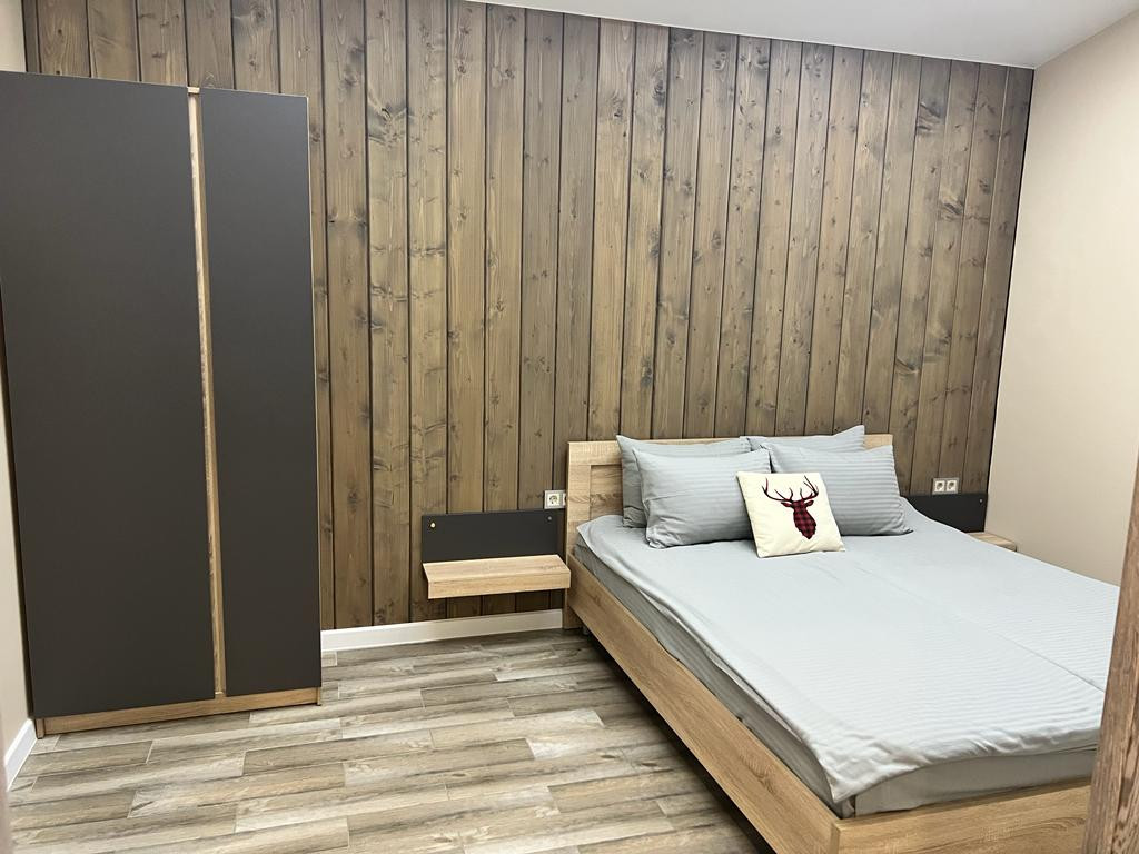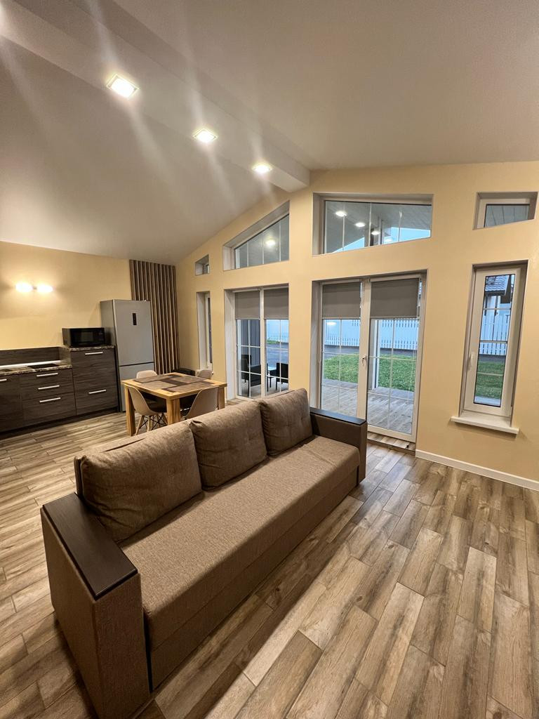 Просторная кухня-гостиная ( в гостиной раскладной диван), одна спальня (двуспальняя кровать 160х200), ванная комната, веранда (на веранде садовая мебель).