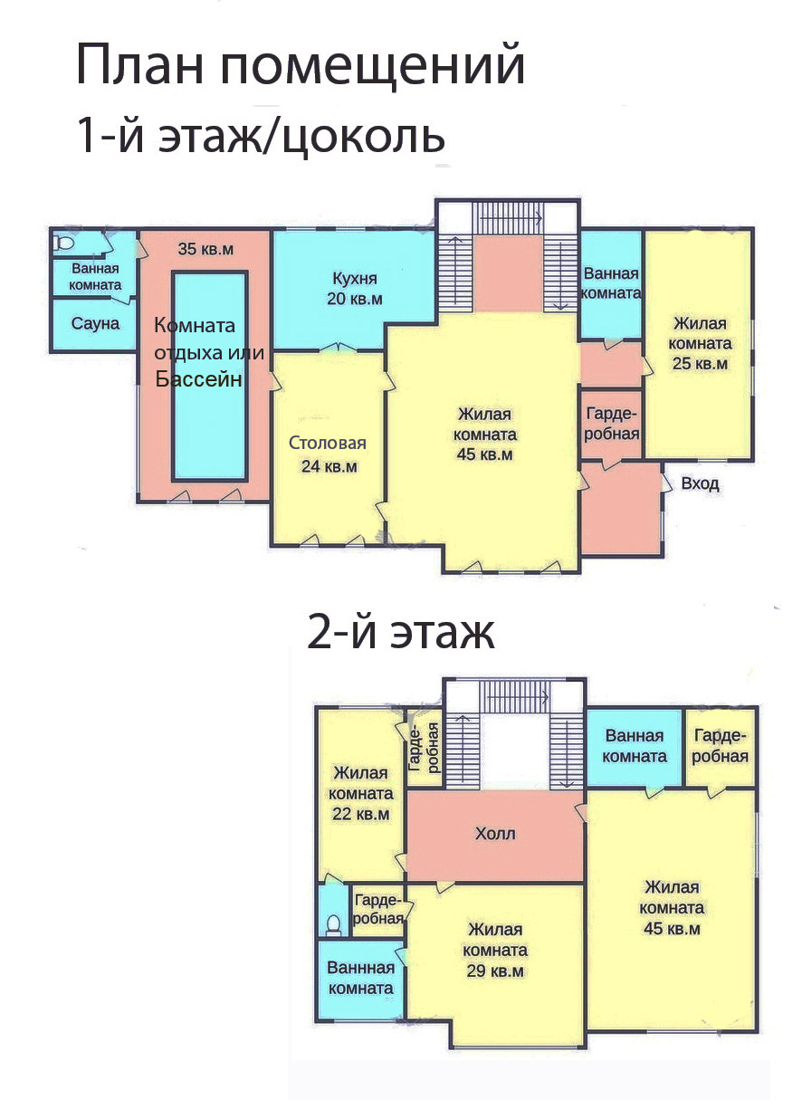 1-й этаж гостиная, каминный зал, столовая, кухня, кабинет/спальня, с/у, сауна, комната отдыха (возможен бассейн)
