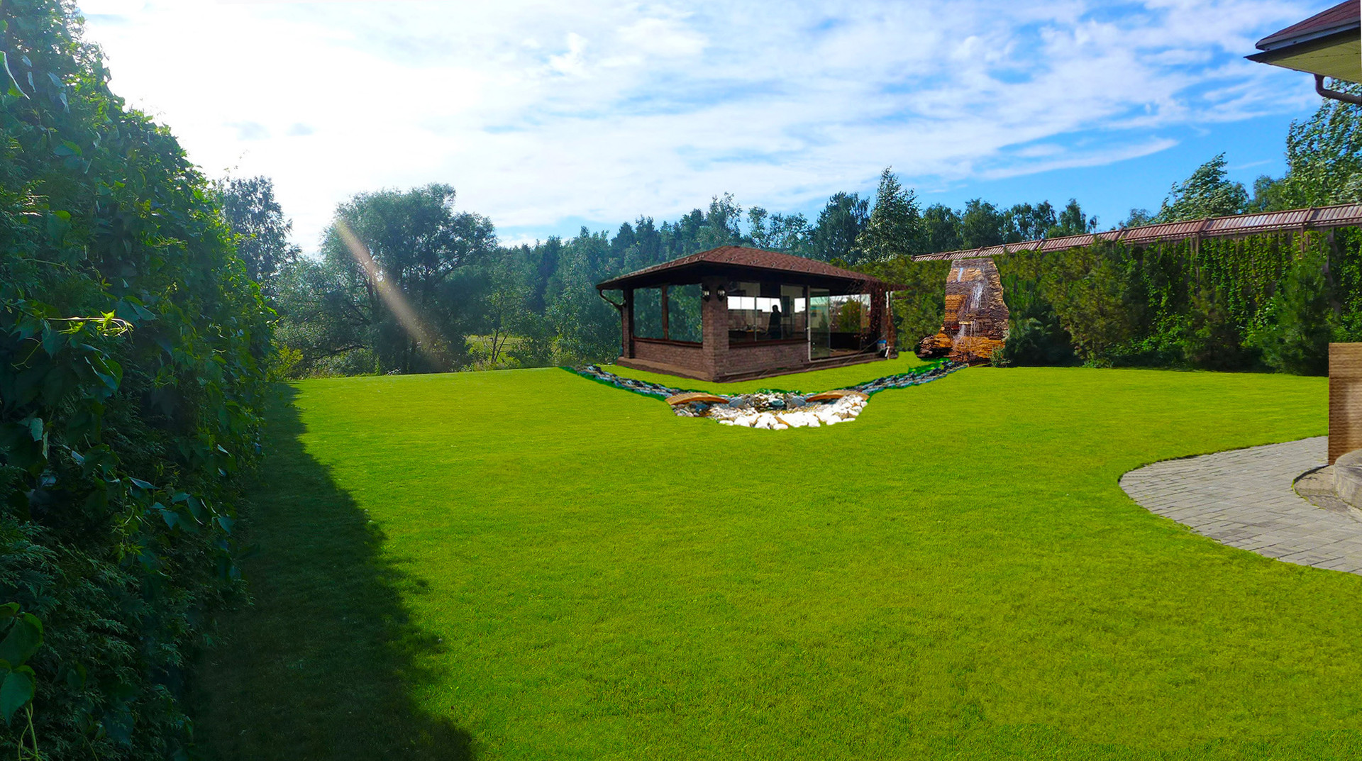 Участок: площадь около 23 соток, плоский, на горке. Речка вдоль участка позволяет выполнить интересный ландшафтный дизайн с прудами, ручьями, переливами, водопадами и пр.